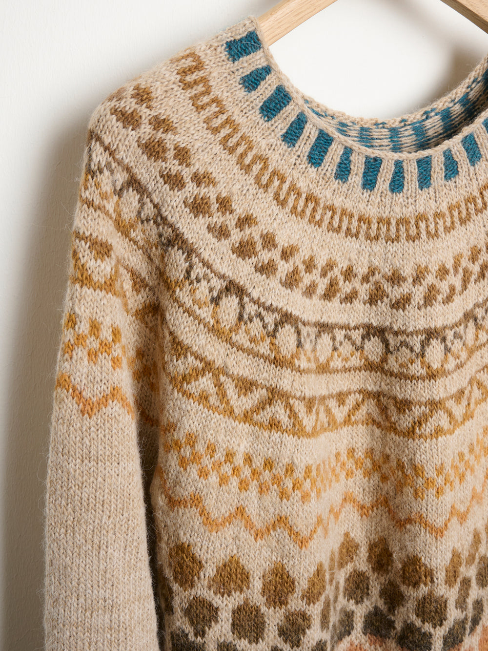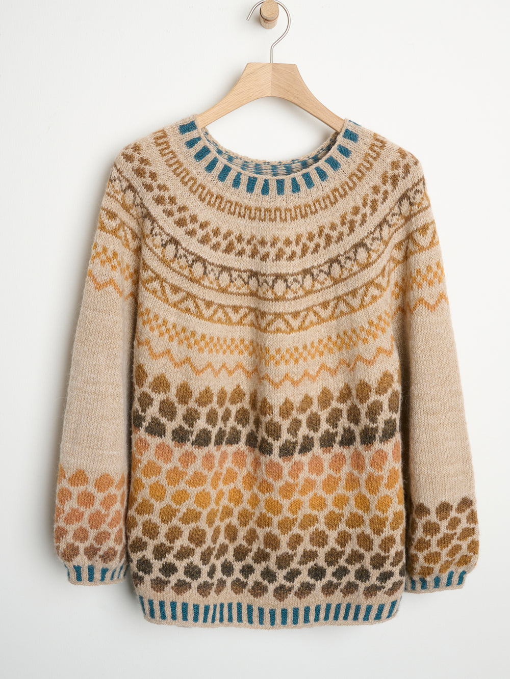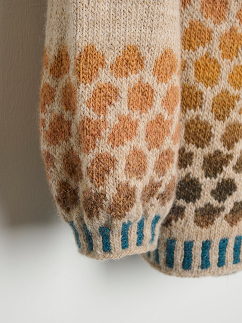 Guffen er samme model og mønster som Giffen. Forskellen ligger i, at Giffen er strikket med en farveskiftgarn som bundfarve og på Guffen er det mønstret, der er strikket i farveskiftgarn.