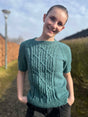 Den er strikket i meget let og luftig garn, som fremhæver det flotte mønster på forstykket og ærmerne.