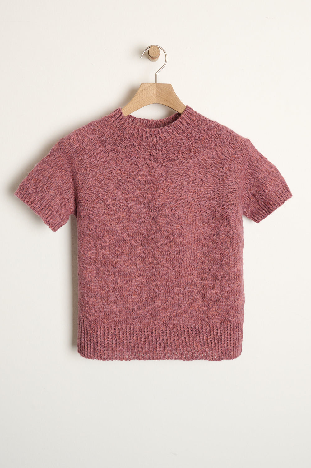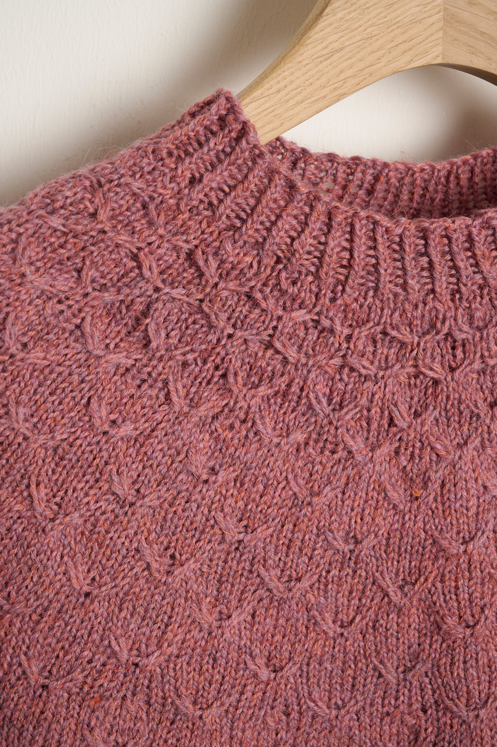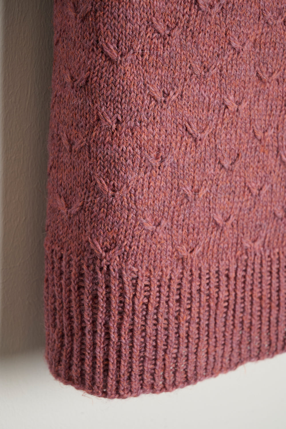 Birdie Athena har et pænt lille mønster, som ligner fugle. Modellen er meget nem at strikke, og man lærer hurtigt det fine mønster. Modellen er strikket nedefra med rundt bærestykke.