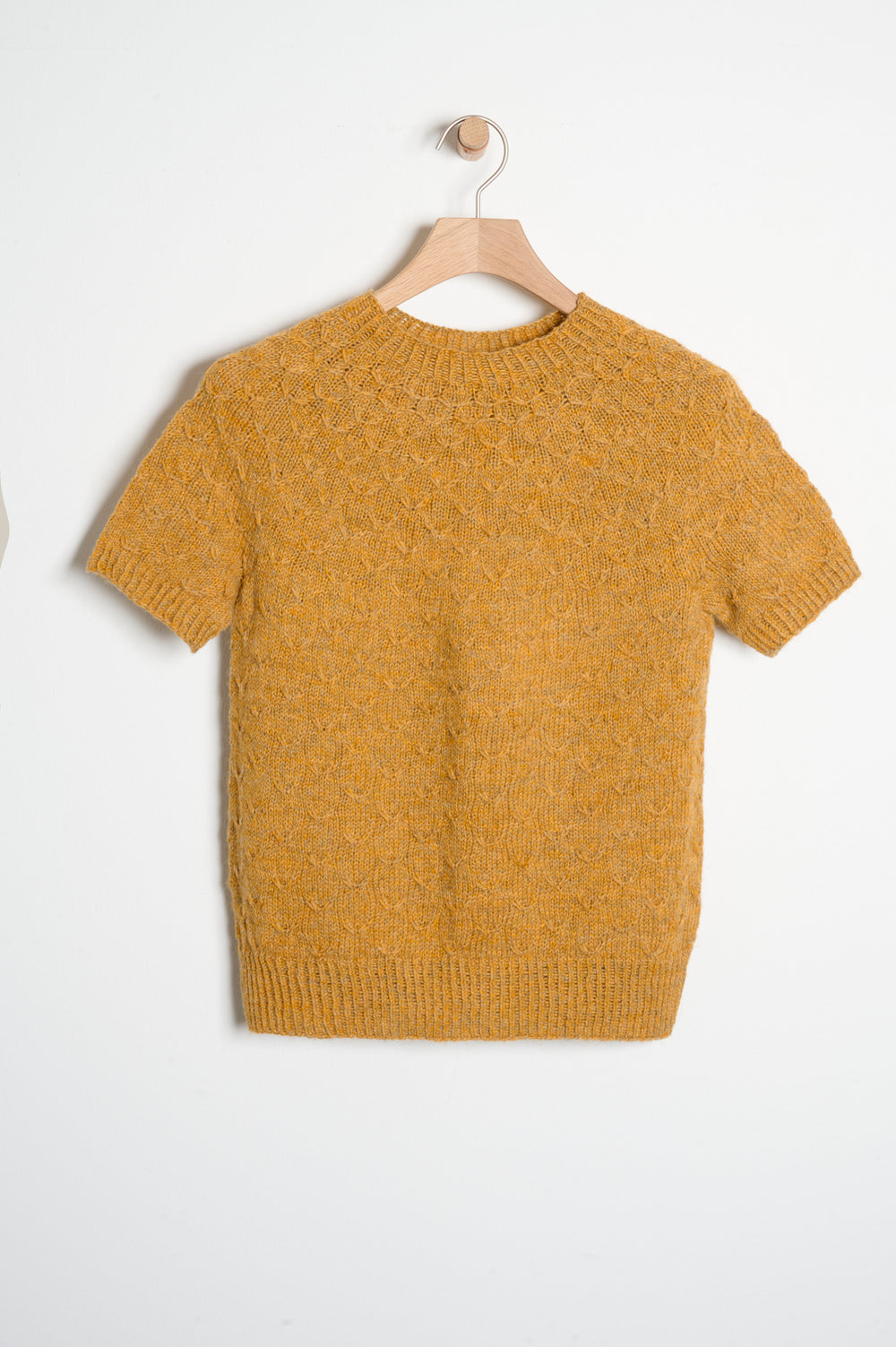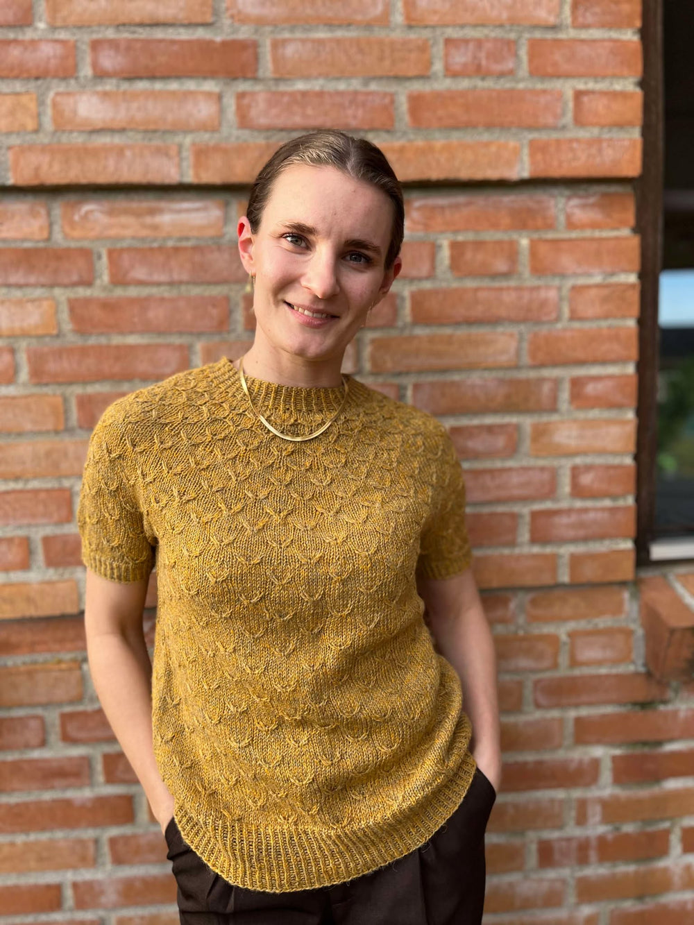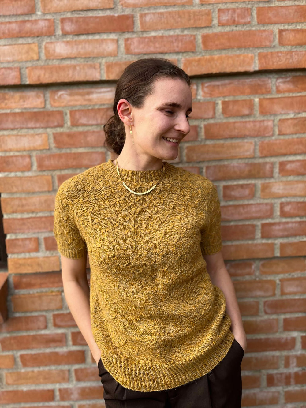 Birdie Athena har et pænt lille mønster, som ligner fugle. Modellen er meget nem at strikke, og man lærer hurtigt det fine mønster. Modellen er strikket nedefra med rundt bærestykke.