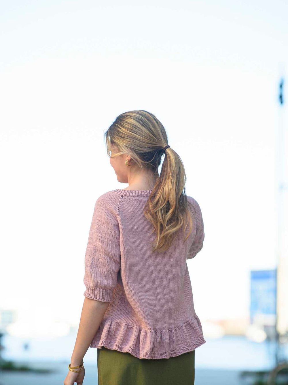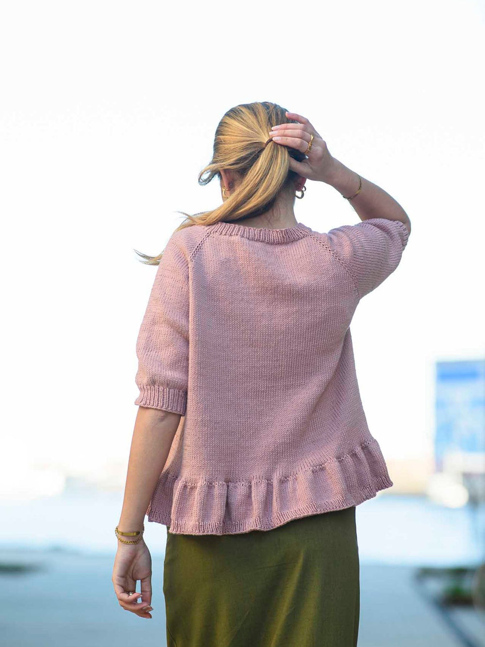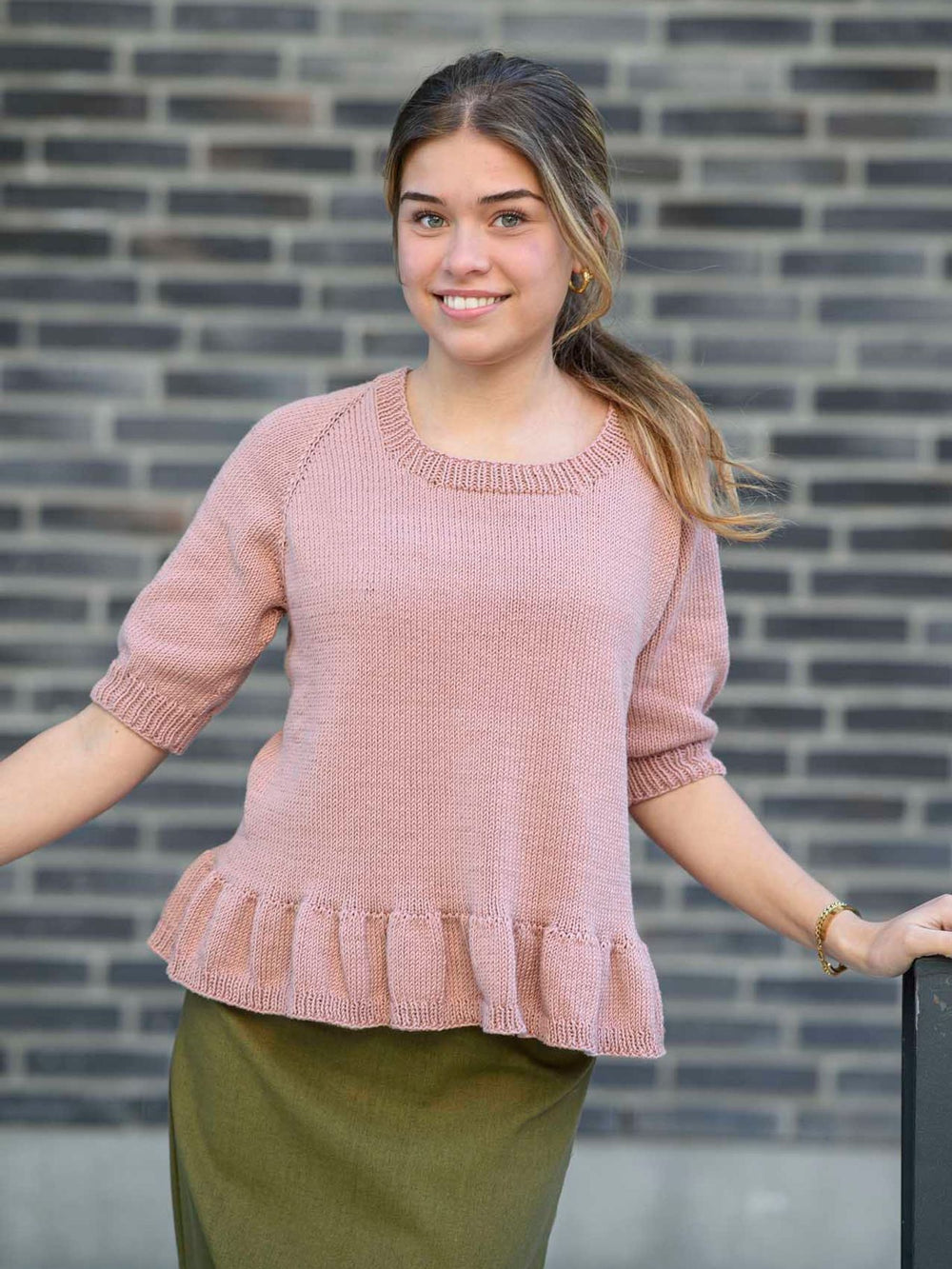 Dolly tee strikkes oppefra og ned i glatstrik med raglanudtagninger i bærestykket. Alle kanter afsluttes i rib.