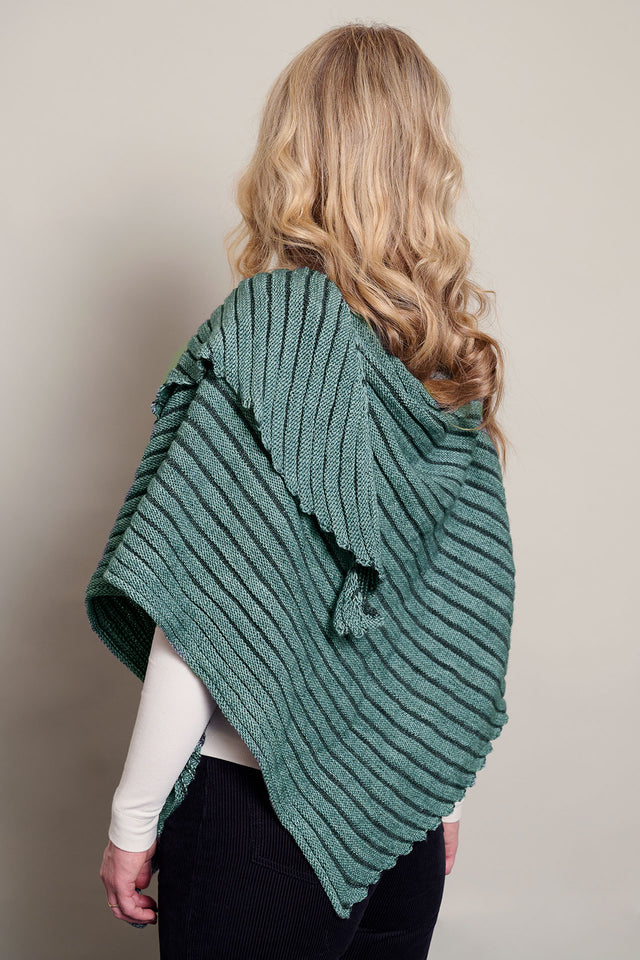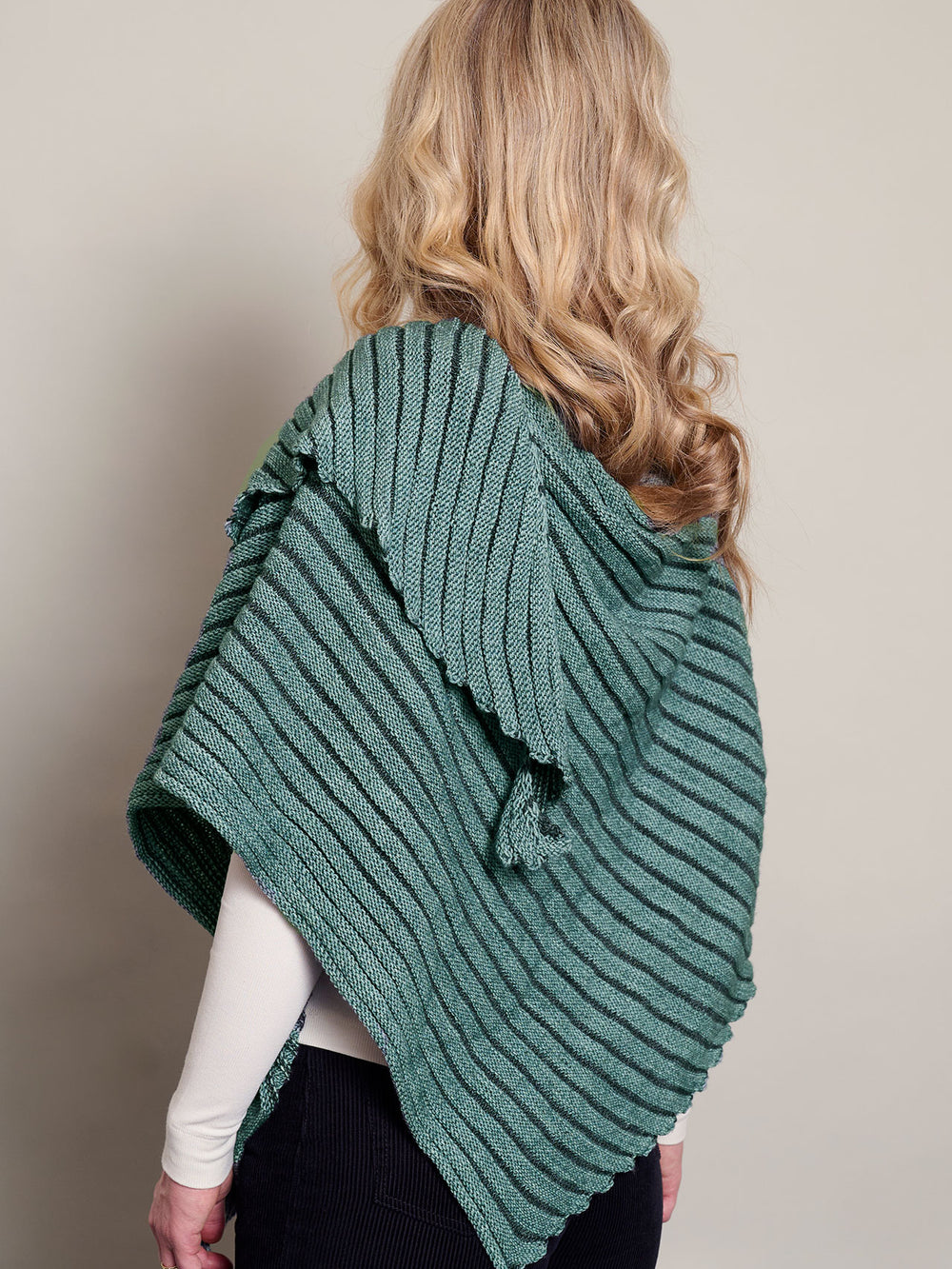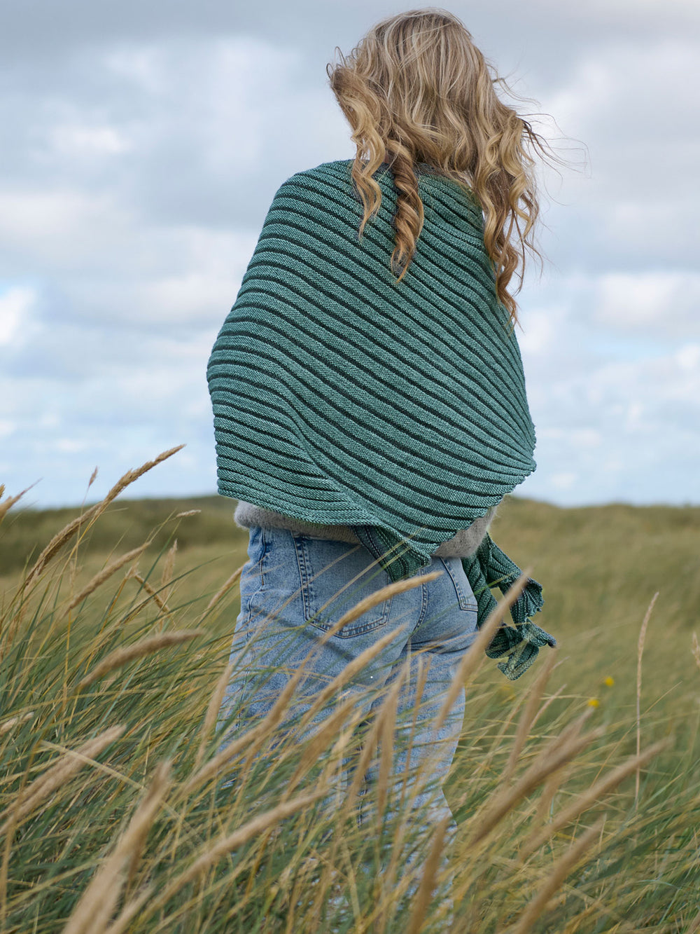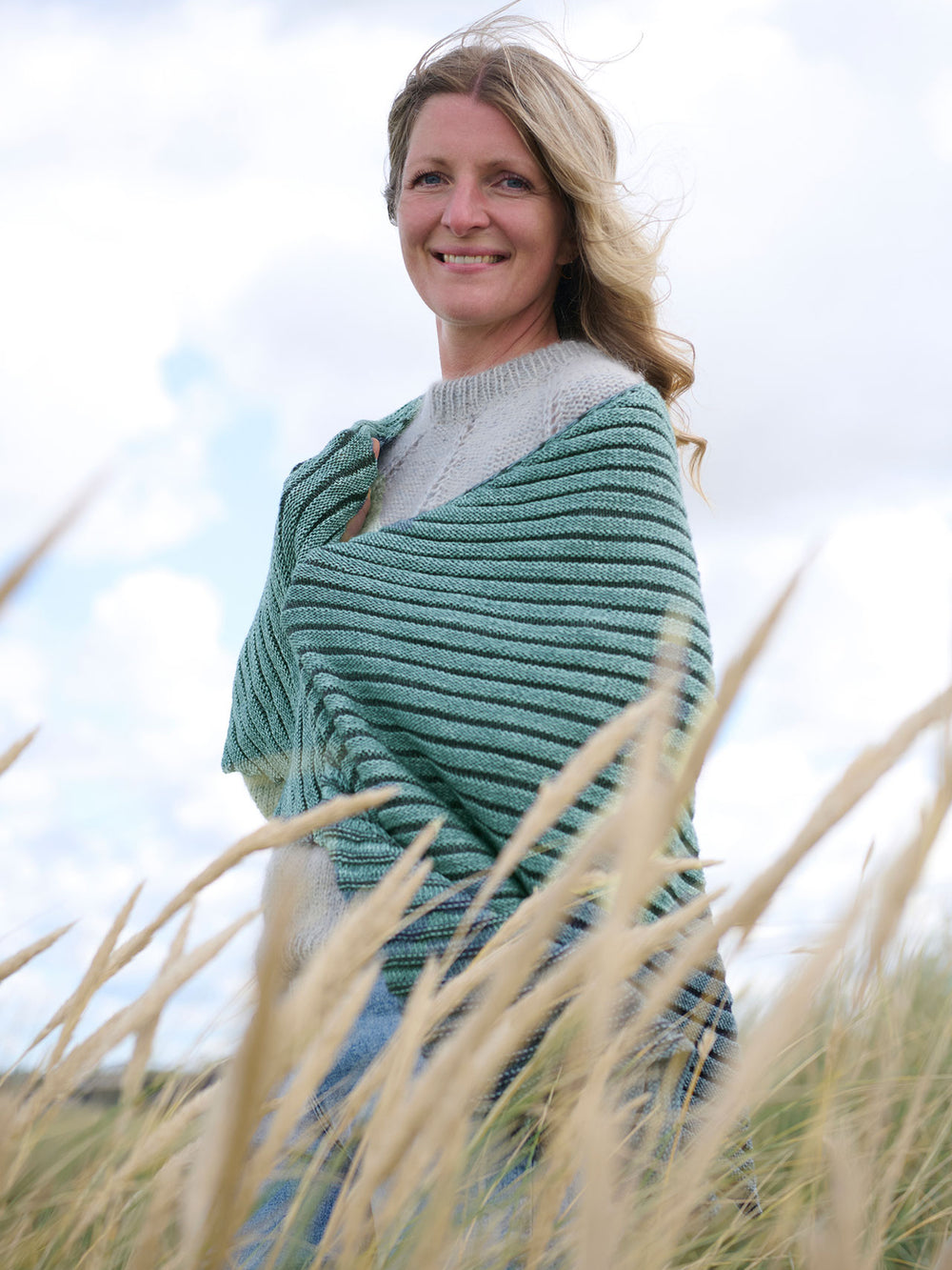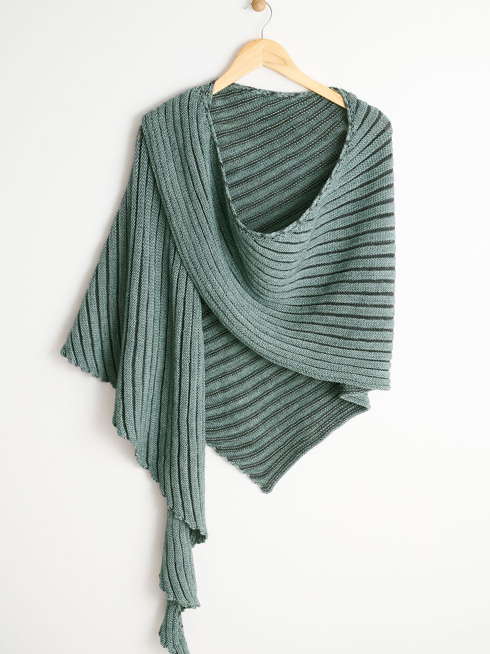 Sjalet strikkes i striber fra den ene spids og ud.