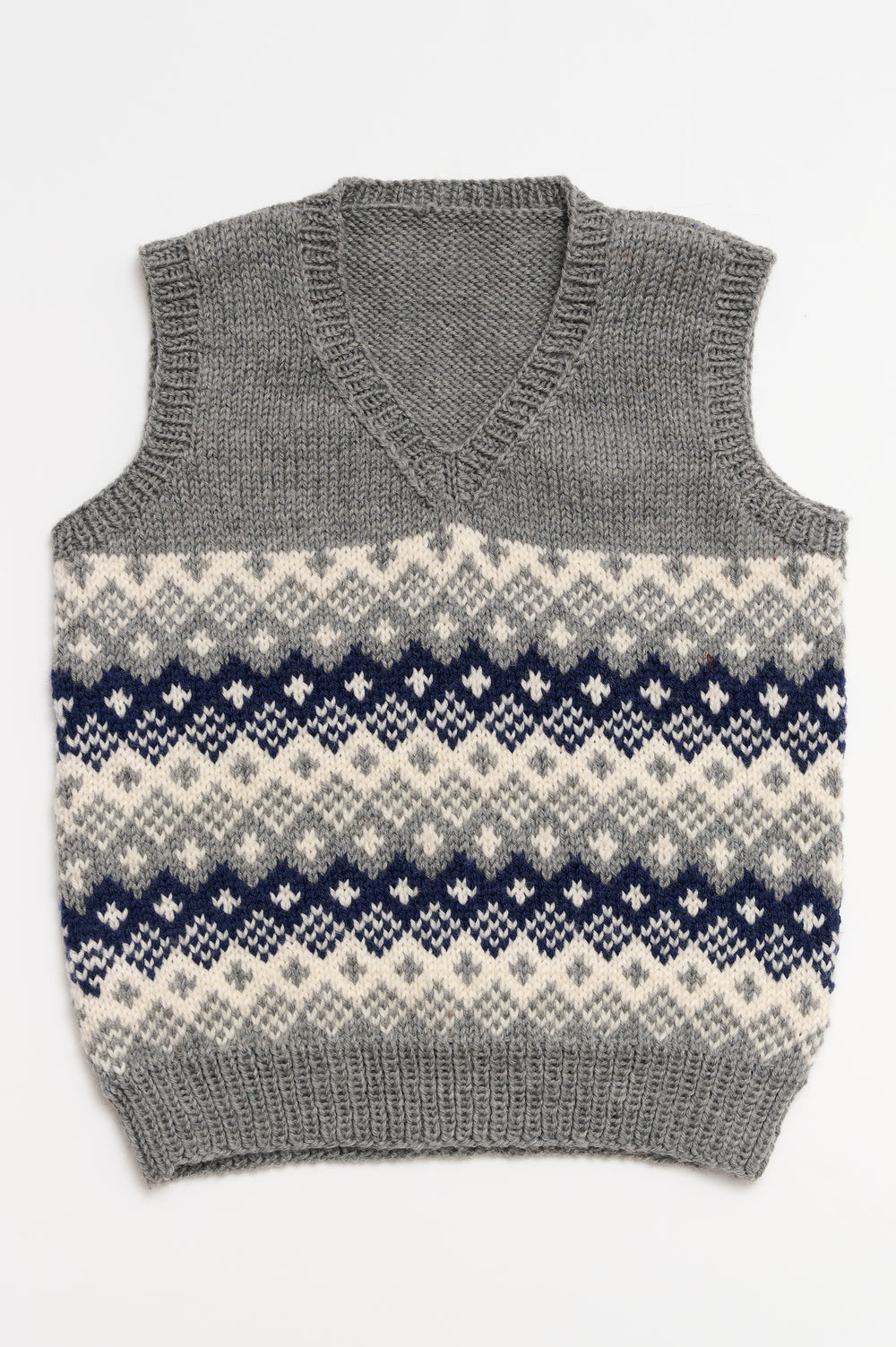 Ved denne børnevest er det helt klart mønsteret på for- og bagstykke, der løber med al opmærksomheden. Det flotte fair isle mønster består af tre forskellige farver, som sammen danner et fantastisk mønster fra ærmegabene og ned til den brede ribkant, som danner en flot afslutning på vesten. Rundt langs ærmegabene er der ligeledes en smal rib, og vesten har en flot og markeret v-hals.