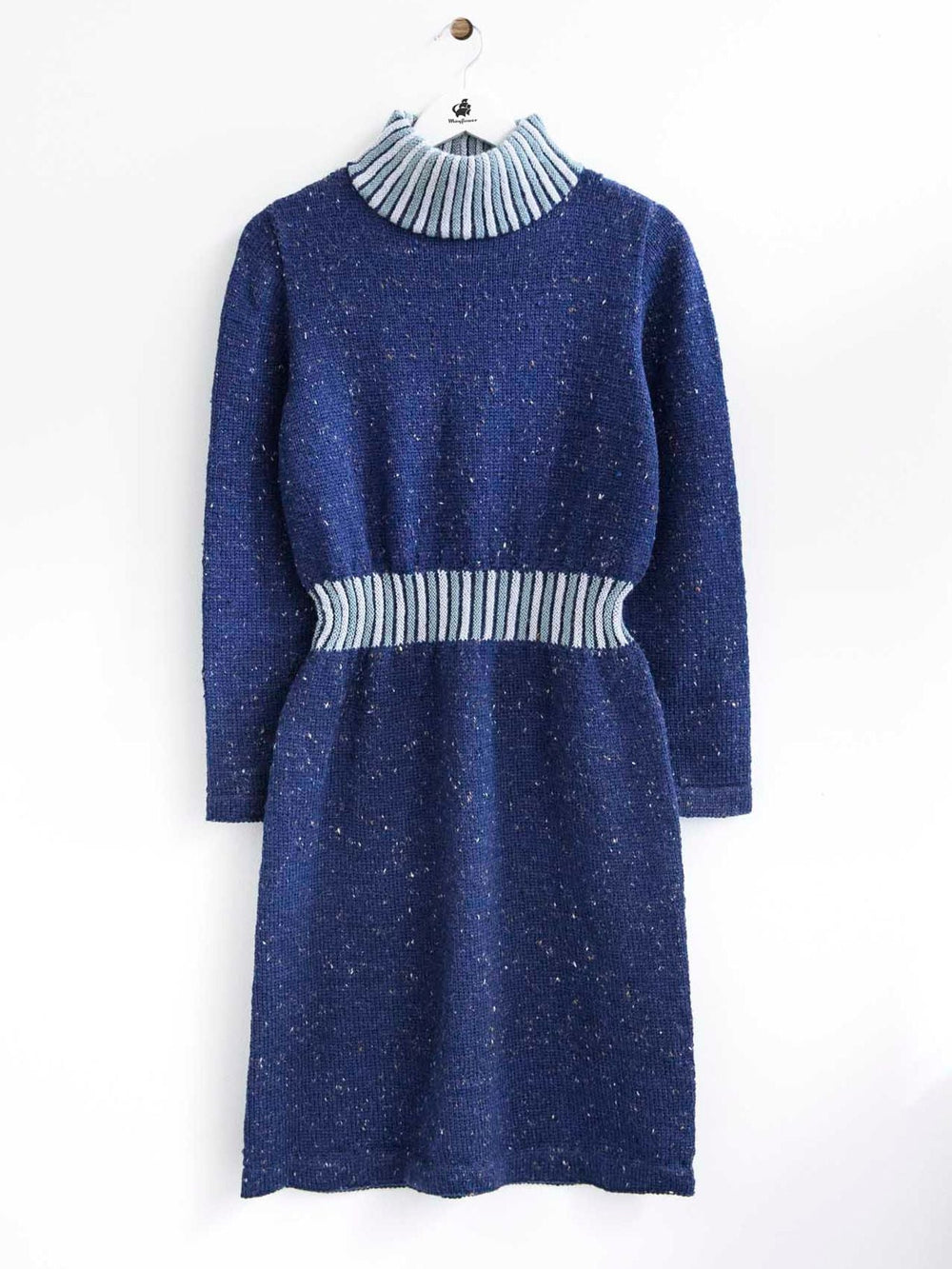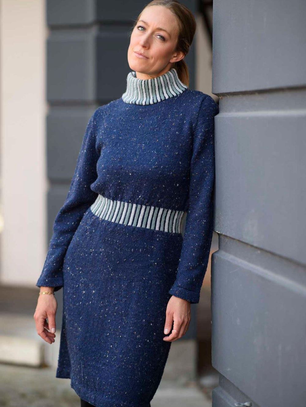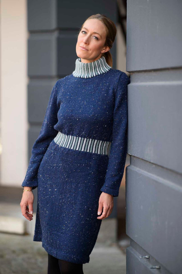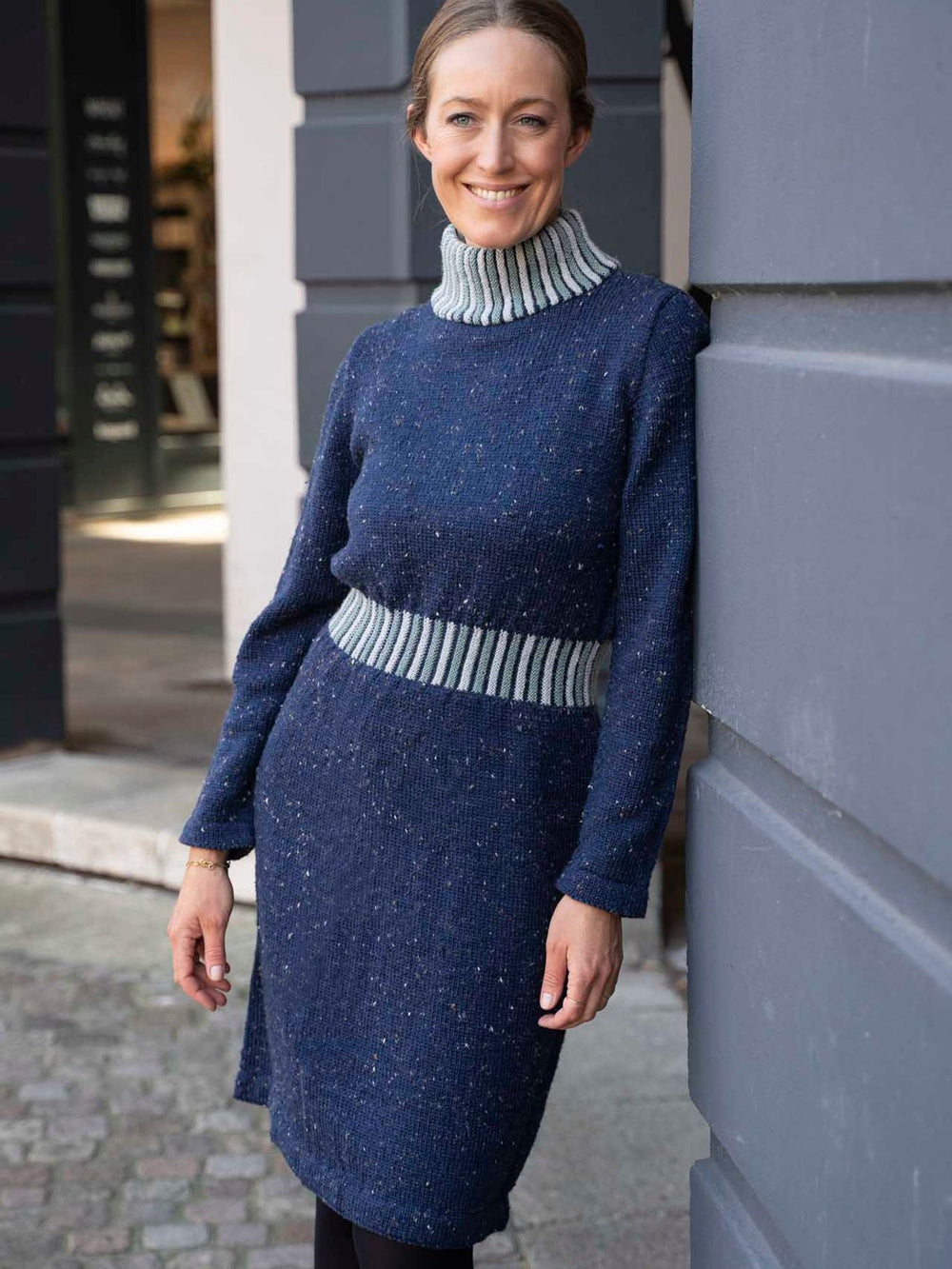 Edna Kjolen har et stribet taljestykke, som får kjolen til at sætte sig flot om livet, og den høje krave er strikket med de samme striber. Den stribede effekt opnås ved at strikke på tværs.