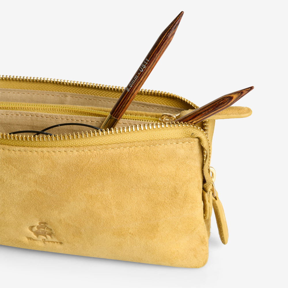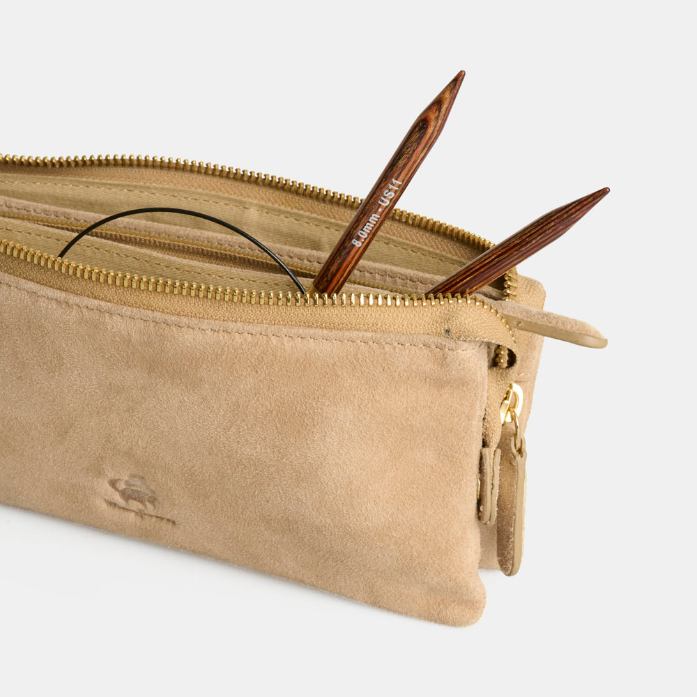 Etuiet åbnes med en gylden lynlås, og indeni tasken er to større rum med en mindre lynlåslomme i midten. Etuiet er derfor oplagt at bruge til fx udskiftelige rundpinde, saks, målebånd osv., mens mindre ting som maskemarkører, uldnåle og wirer med fordel kan placeres i det mindste rum.