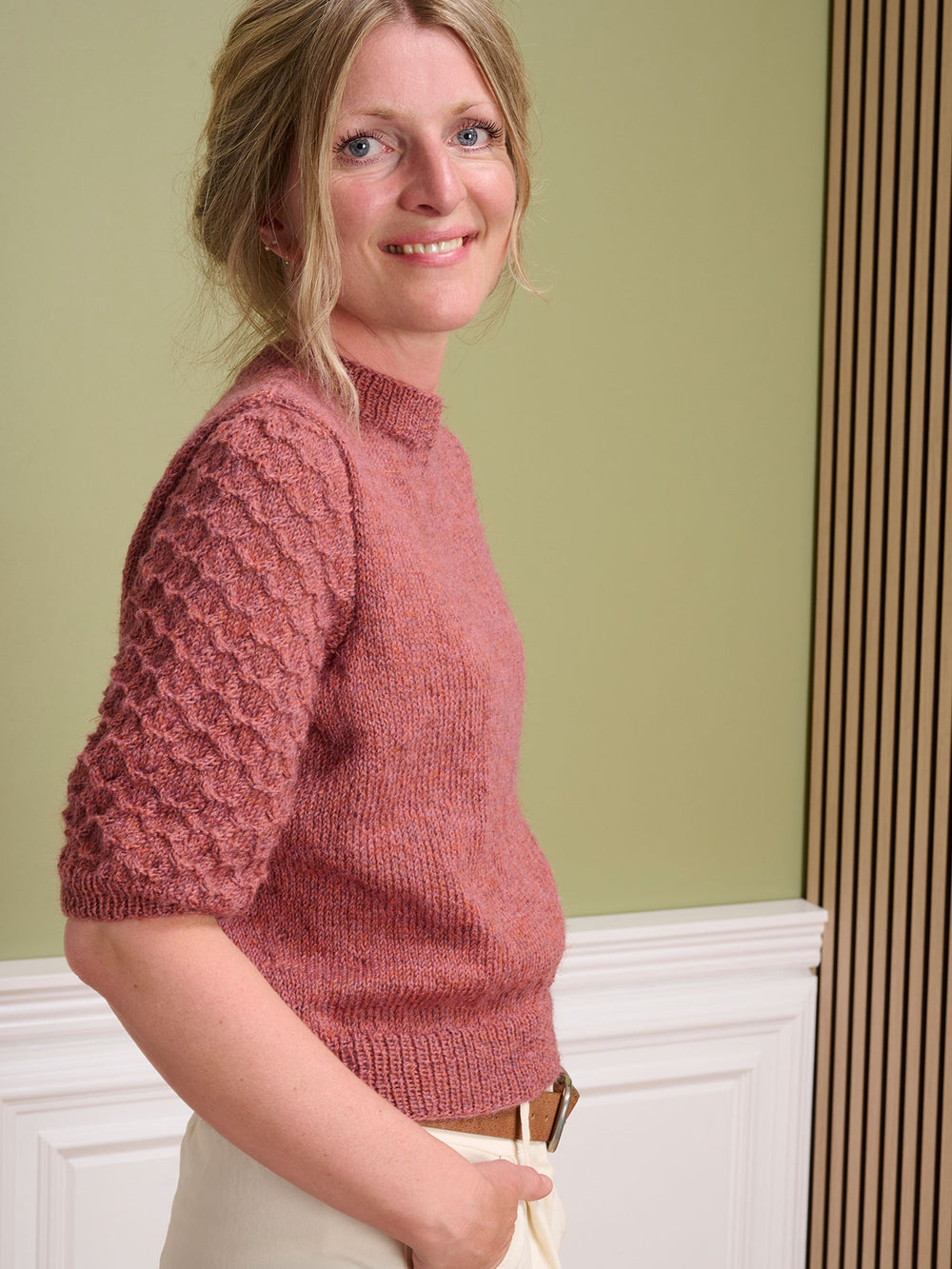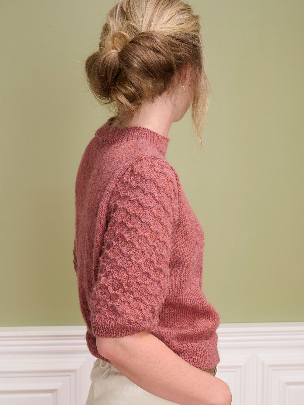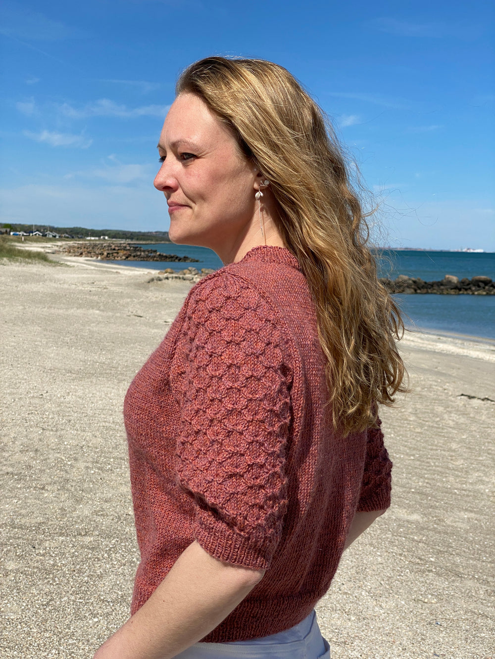 Bluse med flotte ærmer, der er strikket med en simpel snoningsteknik. Blusens krop er strikket i glatstrik, for at give ærmerne fokus. Ærmerne er monteret så der gives en smule ekstra vidde i skuldrene.