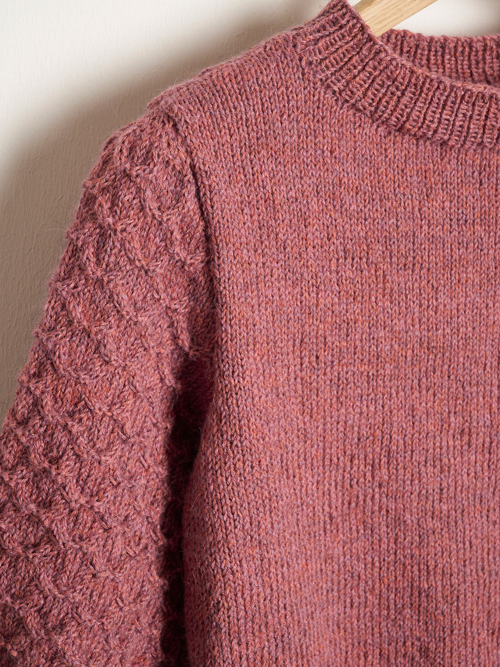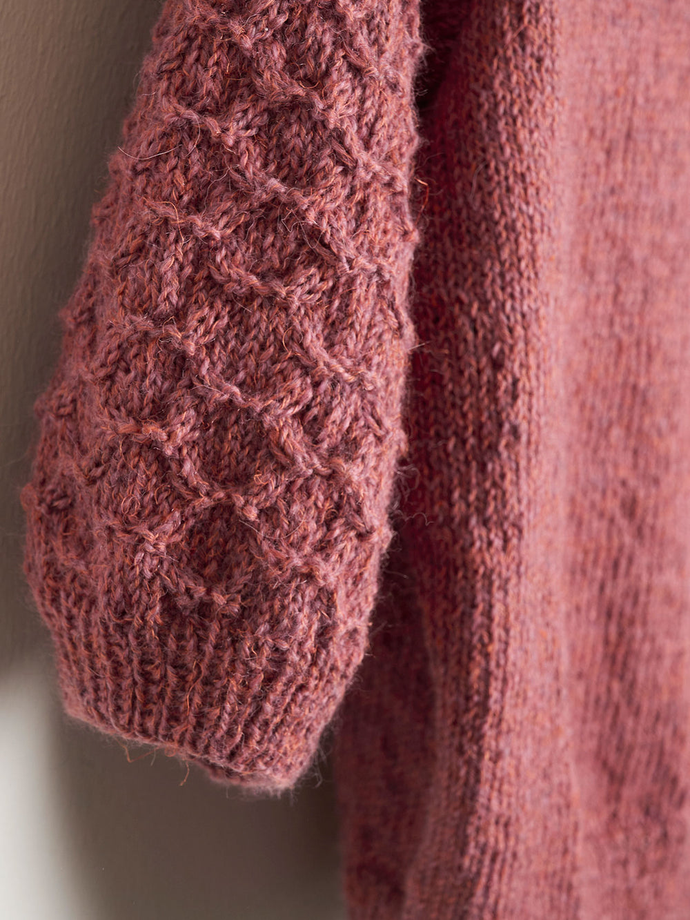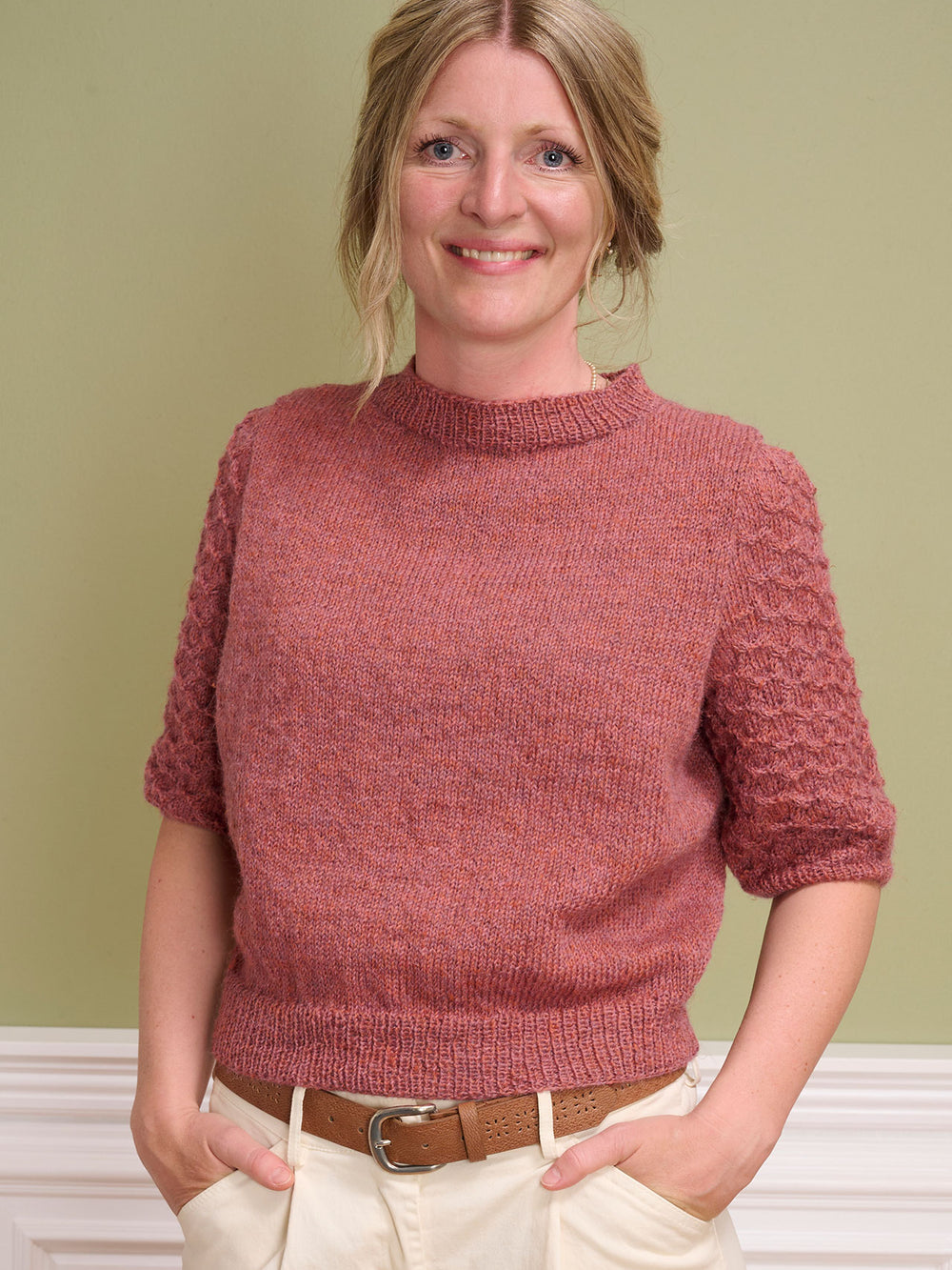 Bluse med flotte ærmer, der er strikket med en simpel snoningsteknik. Blusens krop er strikket i glatstrik, for at give ærmerne fokus. Ærmerne er monteret så der gives en smule ekstra vidde i skuldrene.