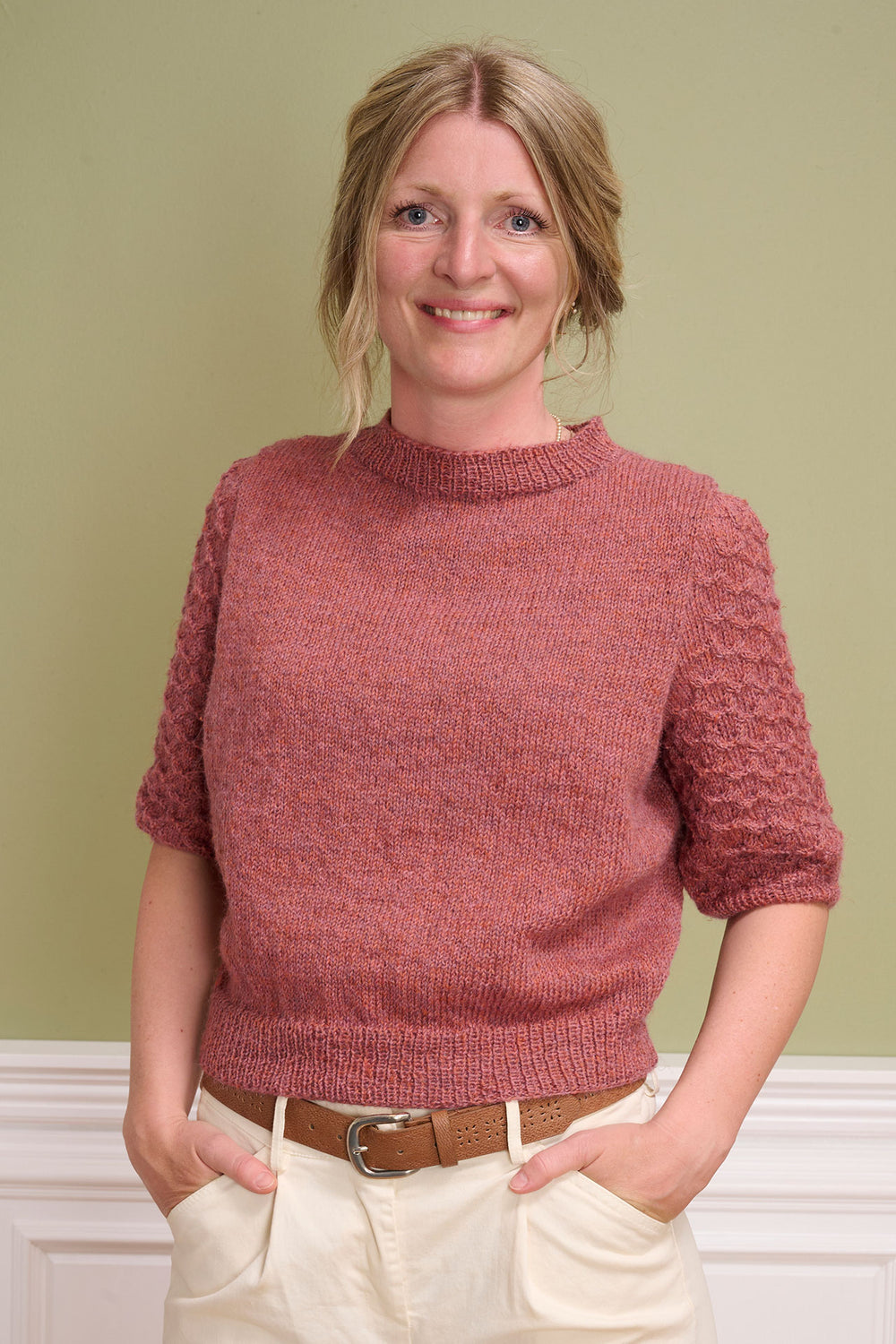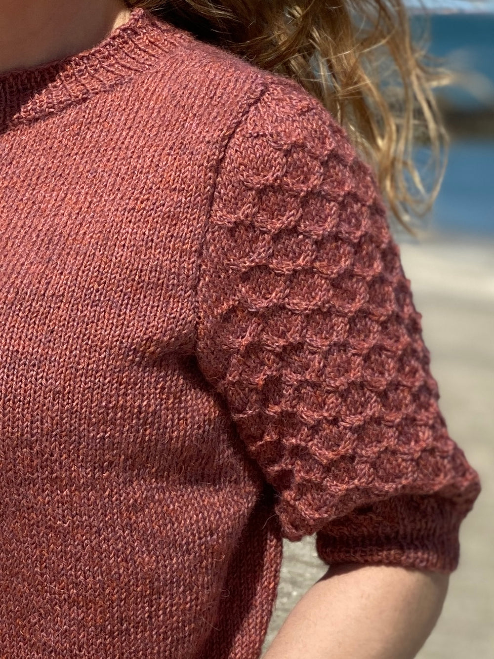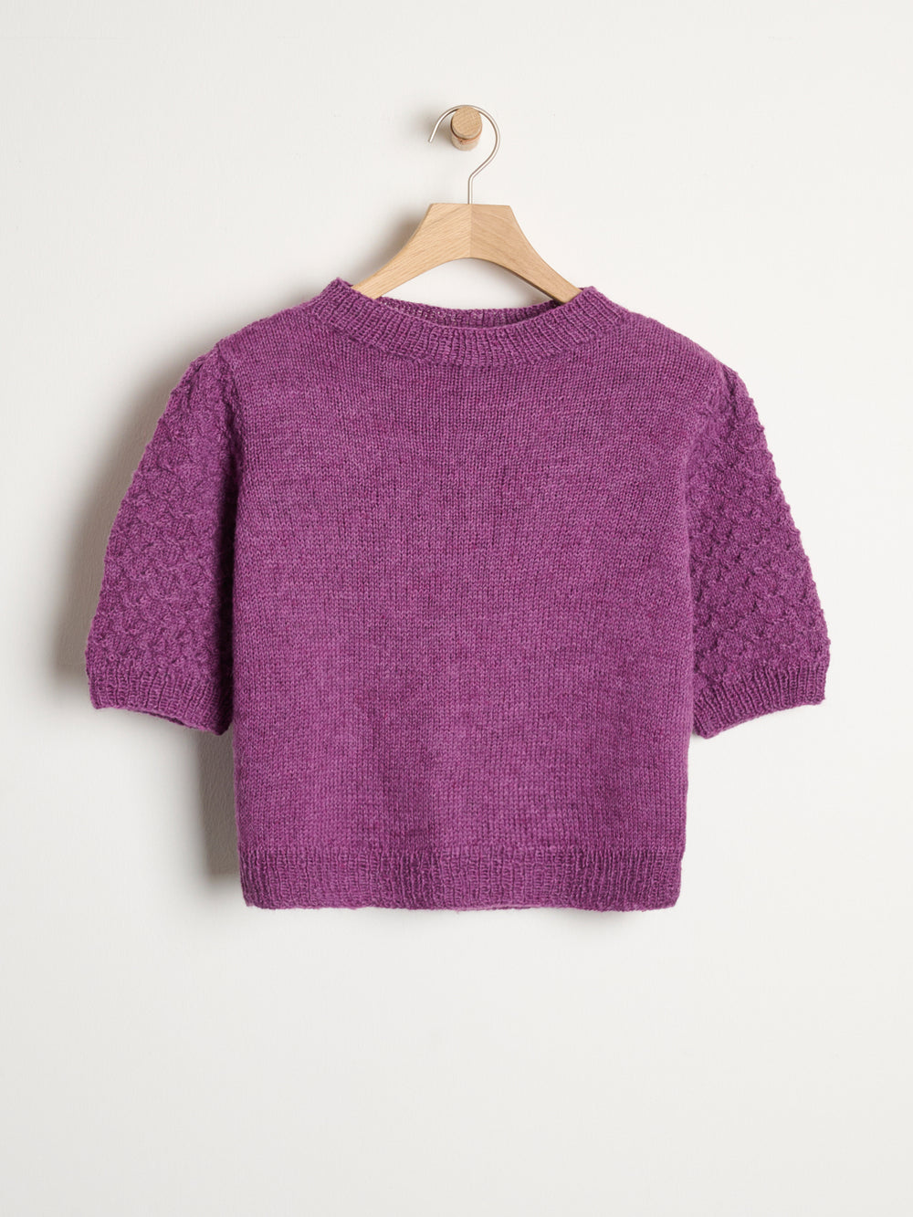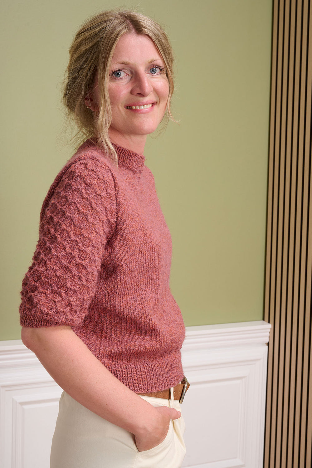 Bluse med flotte ærmer, der er strikket med en simpel snoningsteknik. Blusens krop er strikket i glatstrik, for at give ærmerne fokus. Ærmerne er monteret så der gives en smule ekstra vidde i skuldrene.