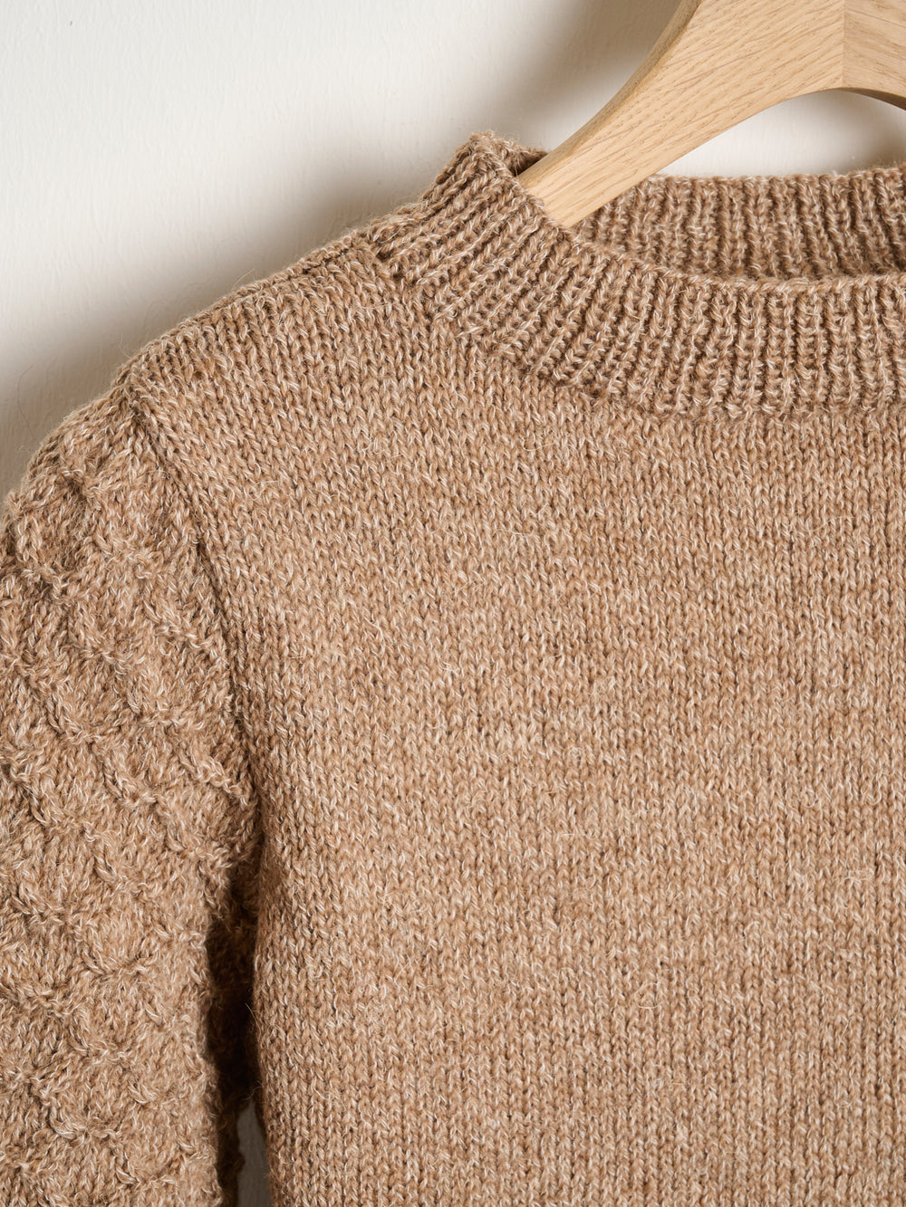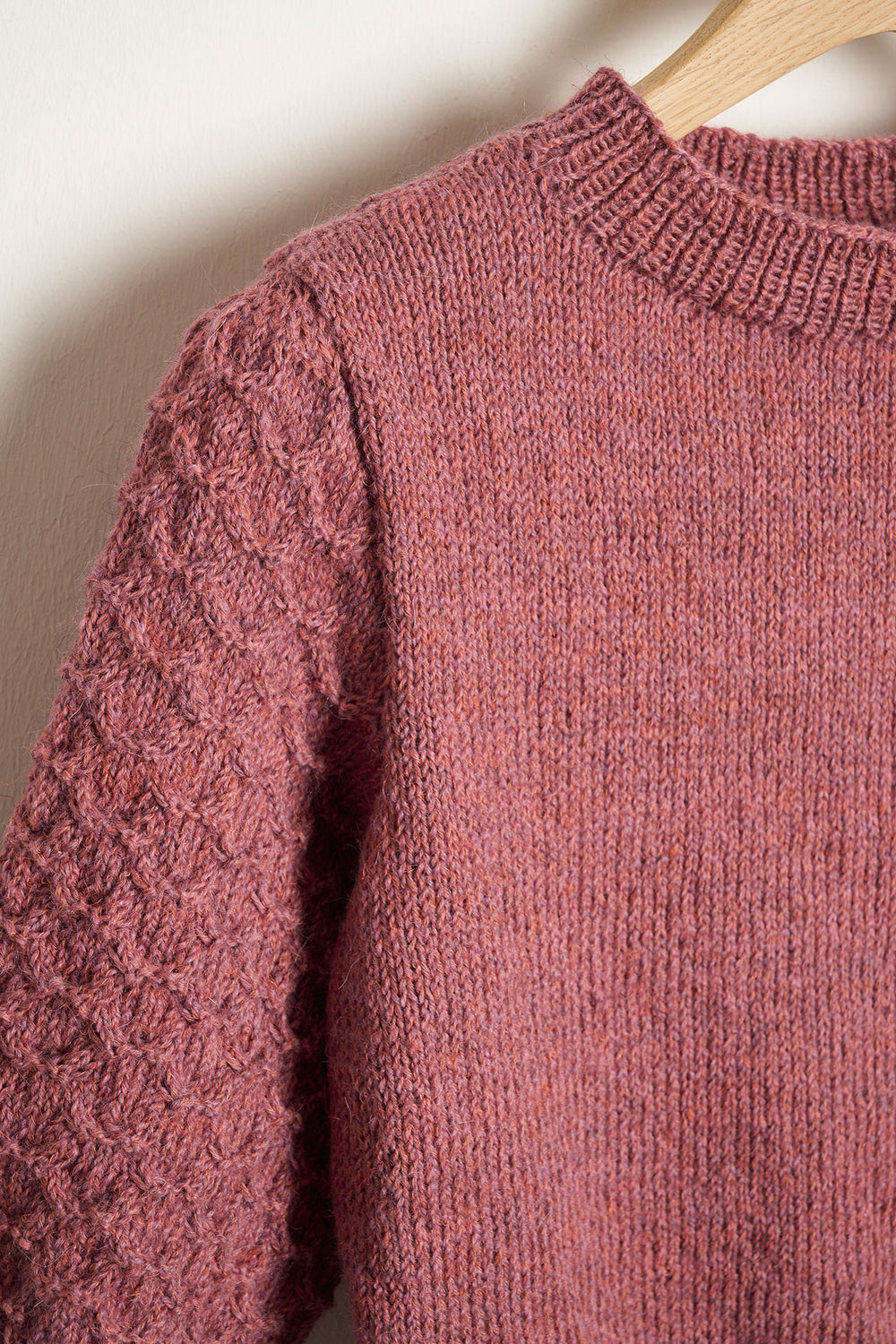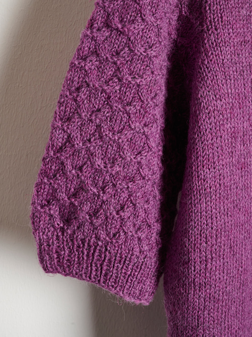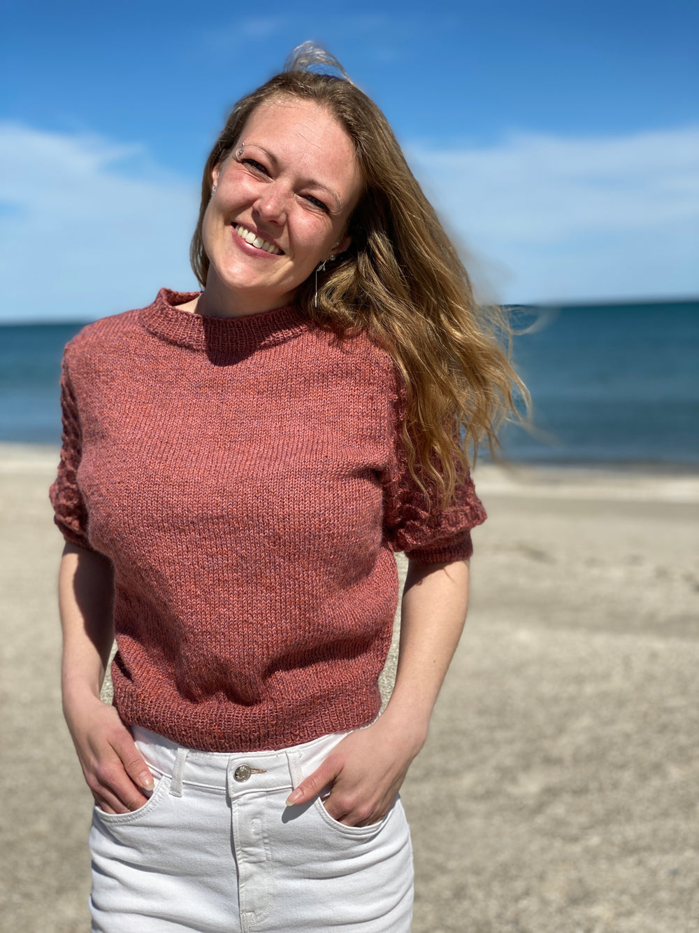 Bluse med flotte ærmer, der er strikket med en simpel snoningsteknik. Blusens krop er strikket i glatstrik, for at give ærmerne fokus. Ærmerne er monteret så der gives en smule ekstra vidde i skuldrene.