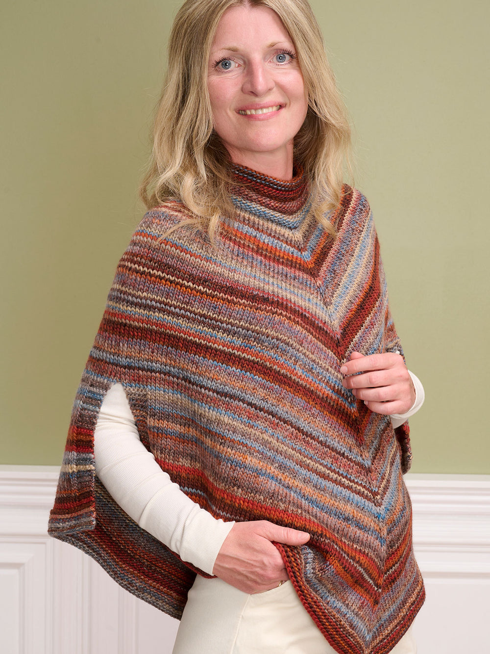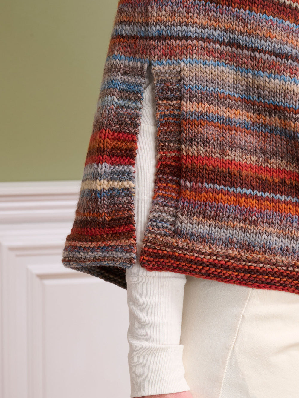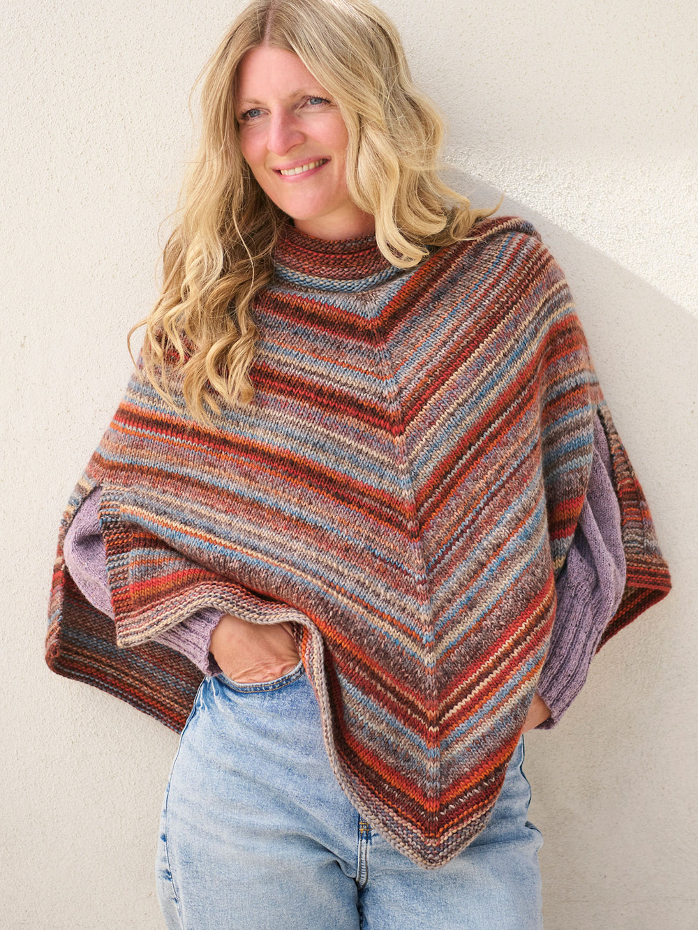 Ponchoen strikkes oppefra og ned og har slidser i begge sider ved armene.