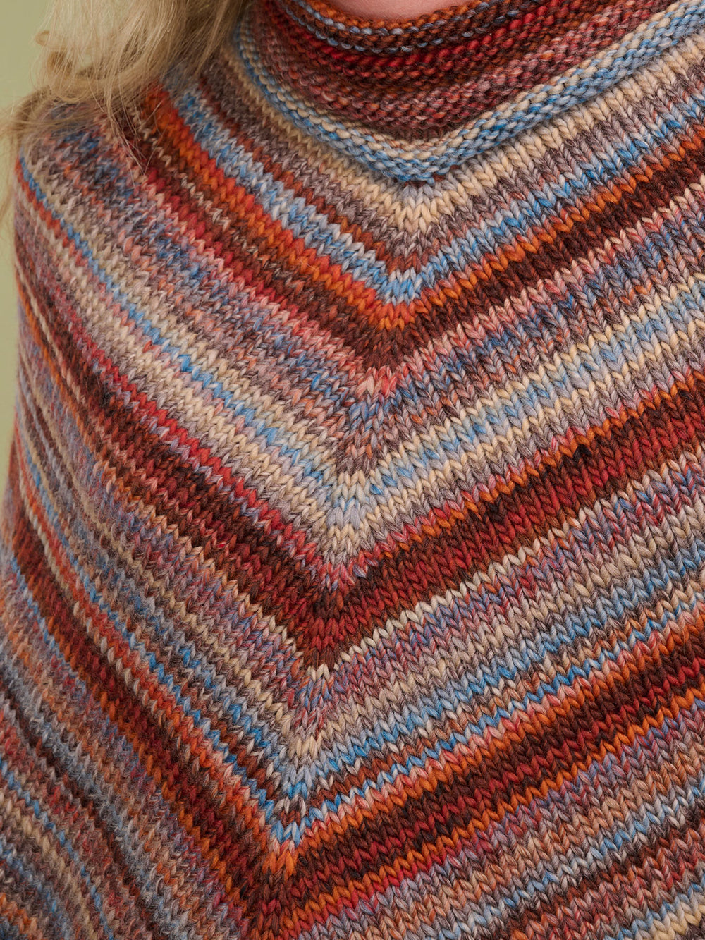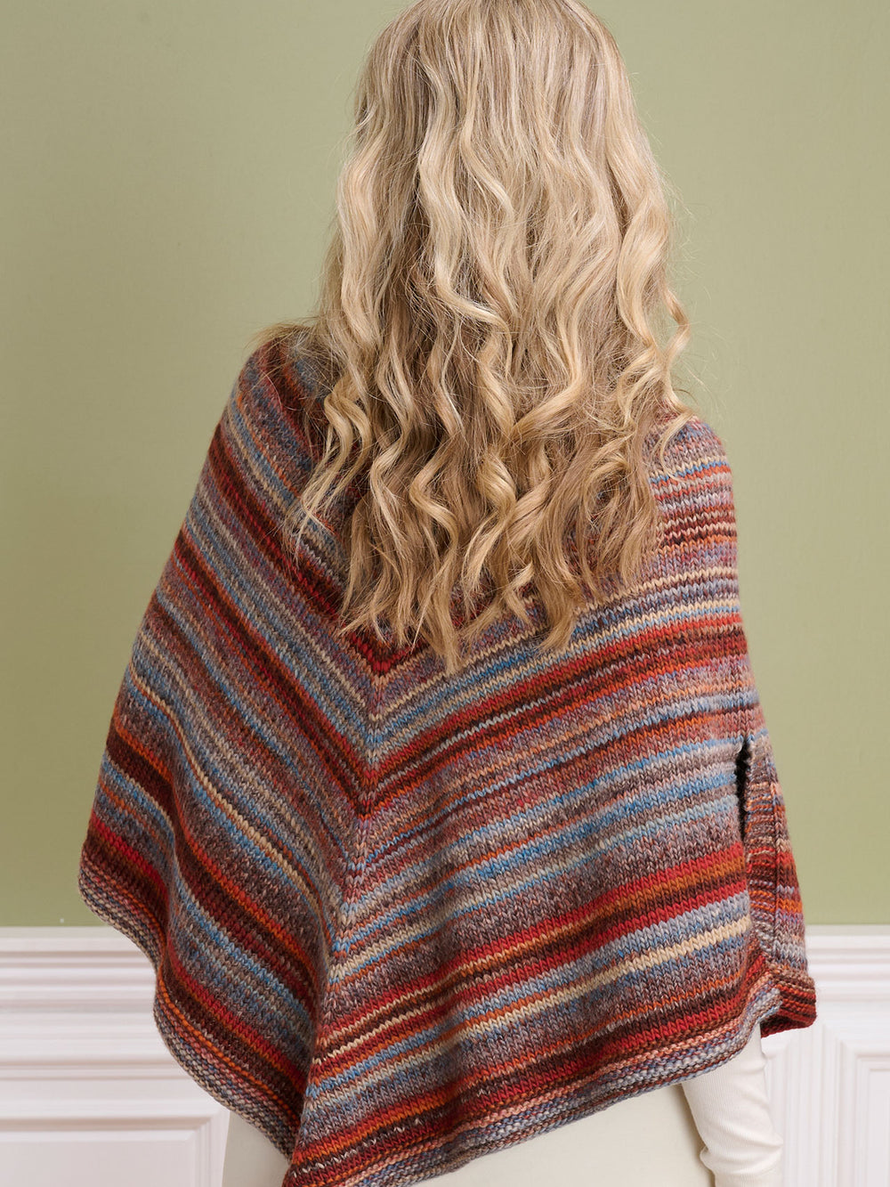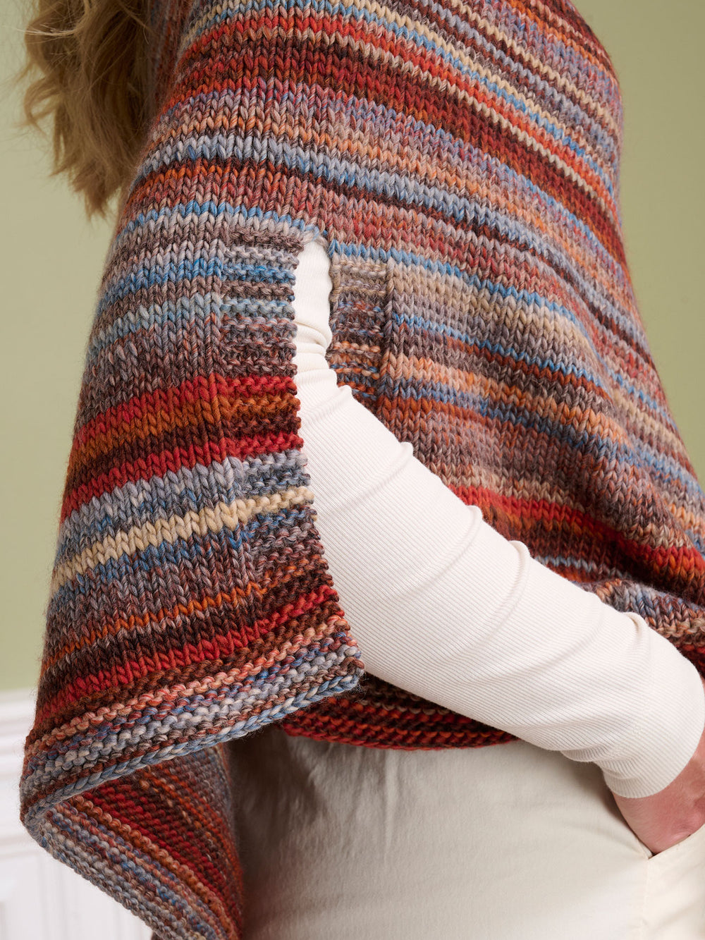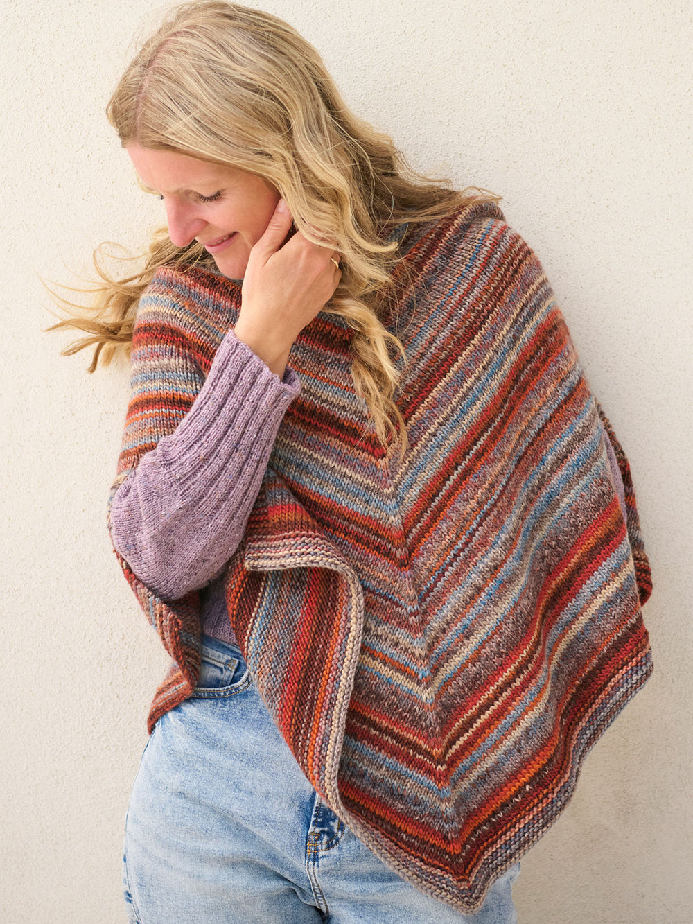 Ponchoen strikkes oppefra og ned og har slidser i begge sider ved armene.
