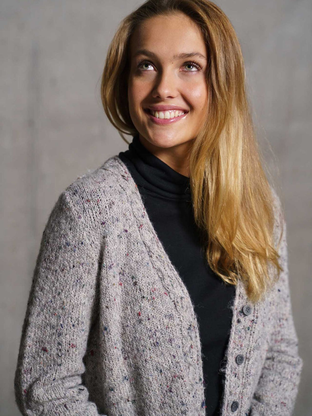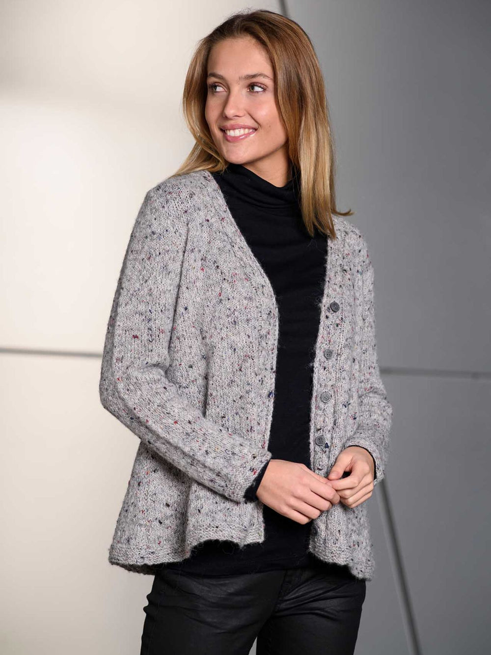 En cardigan skal helst have en god pasform, hvilket også har været et vigtigt fokuspunkt ved denne cardigan. Den er strikket nedefra og op, mens der løbende tages masker ind. Denne teknik giver en velsiddende A-facon, der feminint fremhæver taljen.