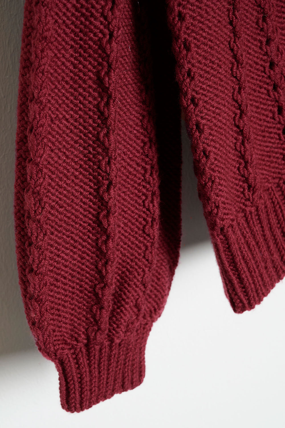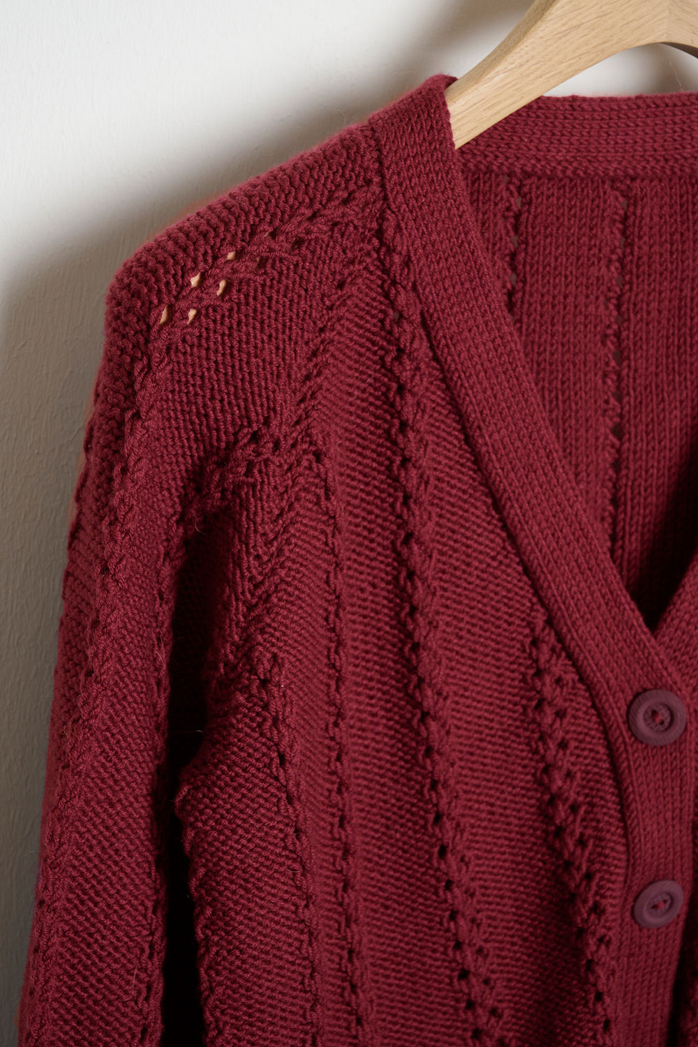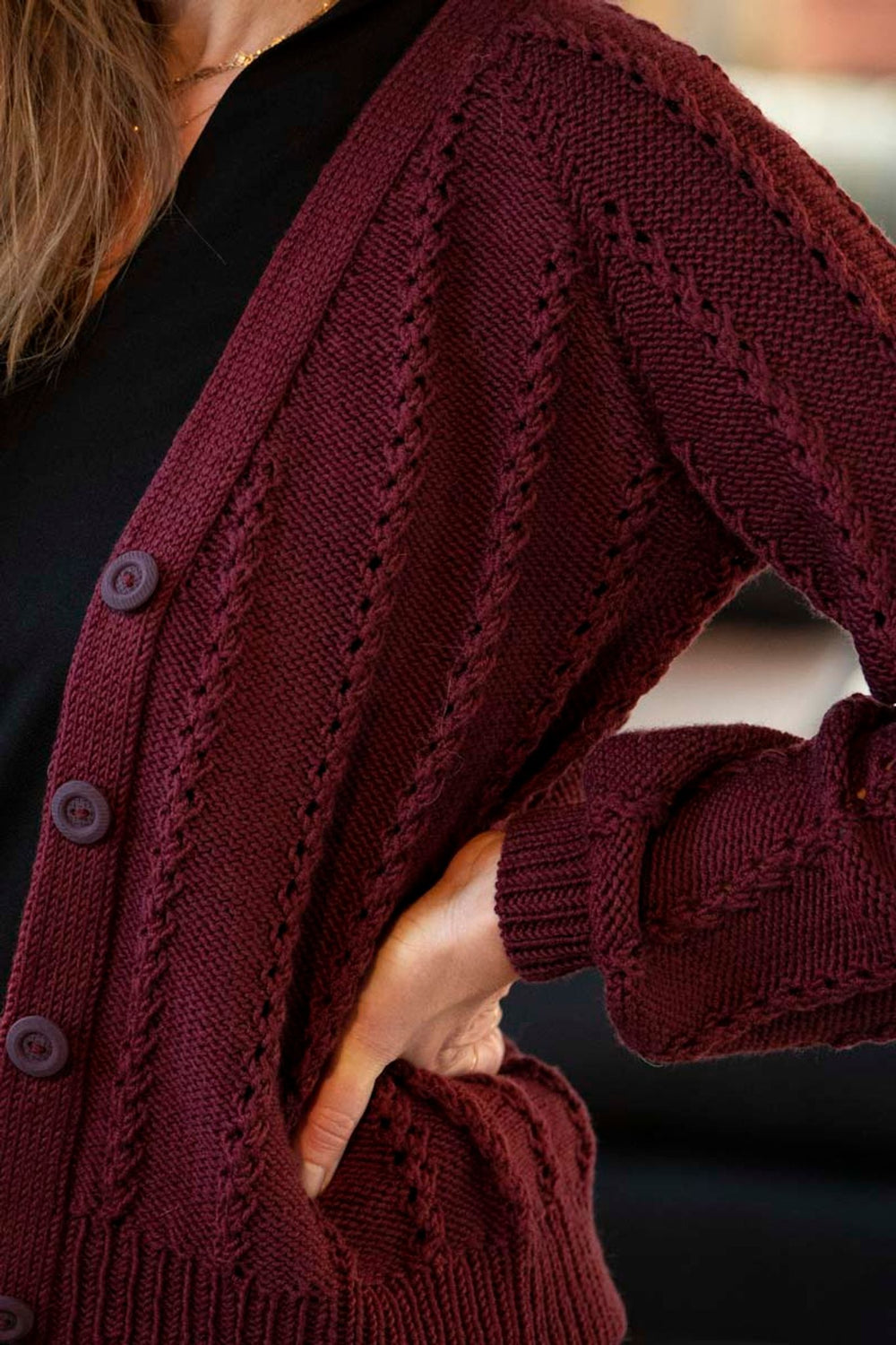 Charmerende cardigan med dyb V-hals, som har et dekorativt hulmønster på både krop og ærmer. Erritsø cardigan strikkes top-down med raglanudtagninger og har derfor en klassisk opbygning. Den har et positive ease på 12-14 cm, ligesom ærmerne også er lidt posede. Knapstolperne er lavet i dobbeltstrik, mens der ved ærmekanterne og forneden er ribkanter. Erritsø cardigan har et fint, vertikalt hulmønster, som popper frem og adskiller sig fra de øvrige masker, som laves i glat vrang.