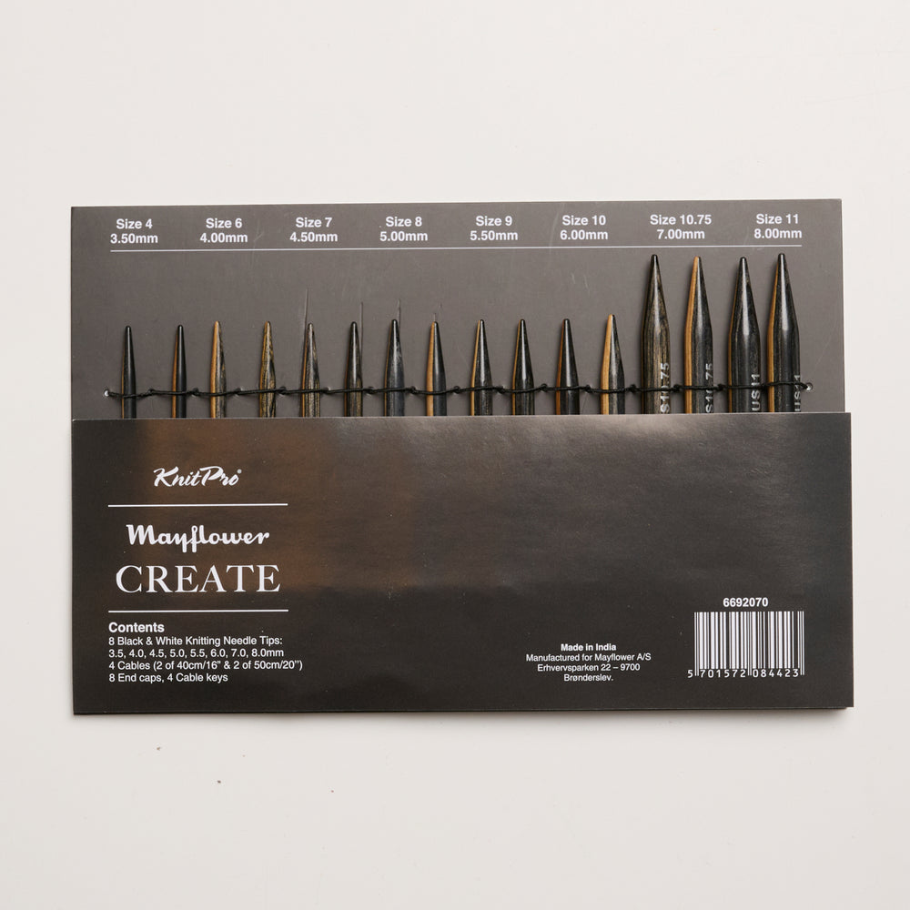 Det her sæt med udskiftelige rundpinde, wirer, stoppere og strammenøgler kan kun fås hos Mayflower, som i samarbejde med KnitPro har udviklet et intuitivt og udskifteligt rundpindesæt, hvor den ene halvdel af Mayflower-pinden er lys og den anden halvdel er mørk, så du kan bruge den farve, der har den største kontrast til dit garn og dermed få et større overblik undervejs.