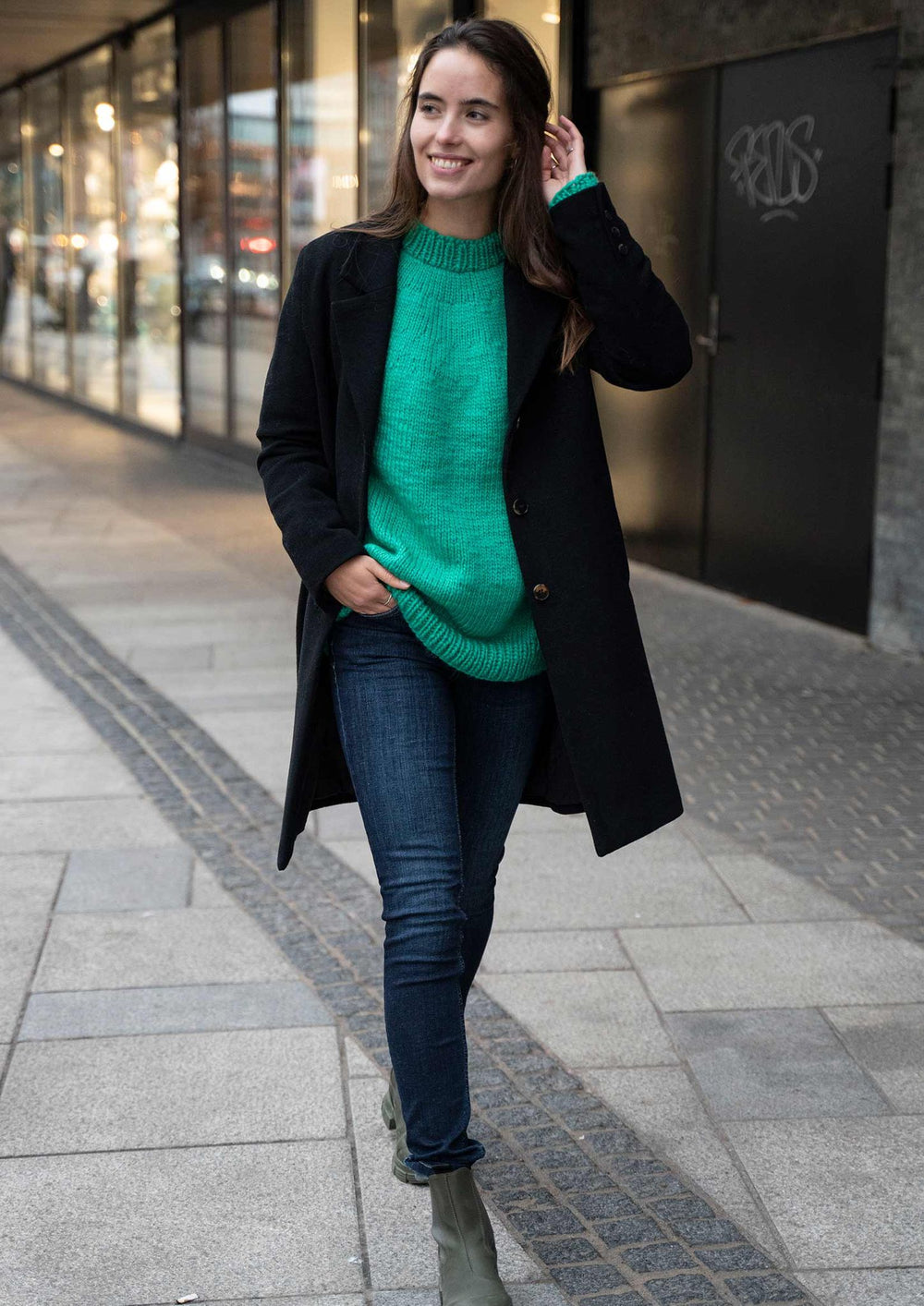 Eftersom sweateren er strikket oppefra og ned, kan du også nemt justere længden, hvis du gerne vil strikke den længere eller kortere. Du kan endda prøve den på undervejs, hvis du sætter den på en ekstra lang rundpind.