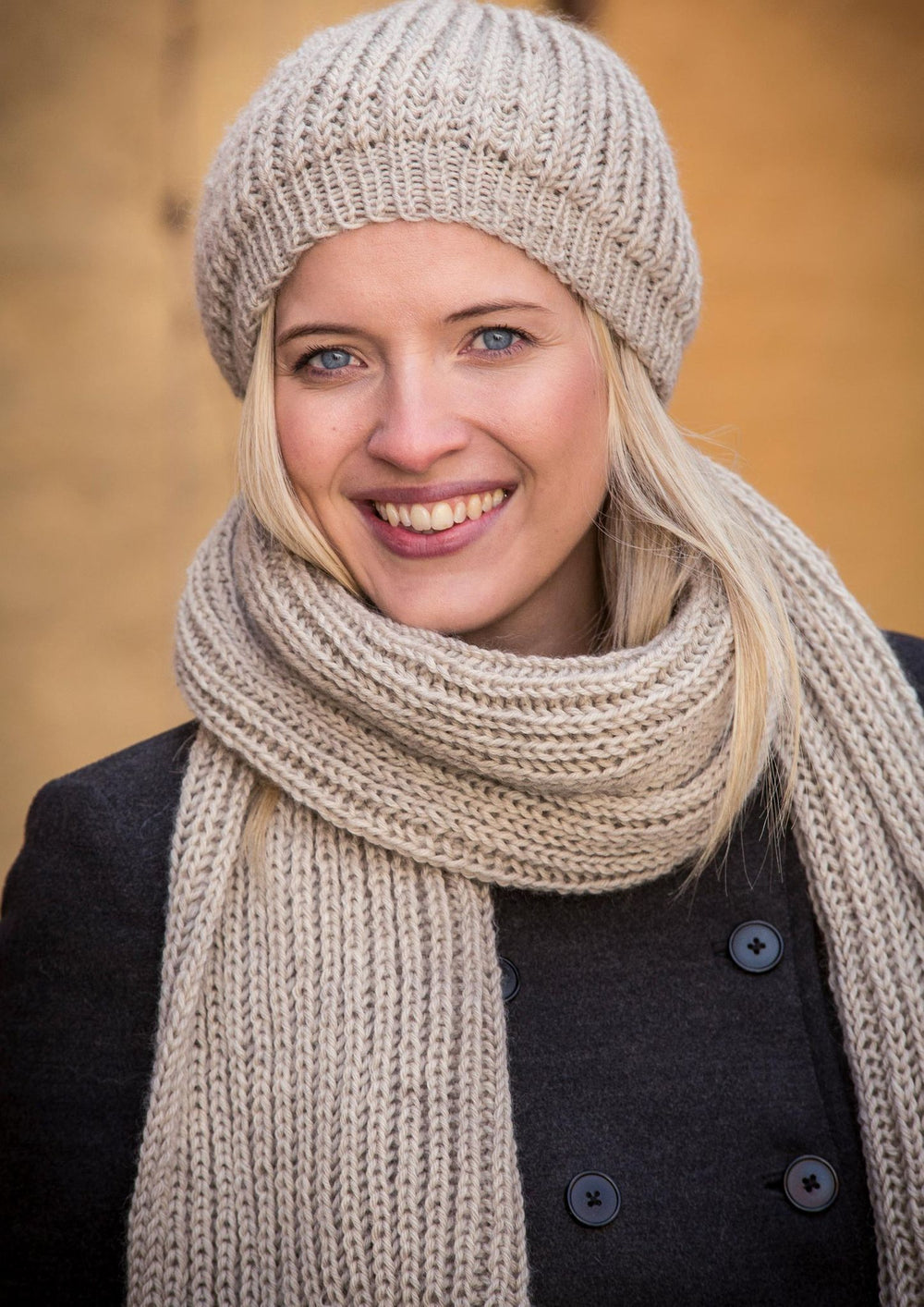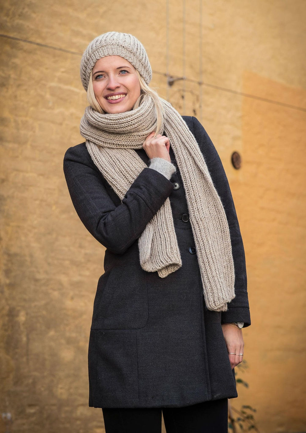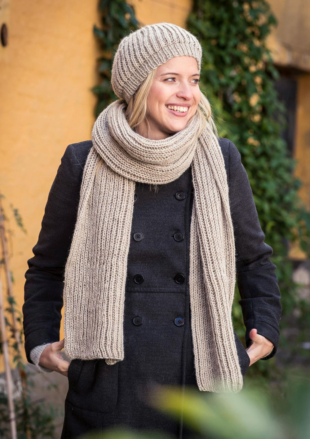 Flot sæt med hue og halstørklæde, som begge er strikket i patentstrik. Det er derfor enkle opskrifter, som er til at gå til.