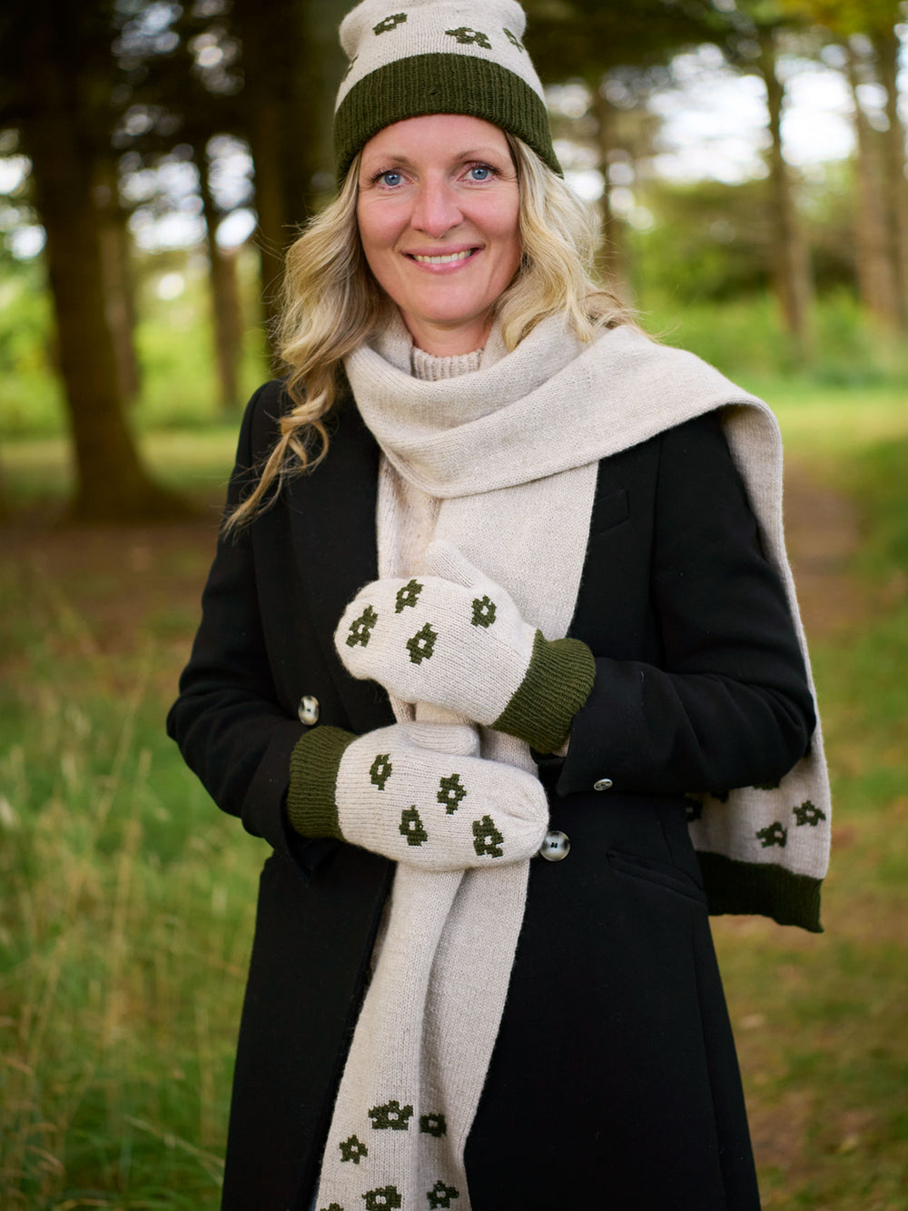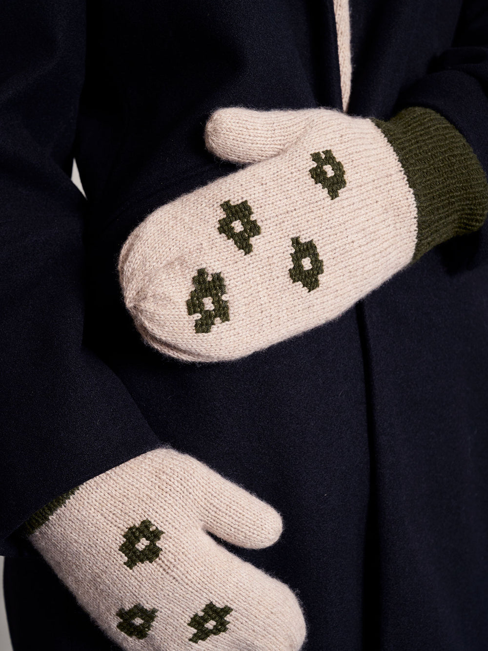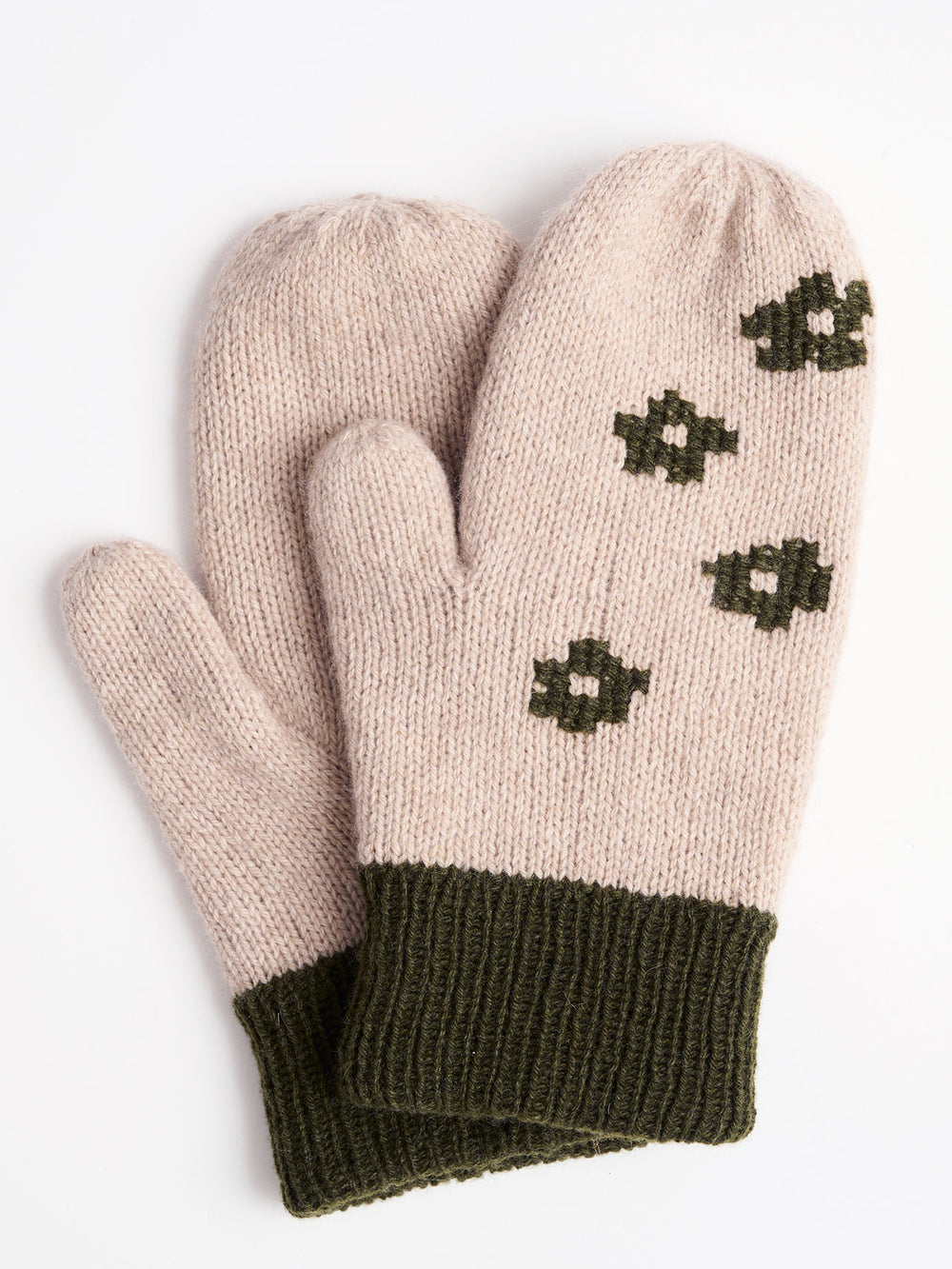 Lune, uldne luffer, som strikkes i glatstrik med ribkant og broderede blomster. Lufferne strikkes dobbelt og har derfor både en inderside og en yderside, hvilket gør dem dejligt isolerende.