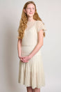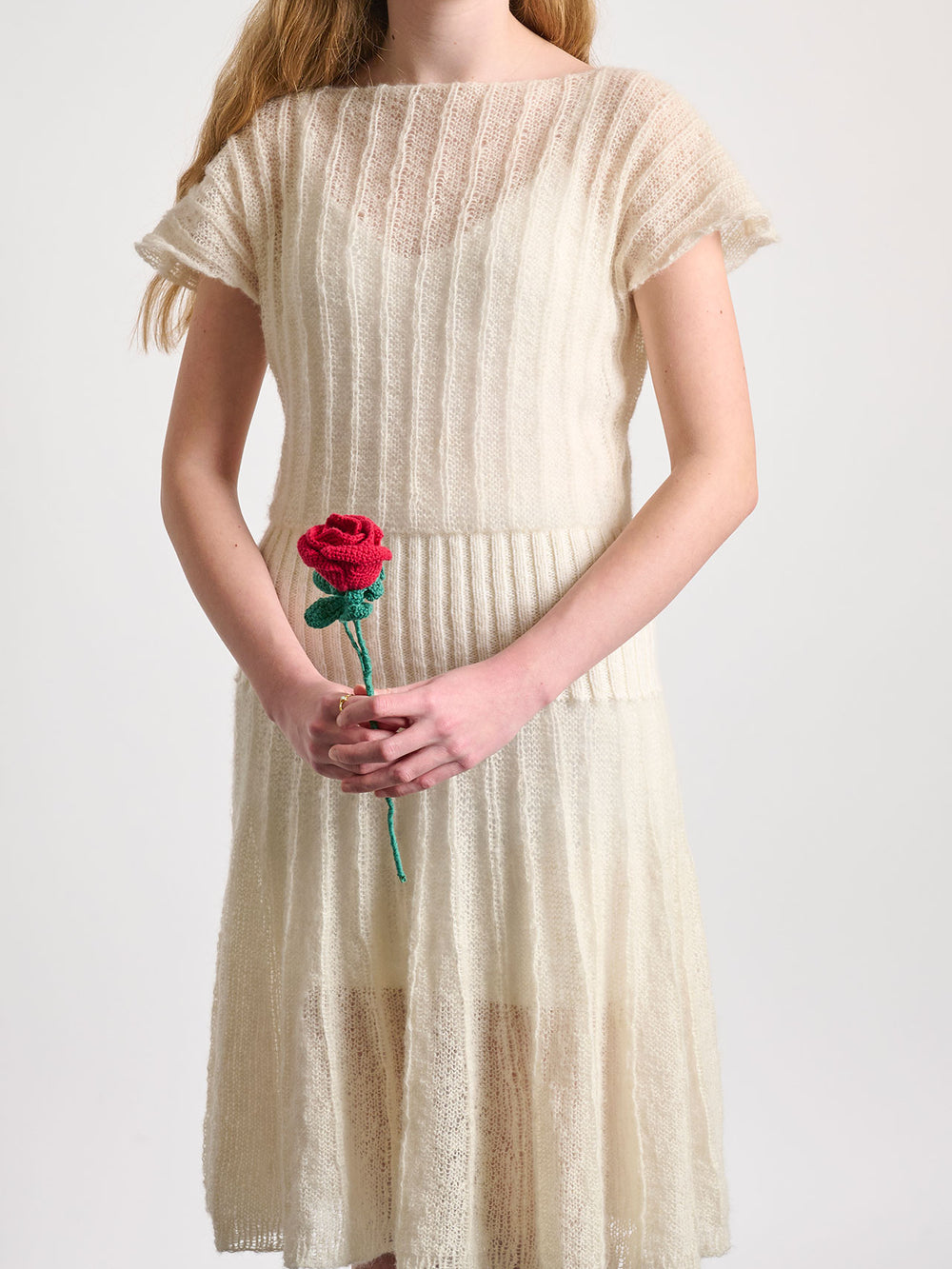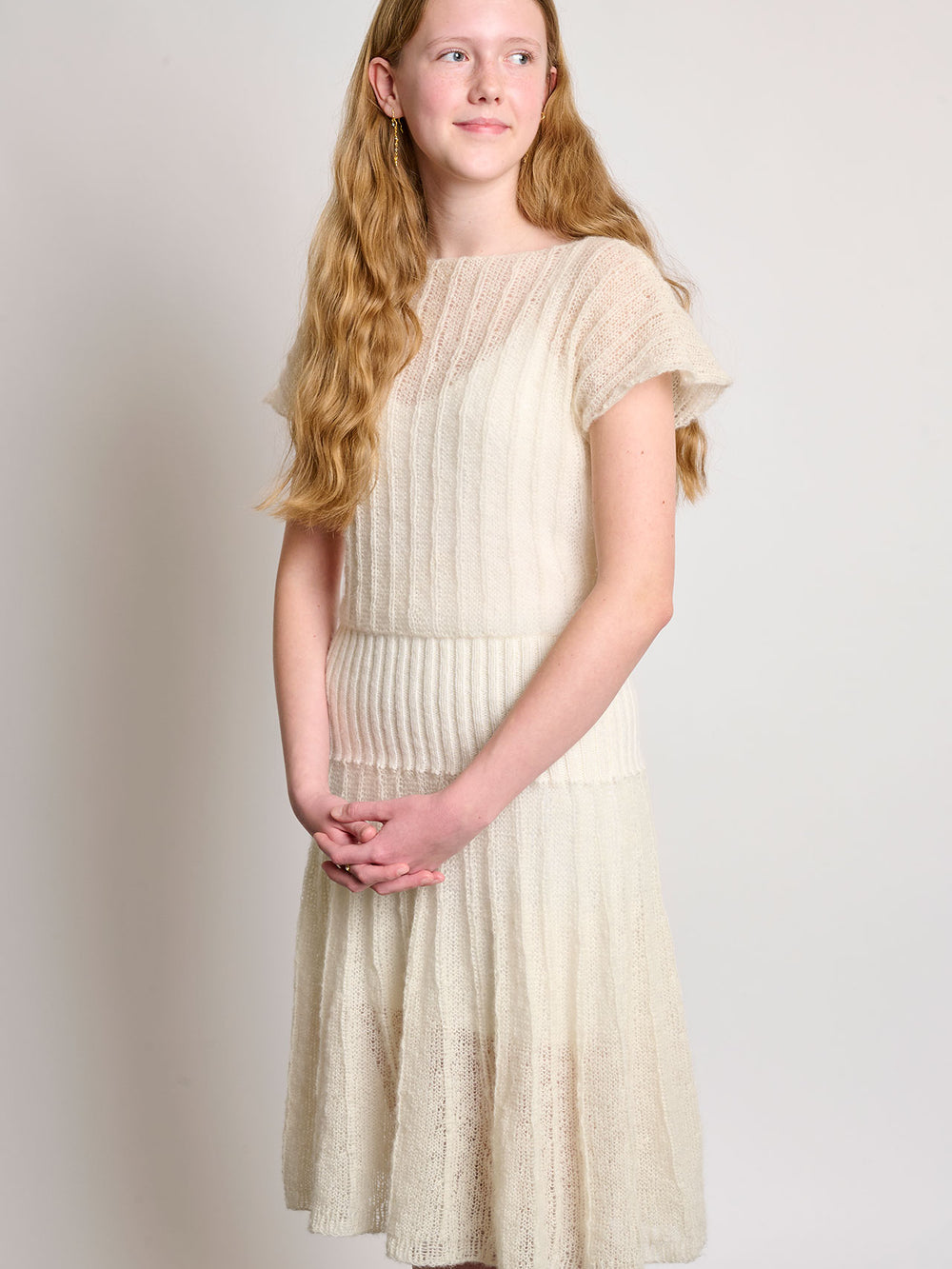 Har du en drøm om at have en håndlavet sommerkjole, som fx også kan bruges til konfirmationsdagen? En håndlavet, fin og feminin smuk kjole, som er fjerlet og fantastisk. Denne kjole er strikket med et bredt ’bælte’ i livet, hvor du kan sætte et sløjfebånd. Den har et florlet udtryk, hvor du kan have en helt enkel, hvid underkjole under.