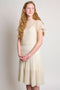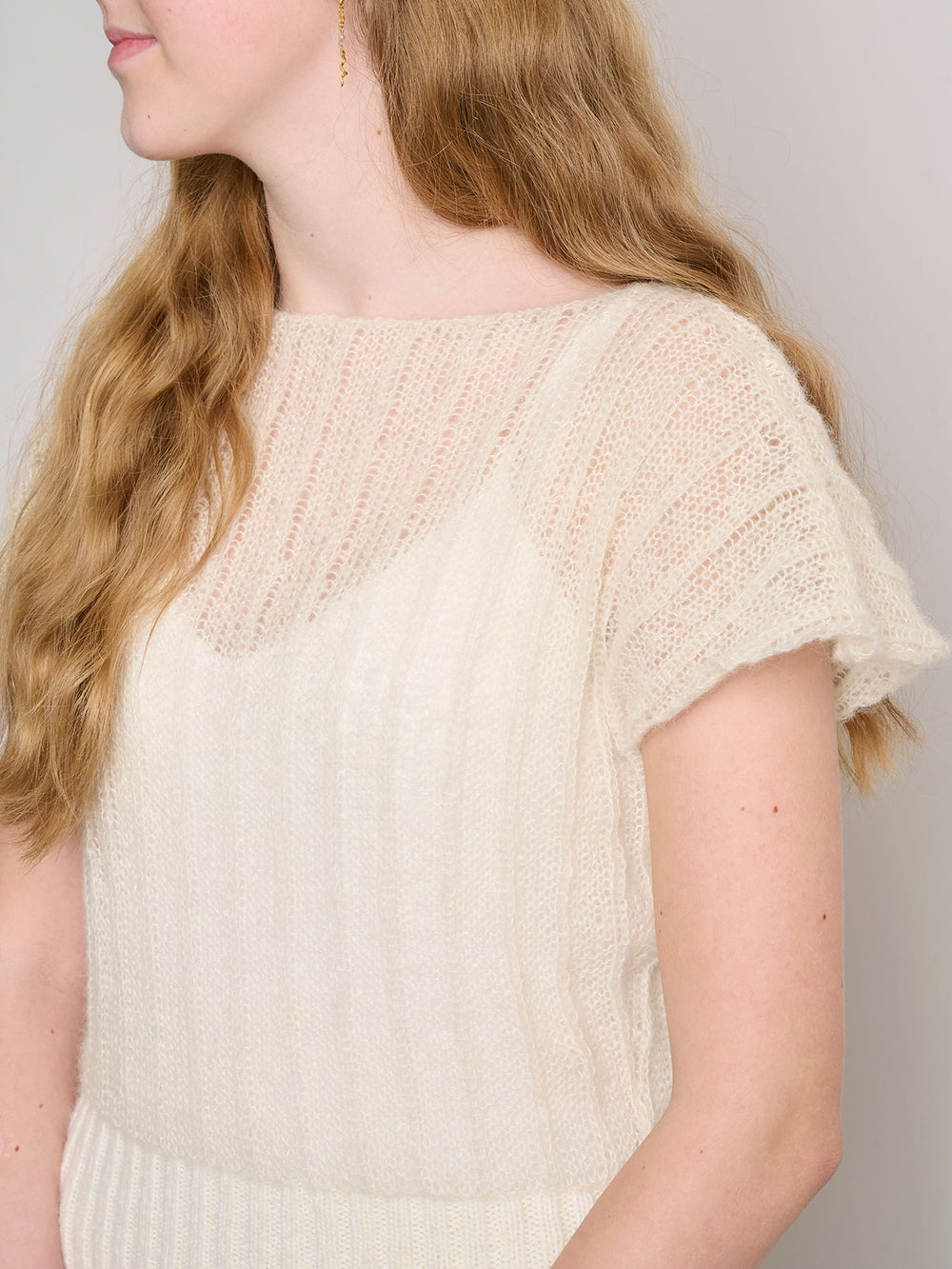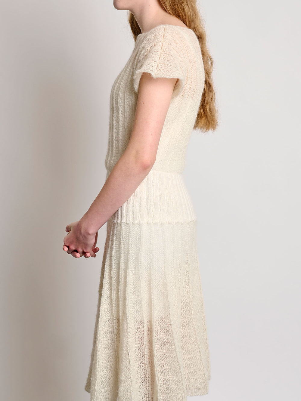 Kjolens bælte er strikket først, og derefter strikket fra ’bæltet’ og ned, hvorefter der bliver strikket m op fra ’bæltet’ og op til toppen. Kjolen har en fin finesse over skulderen, hvor det kun er retmaske-rillerne, der er syet sammen, så kjolen samtidig får en smuk bådhals.