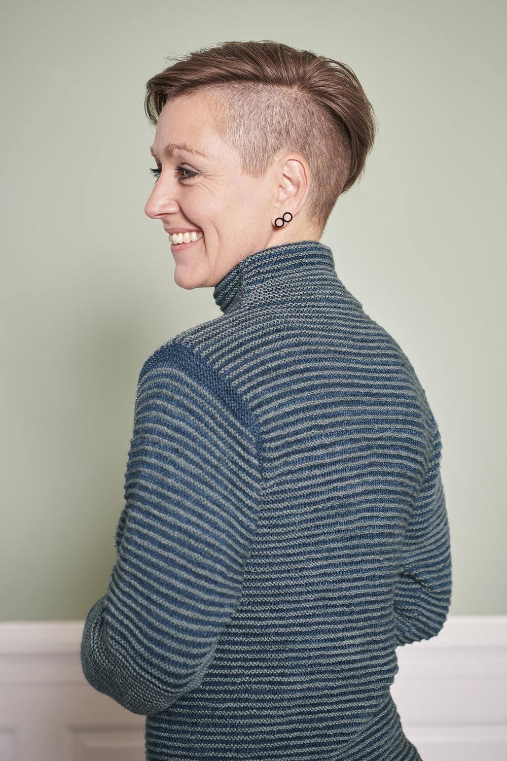En fin, stribet sweater, som strikkes med 2 farver, hvilket giver et flot farvespil. Sweateren har en enkel rullekrave. De smalle striber har lidt 3D-effekt og træder endnu smukkere frem, når sweateren strikkes i forskellige farver med stor kontrast. Sweateren er en videreudvikling af denne vest, som også er designet af Pernille Frigga.