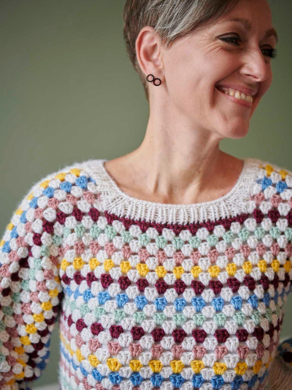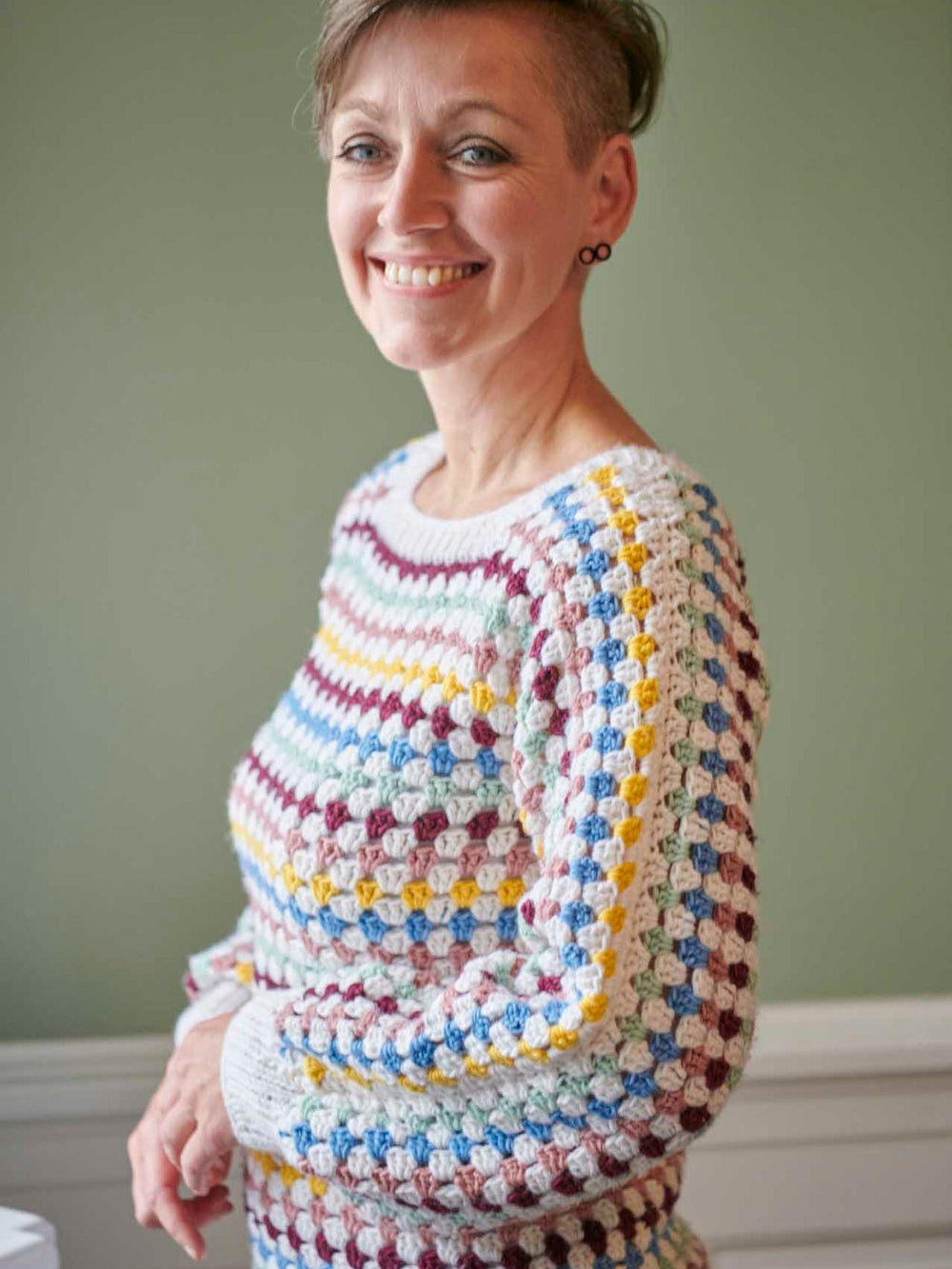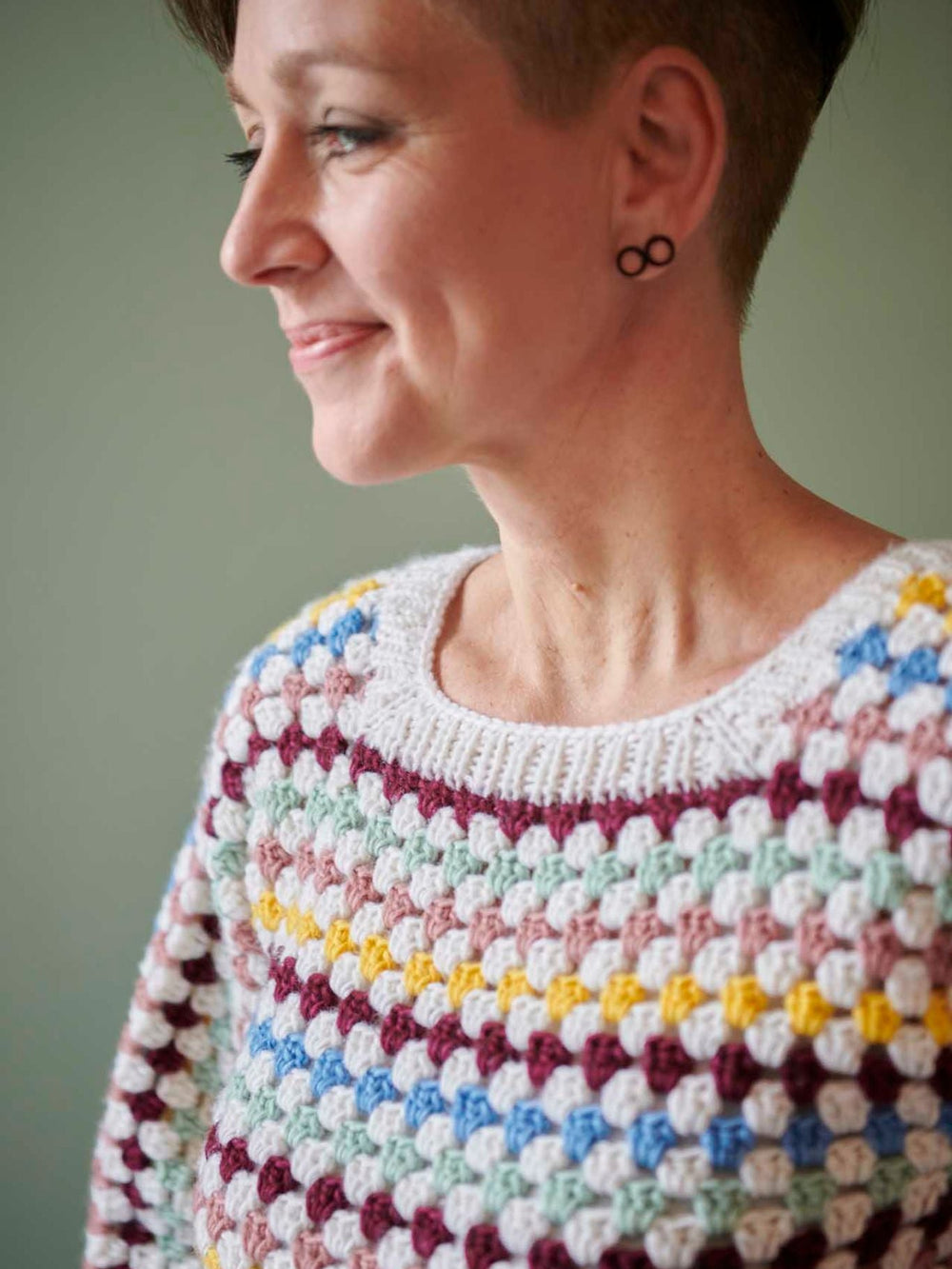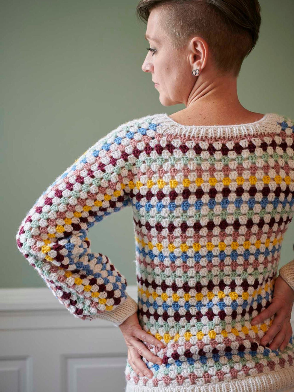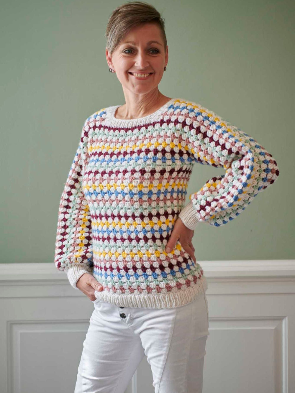 Kombinationen af både forskellige farver samt strik og hækling gør sweateren meget underholdende at lave. Sweateren er lavet nedefra og op. Hver række laves med en ny farve, ligesom du naturligvis også kan vælge at lave sweateren med fx bare én eller to farver helt efter dine egne farvepræferencer.