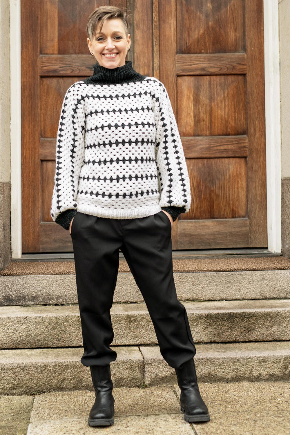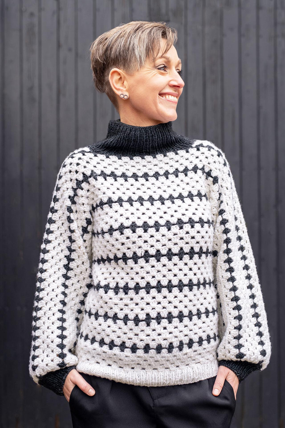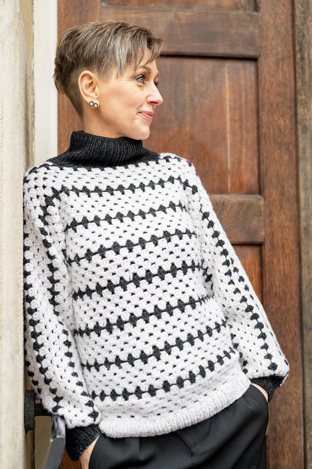 En flot, hæklet sweater i striber, som er lavet med granny stripes. Du får imidlertid også brug for strikkepindene, da sweaterens rullekrave og ribkanter er strikket i rib, hvilket giver en flot effekt.