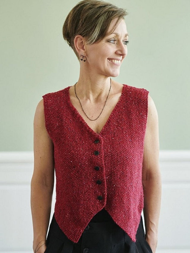 At have en habitvest i sin garderobe, er en del af det internationale fashion billede i de store modehuse. Med en strikket habitvest kan du nemt style dig til hverdag og fest, og gøre det strikkede håndværk, til en del af det klassiske fashion look. Denne vest er strikket nedefra og op og strikket i 3 dele. 2 forstykker og ryg, som bliver strikket hver for sig. Begge forstykket er spidse nederst, så de får den rigtige facon som en habitvest. Vesten er strikket i perlestrik i en tweedgarn, som giver vesten en rigtig flot struktur. Vesten kan både bæres alene, eller som en del af dit lag på lag outfit under din habitjakke.