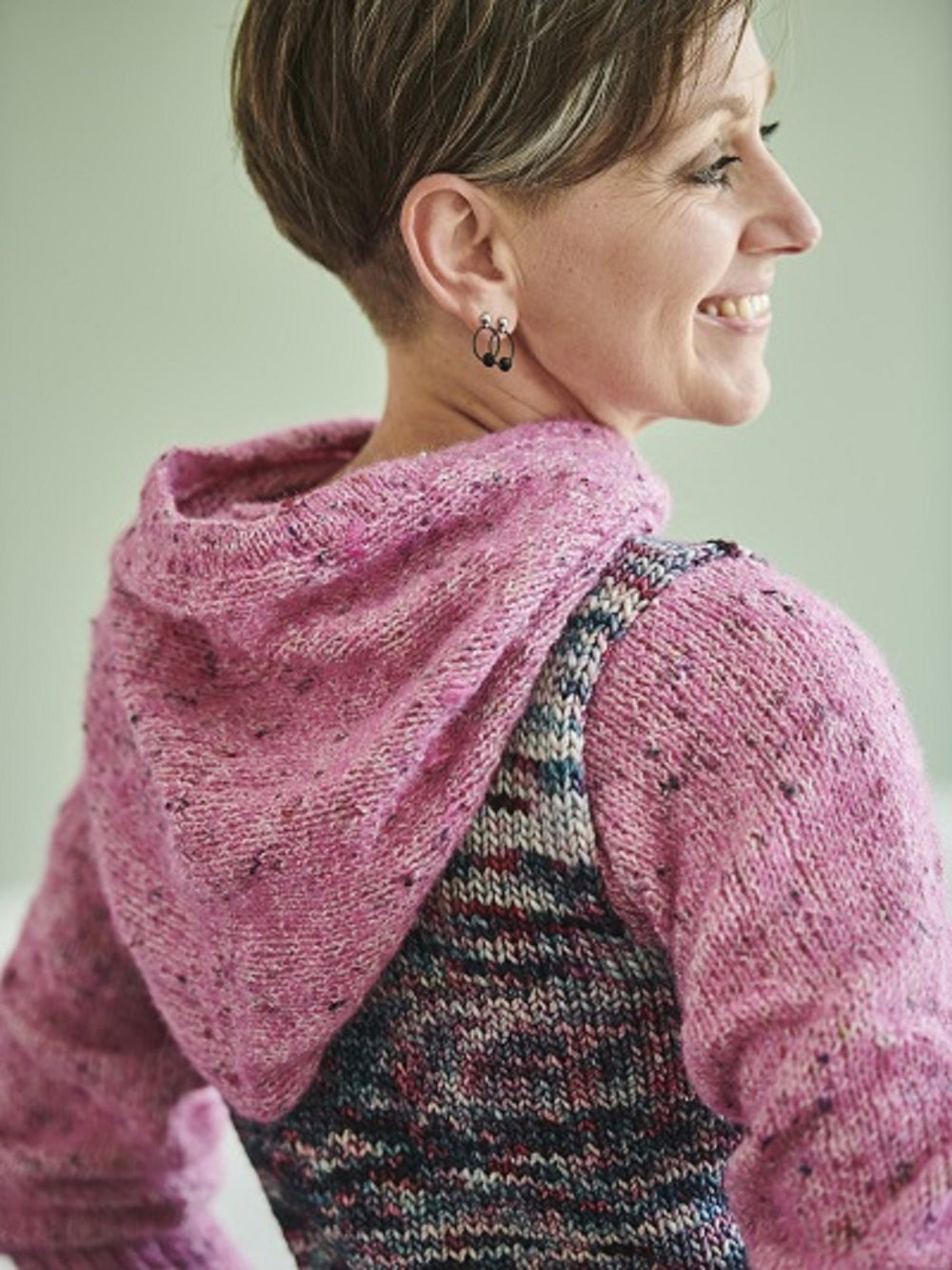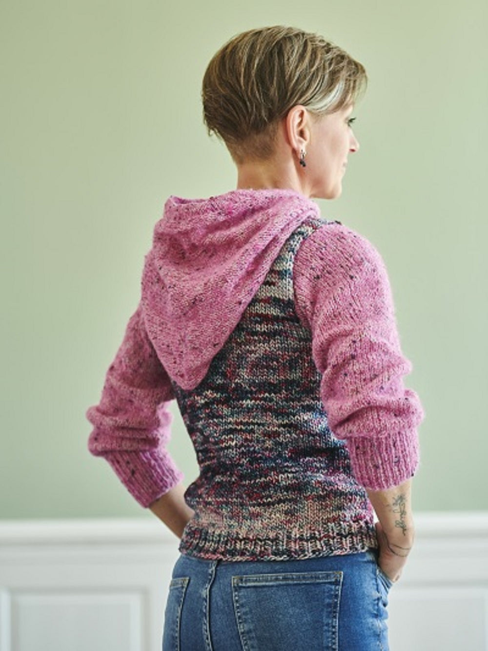 Denne bluse er strikket, som en vest i Montreal, hvorpå der er strikket en hætte og ærmer i Casablanca Lux. Blusen har et rigtig klassisk og sporty look, som gør den rigtig anvendelig. Kroppen er strikket nedefra og op, hele vejen rundt, og delt ved ærmegabet, hvorefter forstykke og ryg er strikket hver for sig. Efter skuldrene er syet sammen, strikkes masker op til hætten i kanten af halsen med Casa Blanca Lux. Hættes strikkes som anvist, og syes sammen i toppen med maskesting. Derefter strikkes der en forkant på hætten, som bukkes indvendig og bliver syet fast. Ærmet bliver strikket fladt, og syet sammen, fordi syningen er med til at holde på ærmets facon, så det ikke bliver slasket med tiden.
