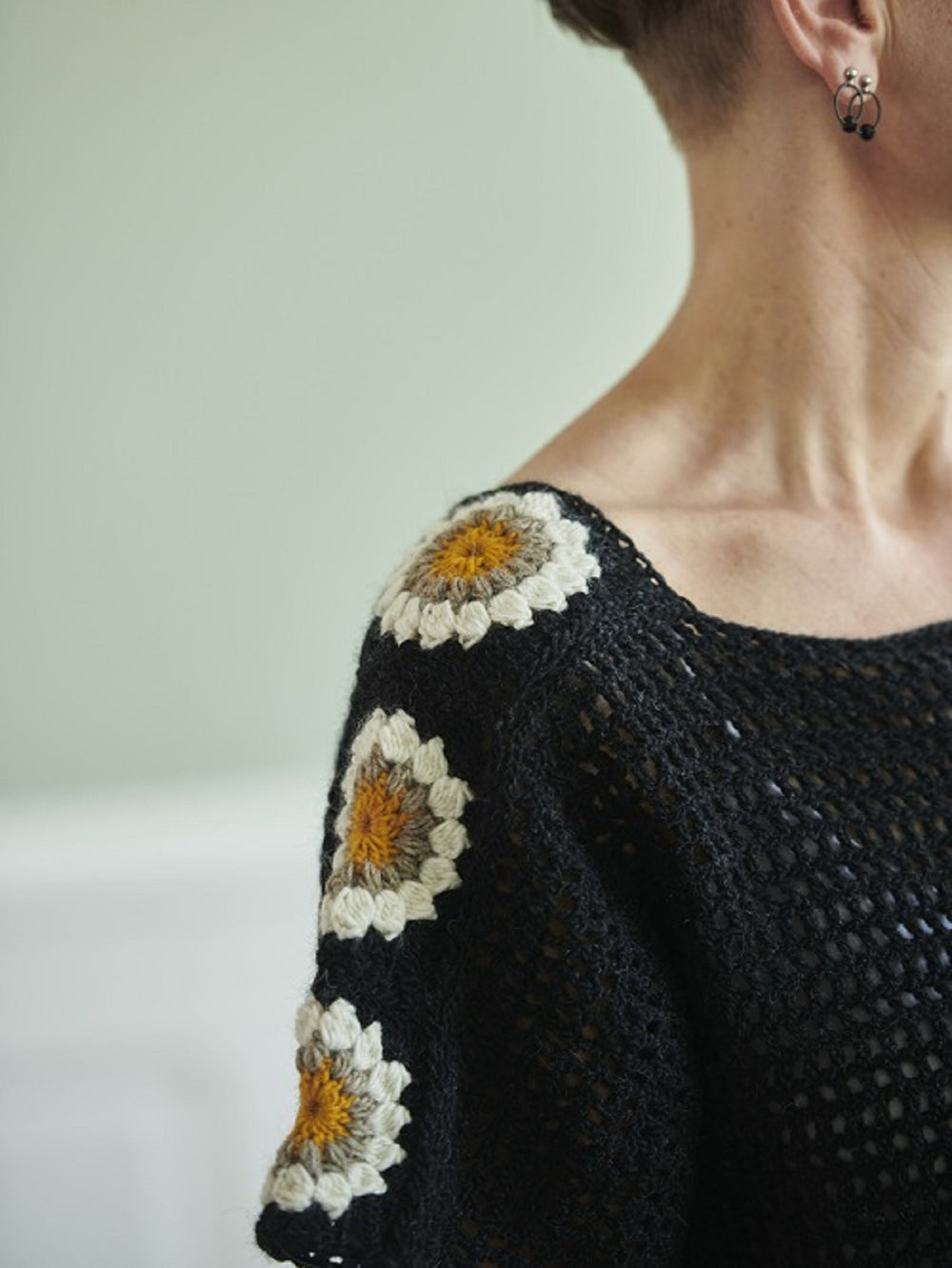 Denne smukke hæklede t-shirt er hæklet i et fint netmønster og dekoreret med flotte blomster Granny Squares nederst på modellen, og op over begge skuldre. T-shirten er åben i begge sider, og har et let og enkelt udtryk med et bindebånd i siden.