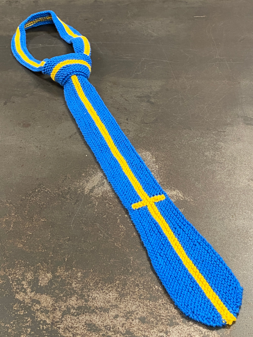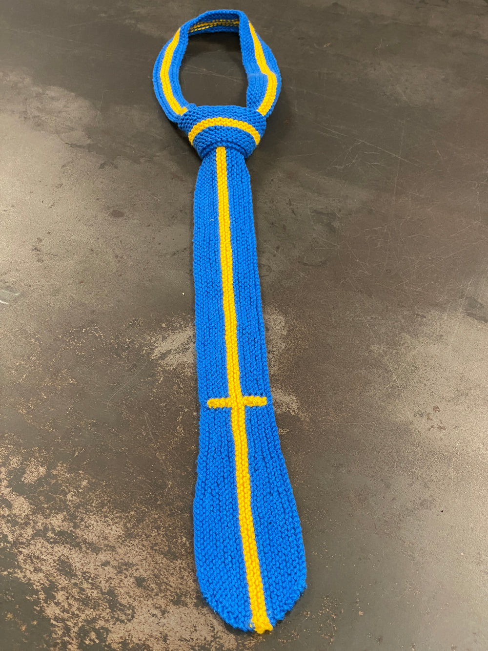 Dette slips med det svenske flag er et super interessant element i en festlig garderobe, som er perfekt til fødselsdag, jul eller sportslige arrangementer. Det er strikket af retmasker, så det bliver fast med flotte kanter. Slipset er strikket på langs og har vendepinde, hvor du skal bruge teknikken 'German Short Row'. Det er vigtigt, at både opslagning, strikning og aflukning er strikket stramt.