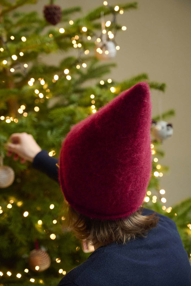 Denne superfine nissehue er strikket og derefter filtet. Dette giver huen et helt perfekt og hyggeligt udtryk. Huen er nøje sammensat i facon, enkelthed og anvendelighed, så den sidder virkelig godt på hovedet og kan nemt bruges af både børn og voksne. Den er virkelig fin at have på udendørs, fordi filtningen gør huen ekstra fast og dermed vindtæt og varm. Opskriften er helt enkelt, så alle kan være med.