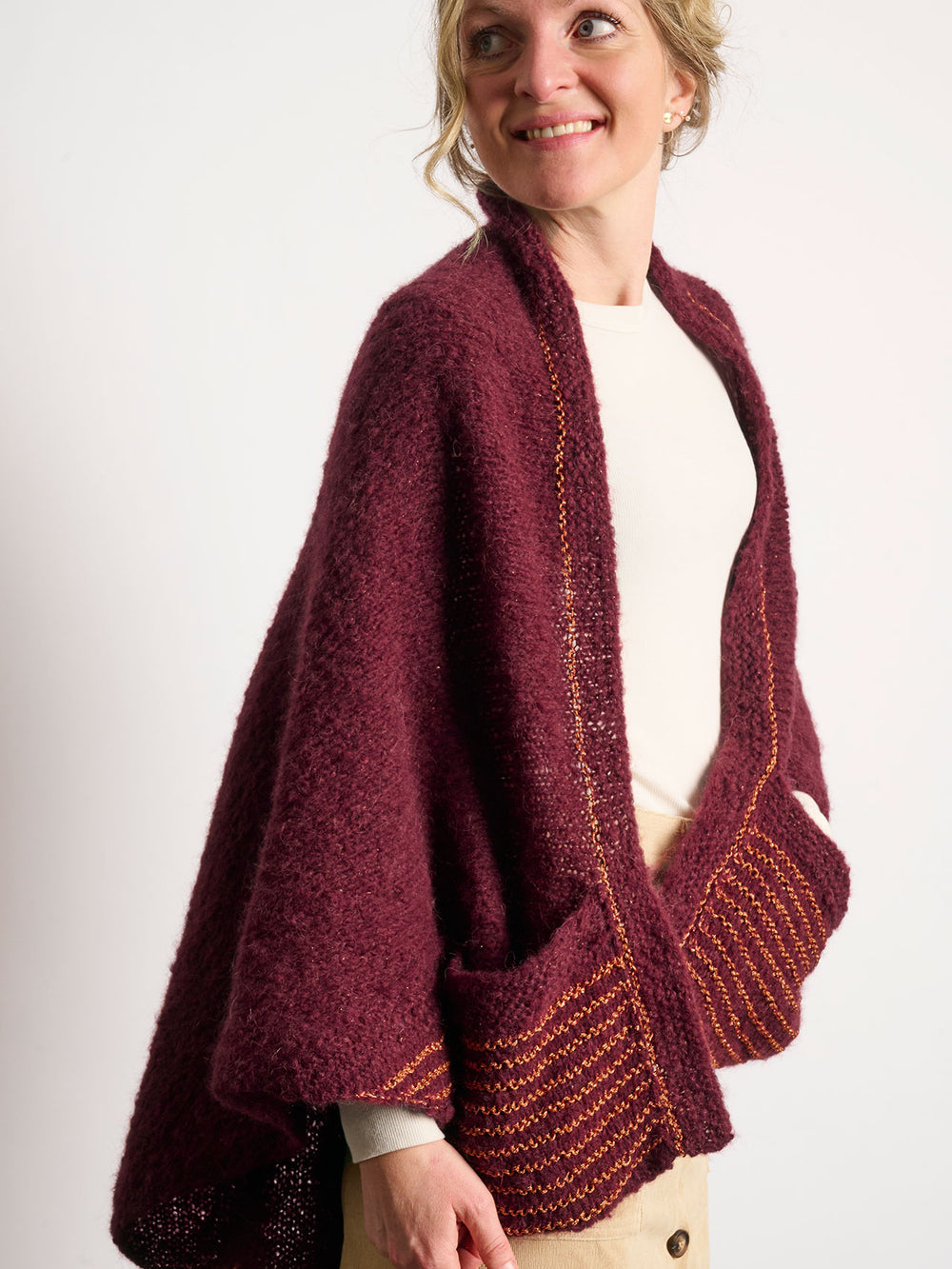 Sjalet har praktiske lommer, så hænderne kan varmes på en kold vinterdag. Designet er strikket nedefra og op i et helt enkelt mønster, og lommerne er strikket på bagefter. Strikket i Mayflower Monaco bliver sjalet virkelig blødt med en fluffy struktur.