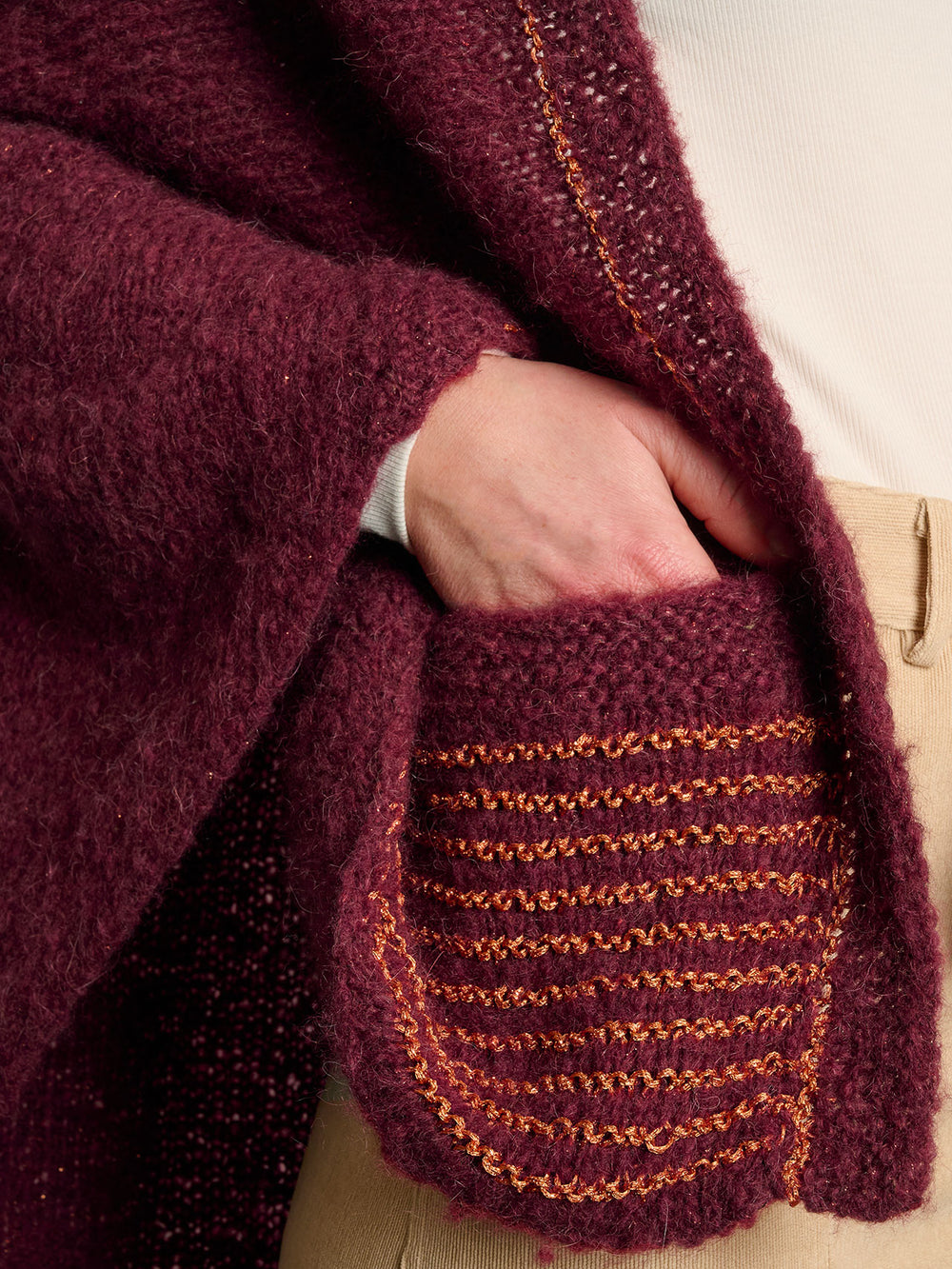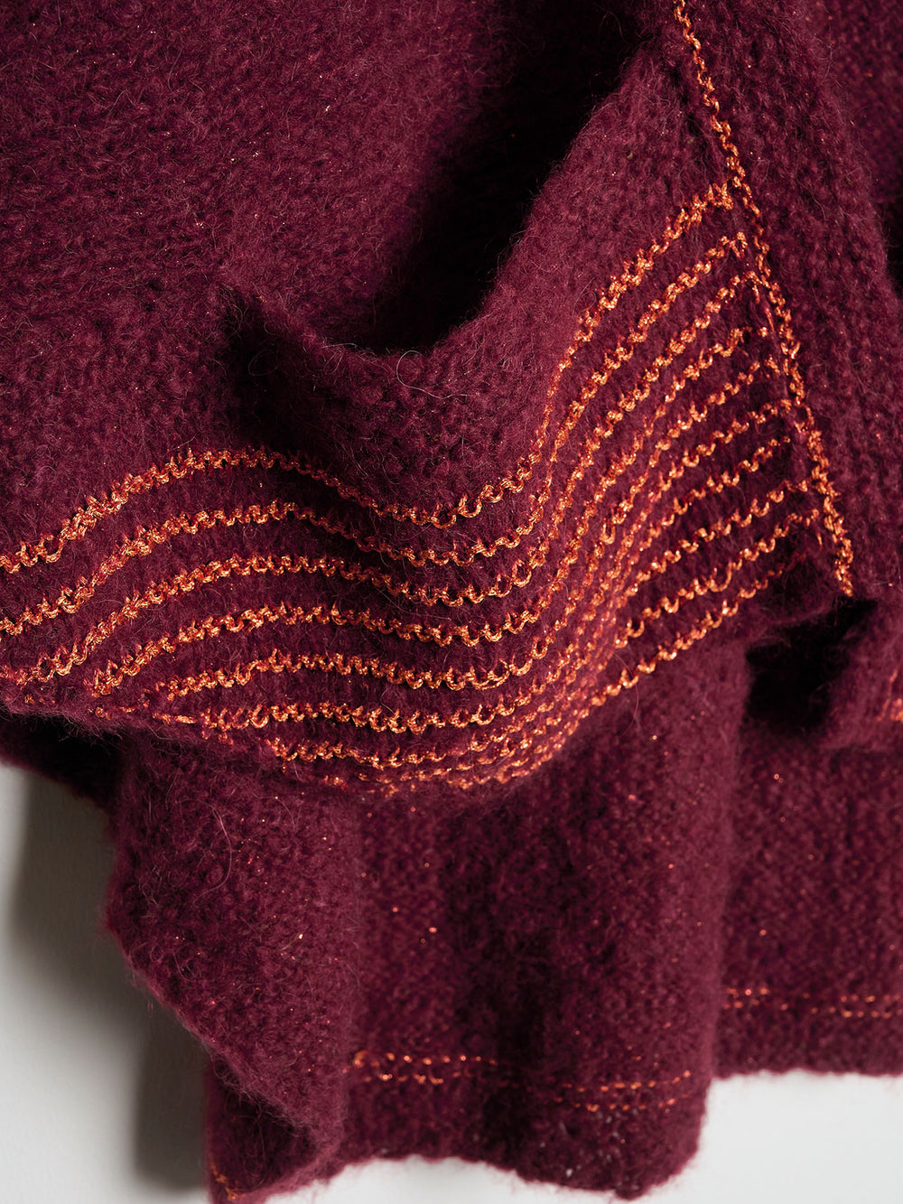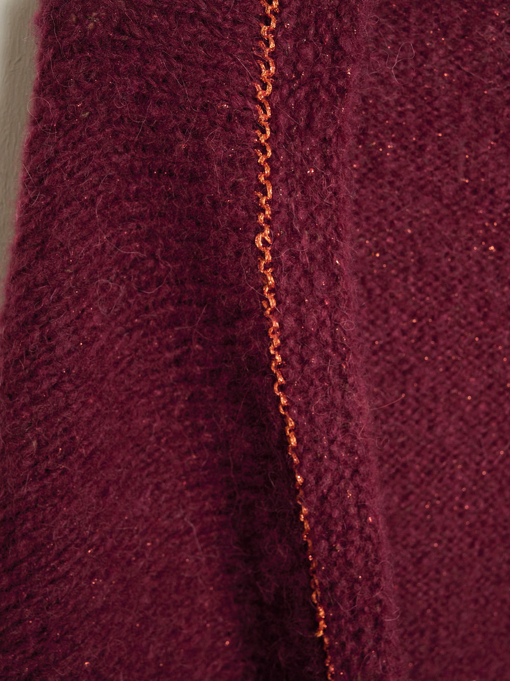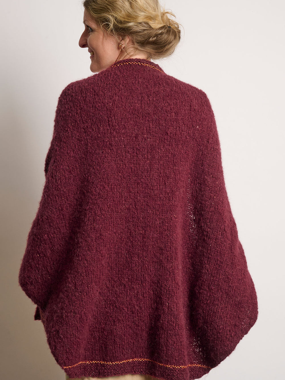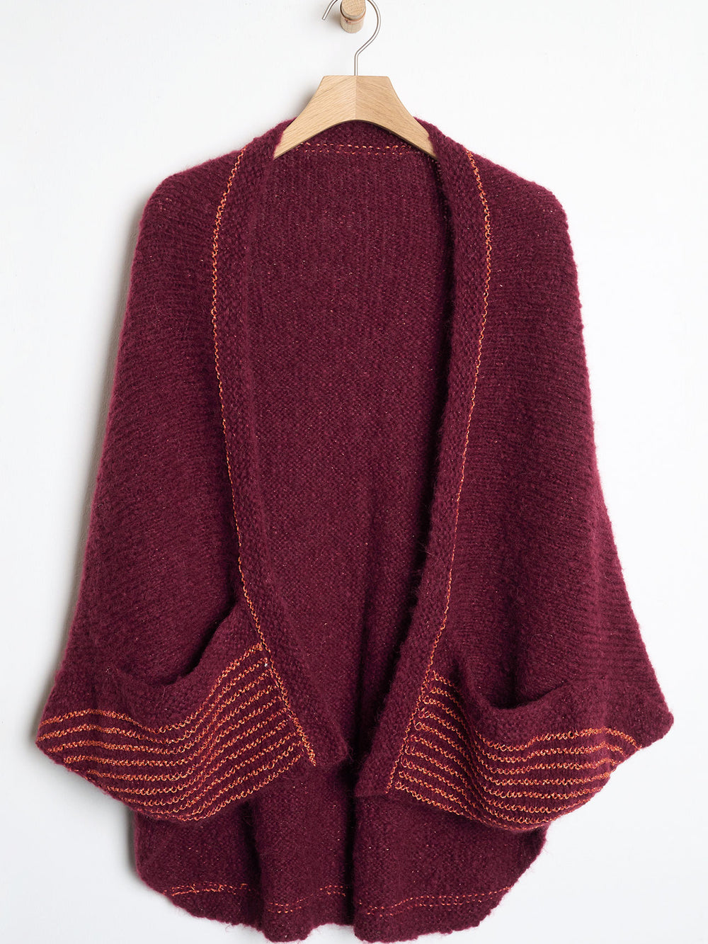 Dette smukke og fjerlette sjal er flot og dekorativt og har en lomme i hver side. Det er strikket i den luksuriøse garn Mayflower Monaco, som har en fin glimmertråd vævet ind i ulden. Dette feminine udtryk er peppet yderligere op med en stribe glimmertråd i Mayflower Glitter, som er tilføjet som effekt.