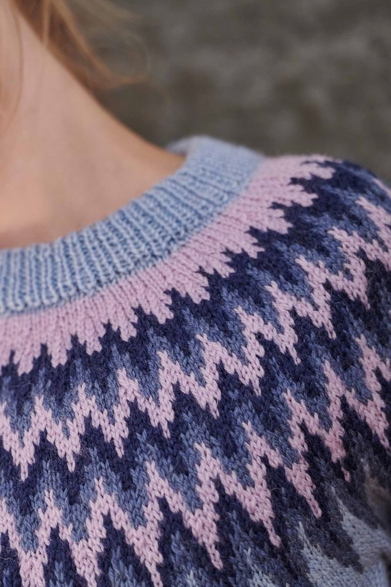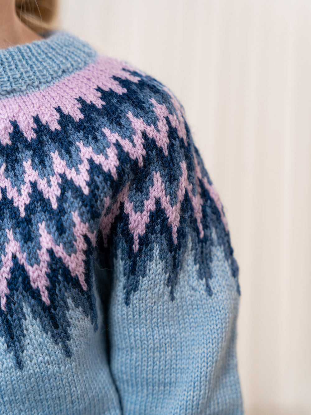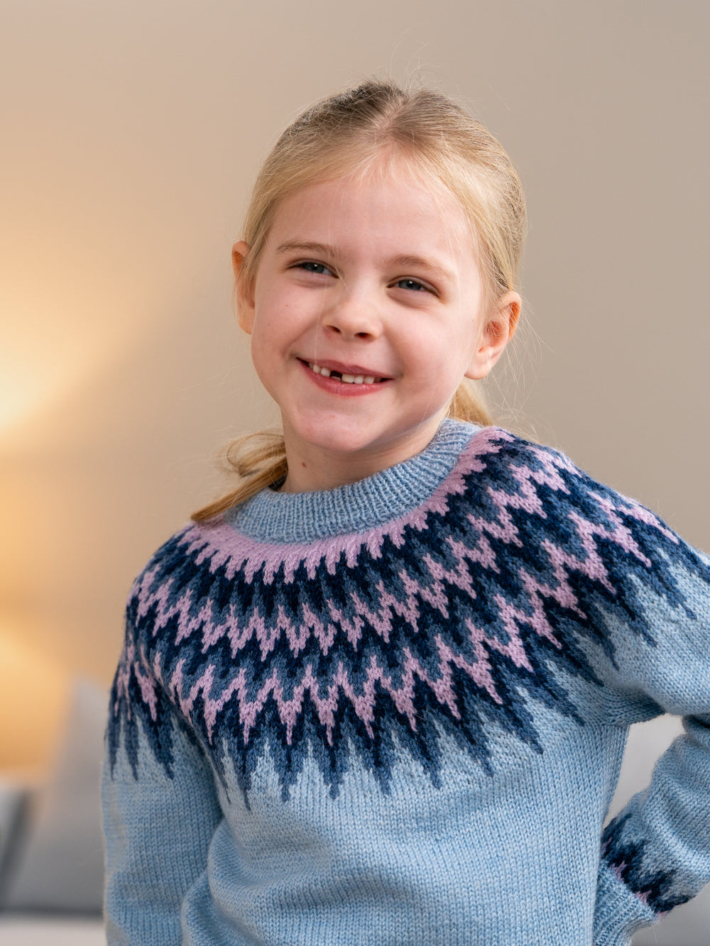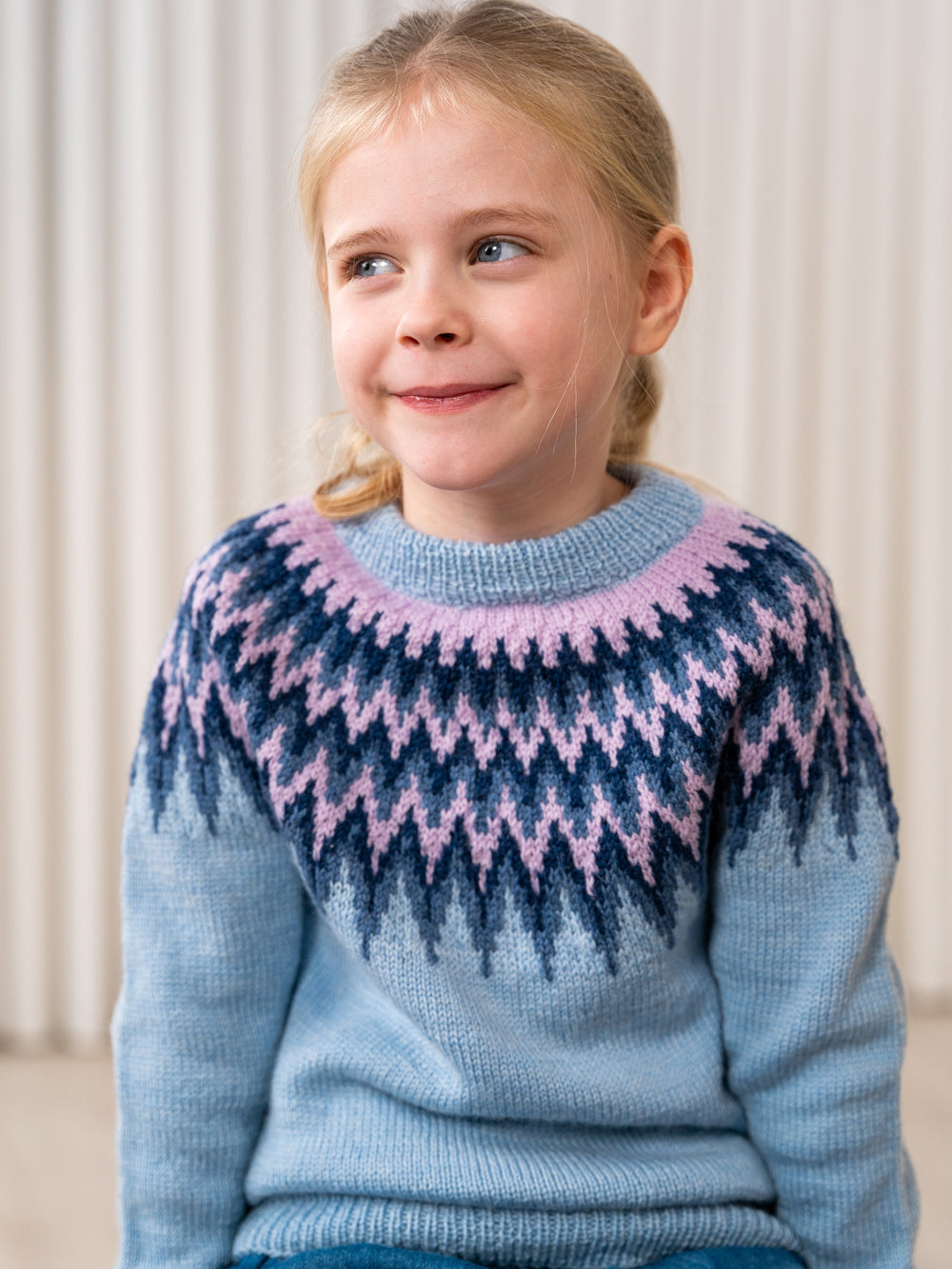Frida sweater junior er en lækker, ulden sweater til børn i alderen 2-12 år, som har et stor zig-zag-mønster i bærestykket, ligesom det samme mønster også er strikket i nederst på både krop og ærmer. Mønsteret strikkes efter diagram med tre forskellige farver. Du kan derfor sætte din egne yndlingsfarver sammen til en unik sweater.