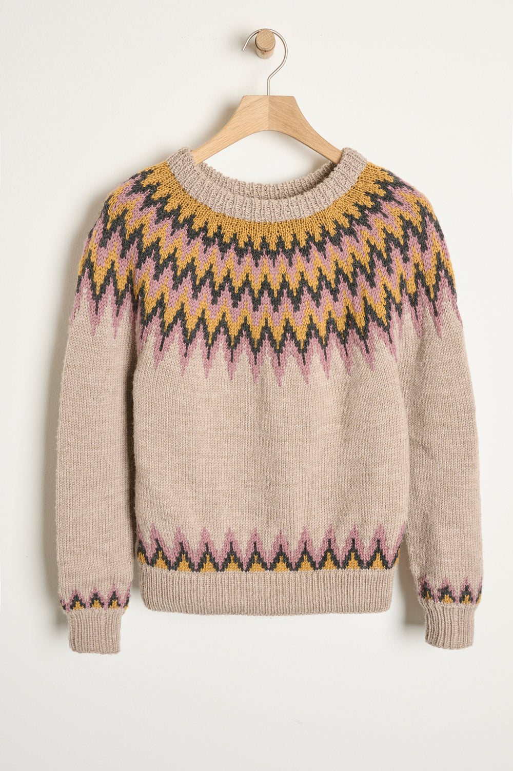 Skøn sweater, som har et virkelig smukt mønster i bærestykket, som strikkes med tre forskellige farver. Det samme mønster går igen nederst på sweateren og over ærmekanterne. Du kan derfor sætte din egne yndlingsfarver sammen til en unik sweater.