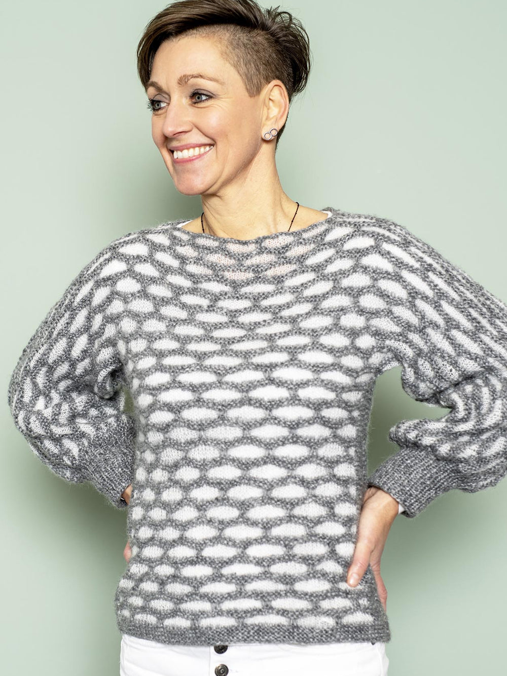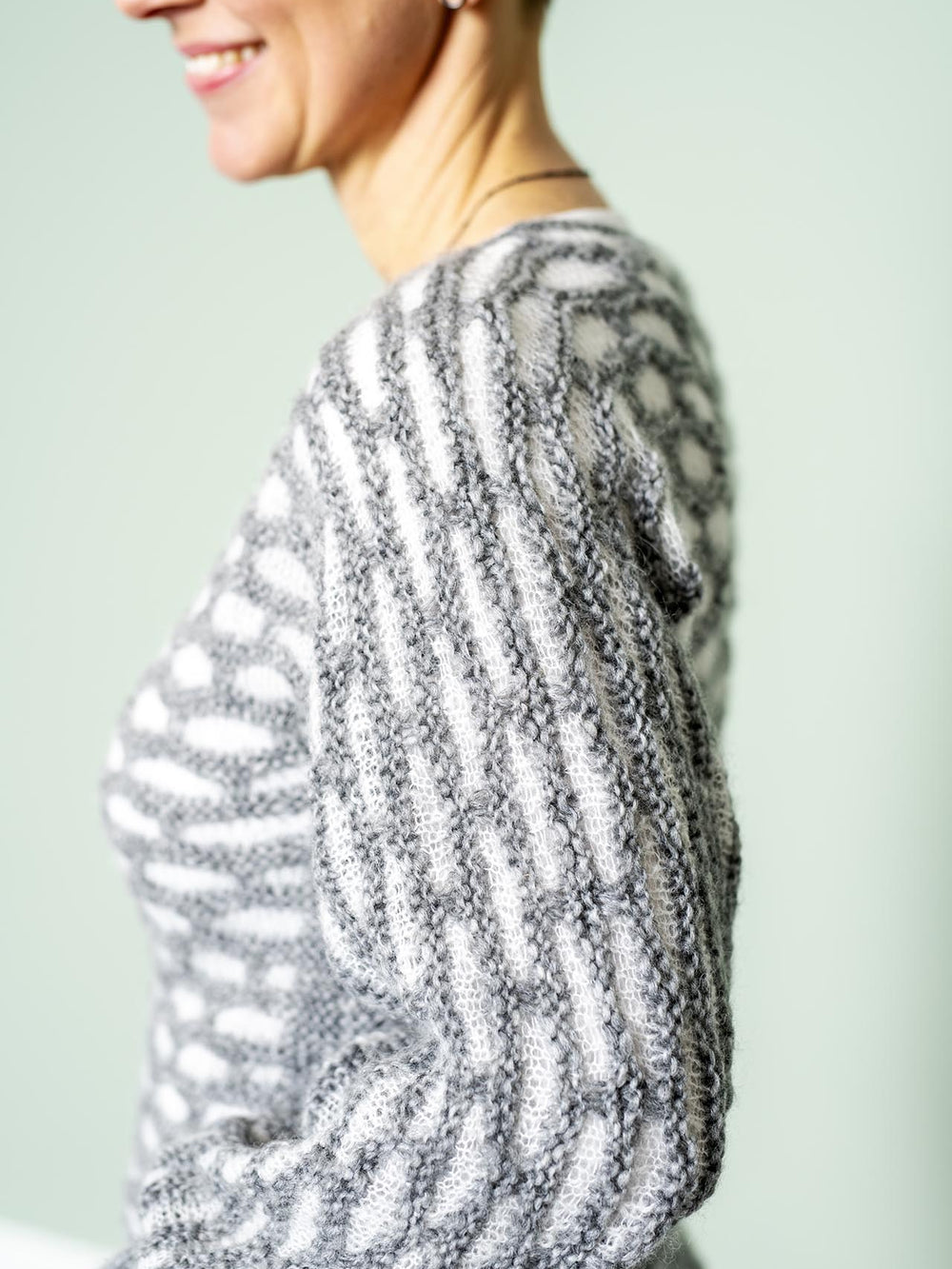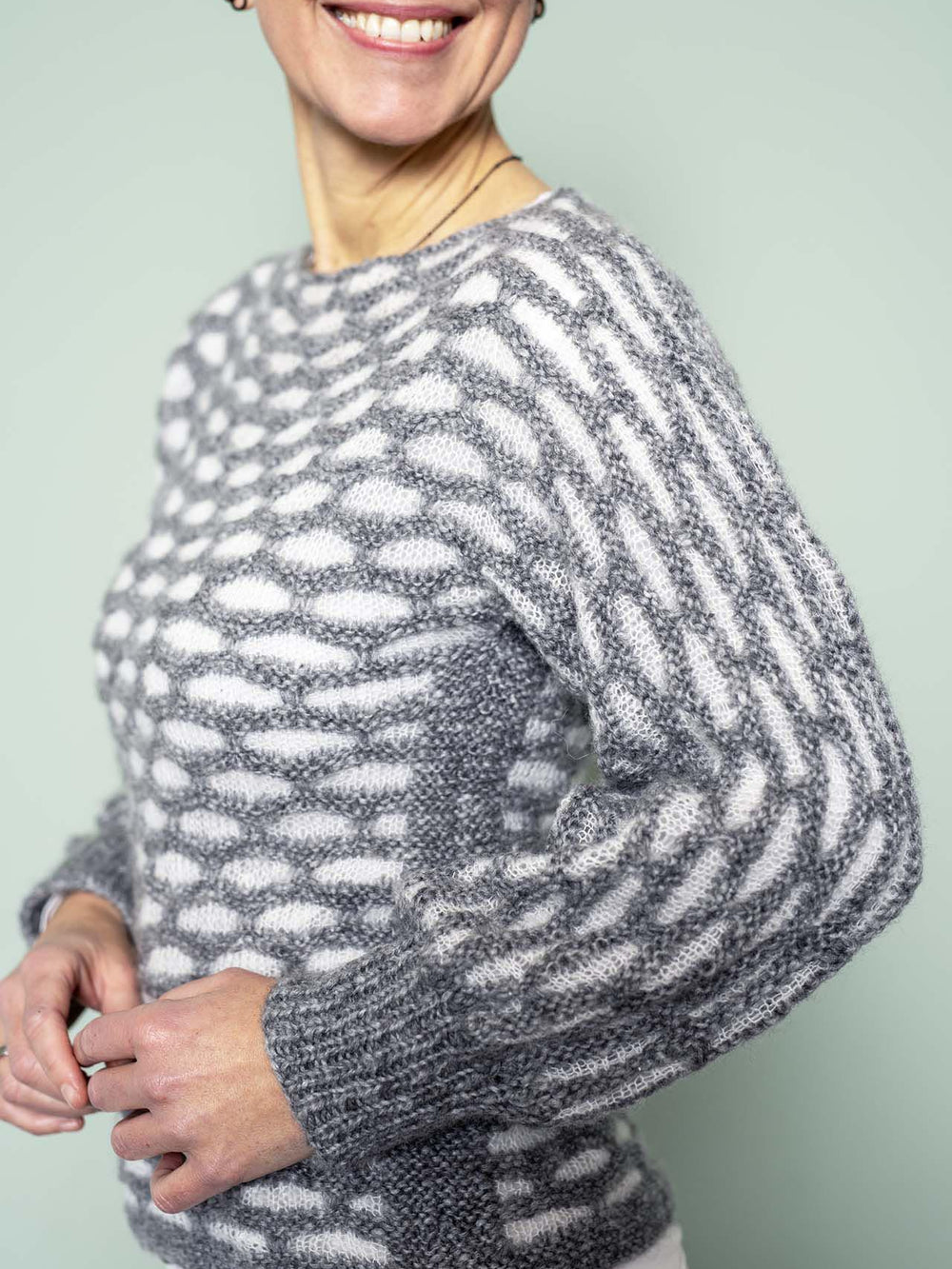Let og luftig sweater, som strikkes i et dekorativt mønster. Sweateren strikkes nedefra og op i vævestrik i to farver, hvilket giver en rigtig flot effekt. Sweateren er designet med bådhals, hvor du nemt selv kan bestemme størrelsen på halsåbningen.