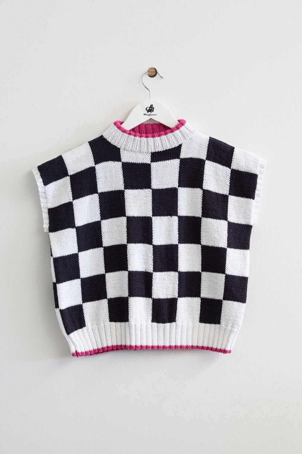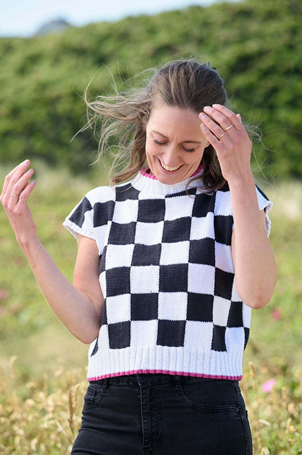 Gambit vest er en strikket sommervest, som er perfekt til årets lune dage. Vesten er strikket nedefra og op med den smarte teknik, som både kendes som intarsiateknik og gobelinstrik, hvor hvert felt strikkes med et separat garnnøgle. Mellem hvert felt snos garnet på bagside, når der skiftes farve. På denne måde undgår man huller, ligesom der heller er nogen ingen løbetråd bag på arbejdet.