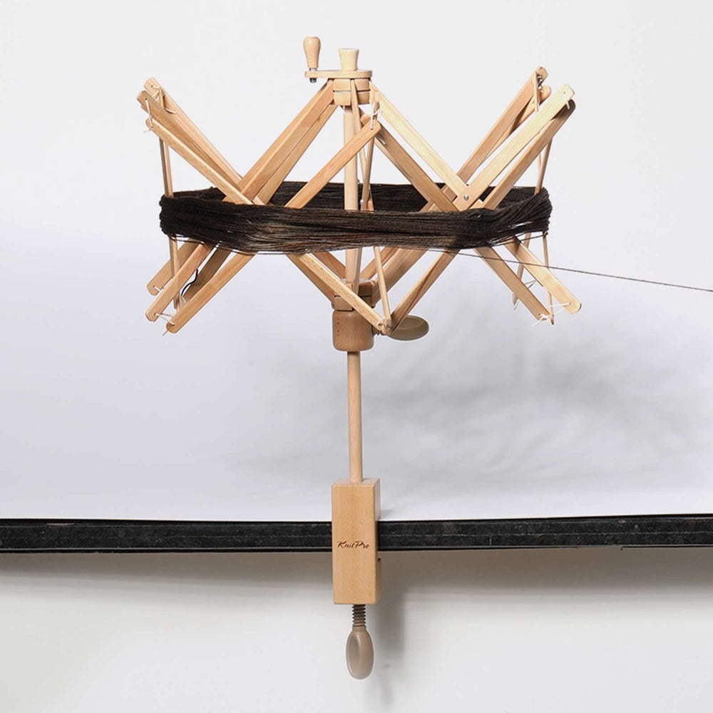 En garnvinde fra KnitPro, som bruges til at opvinde garn, som kommer i store fed. Garnfedet kan vikles op, hvorefter garnet kan spændes rundt om garnvinden. I samarbejde med fx et krydsnøgleapparat kan garnet nu vindes op til et mere praktisk garnnøgle.