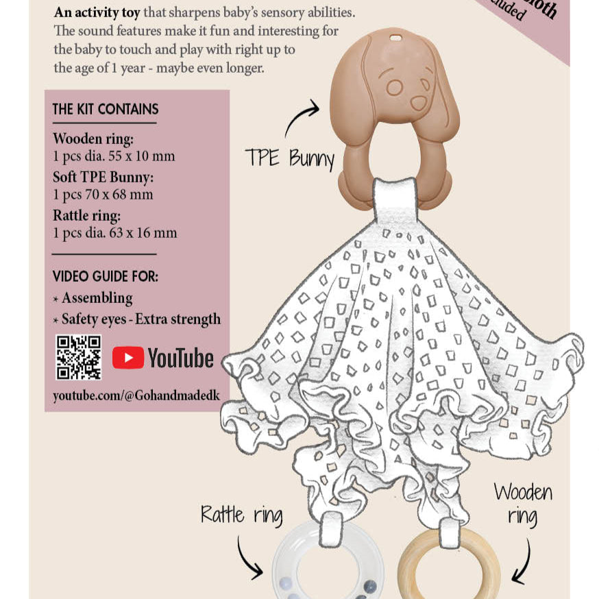 Med sansekittet fra Go handmade får du forskelligt tilbehør, som du skal bruge til at hækle en lækker og blød nusseklud. Den hæklede klud er monteret på blød TPE-kaninfigur, og i bunden er der også en træring og en raslering. Både figuren og ringene er sjove at lege med, da der er både noget blødt og noget hårdt at røre ved, ligesom den ene ring kan rasle (OBS: Husk, at garnet til projektet skal købes separat).