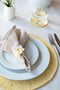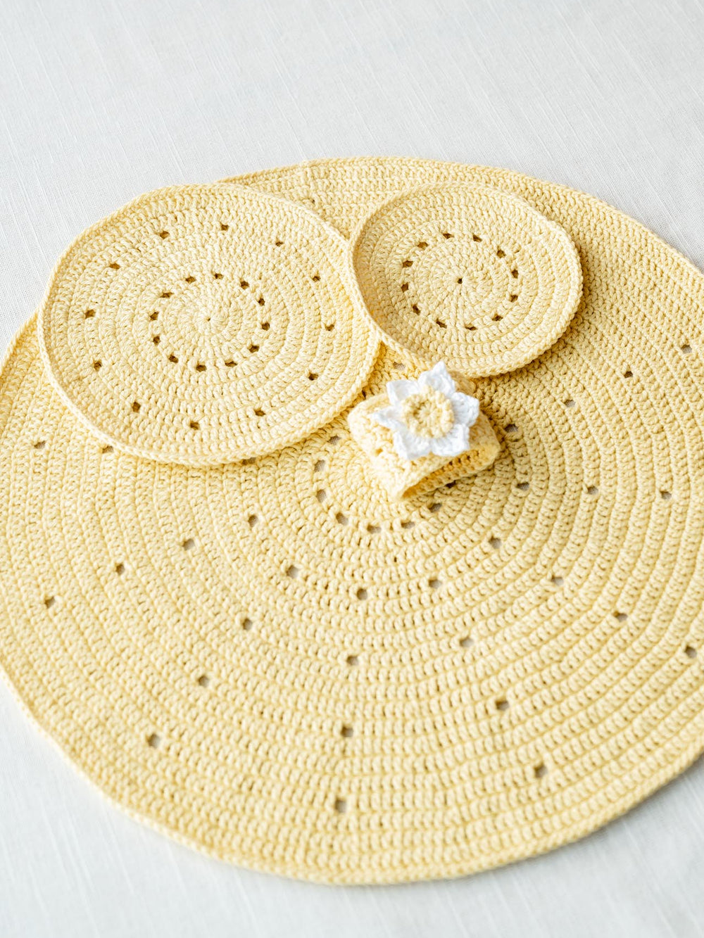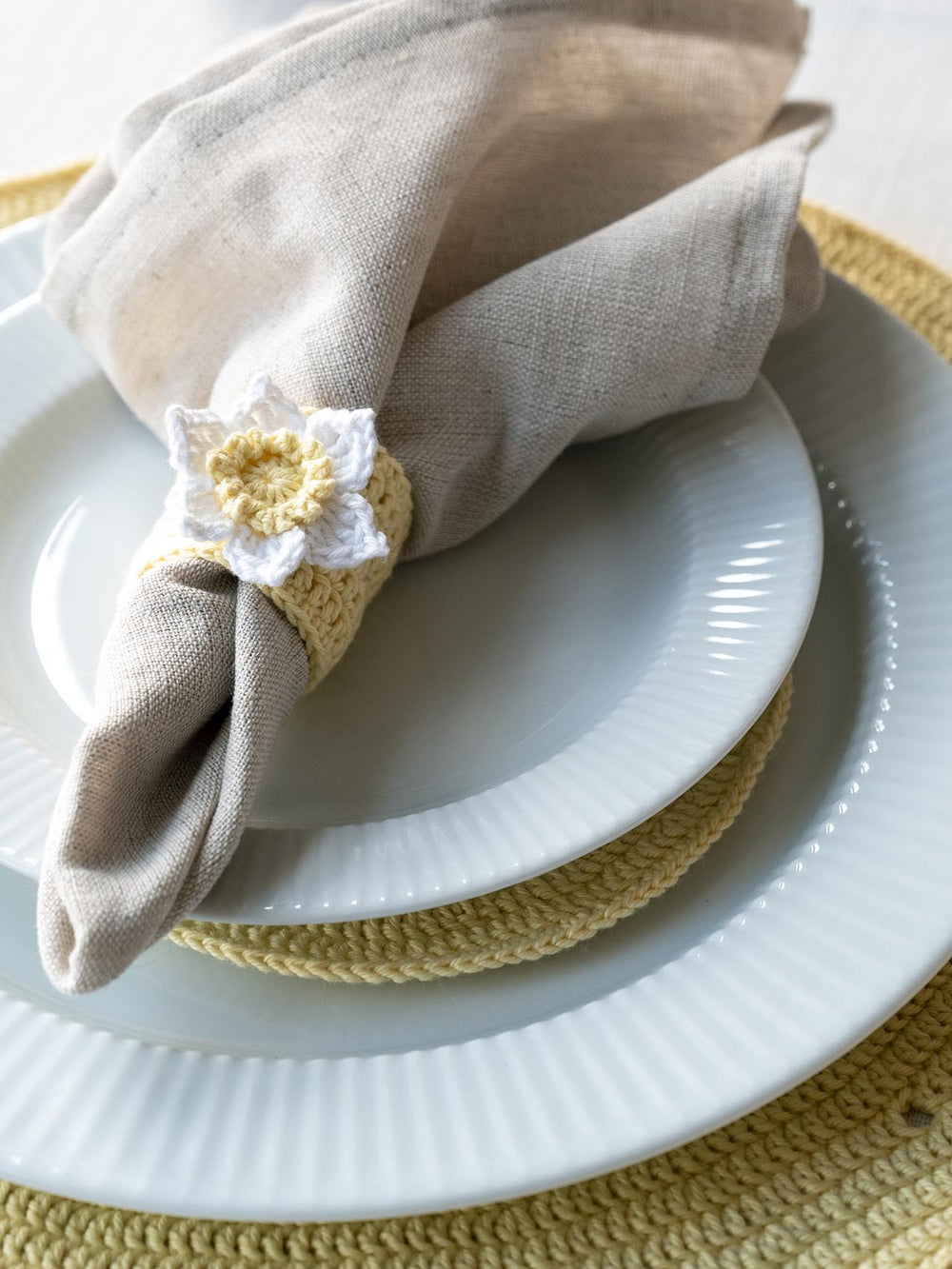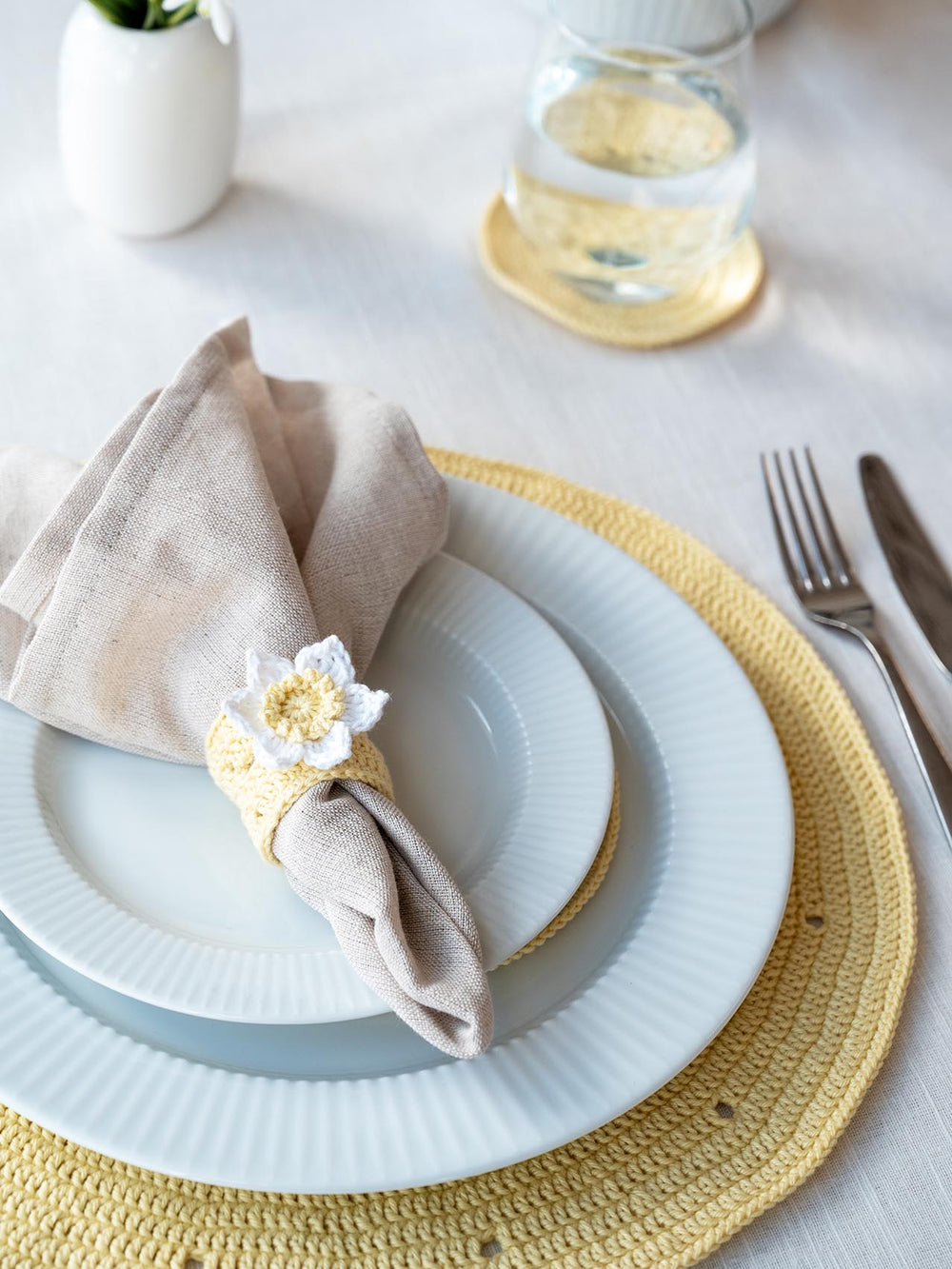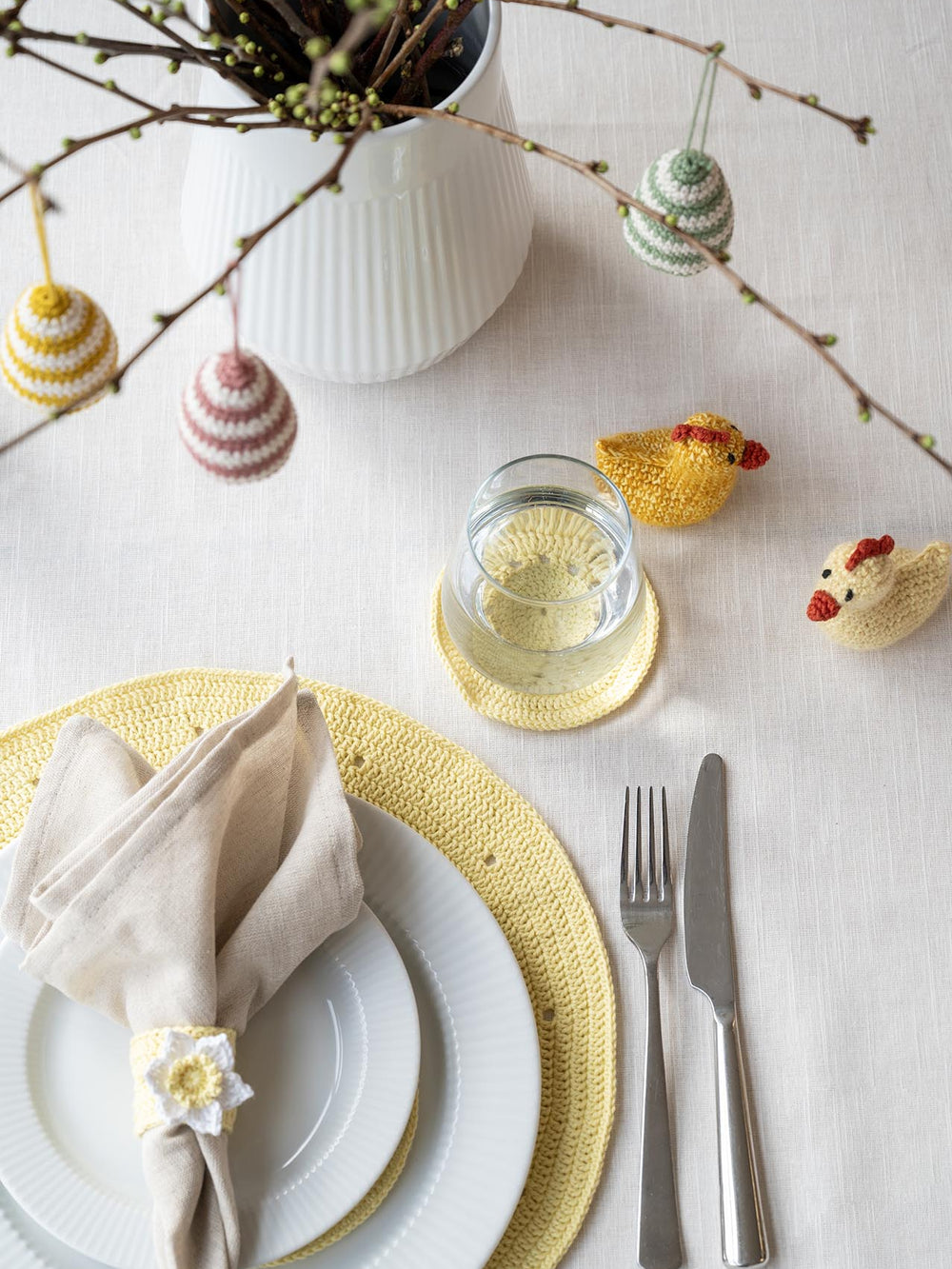 Fine, gule dækkeservietter til at ligge under og mellem tallerknerne og glas på påskebordet samt en gul servietring. Sættet er hæklet i fastmasker og stangmasker i Mayflower Cotton 8/4 i en fin, forårsgul farve. De tre servietter hækles rundt, mens servietringen hækles frem og tilbage i hulmønster. Til servietringen er der i opskriften også en vejledning til en blomst, og du kan derfor selv bestemme, om servietringen skal være enkel eller mere pyntet.