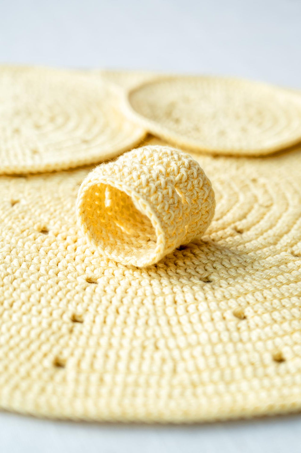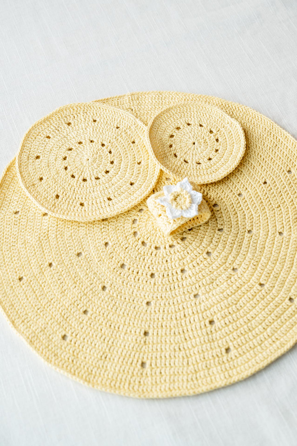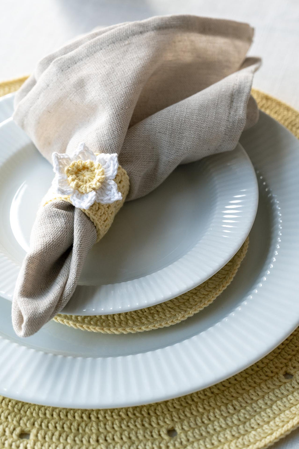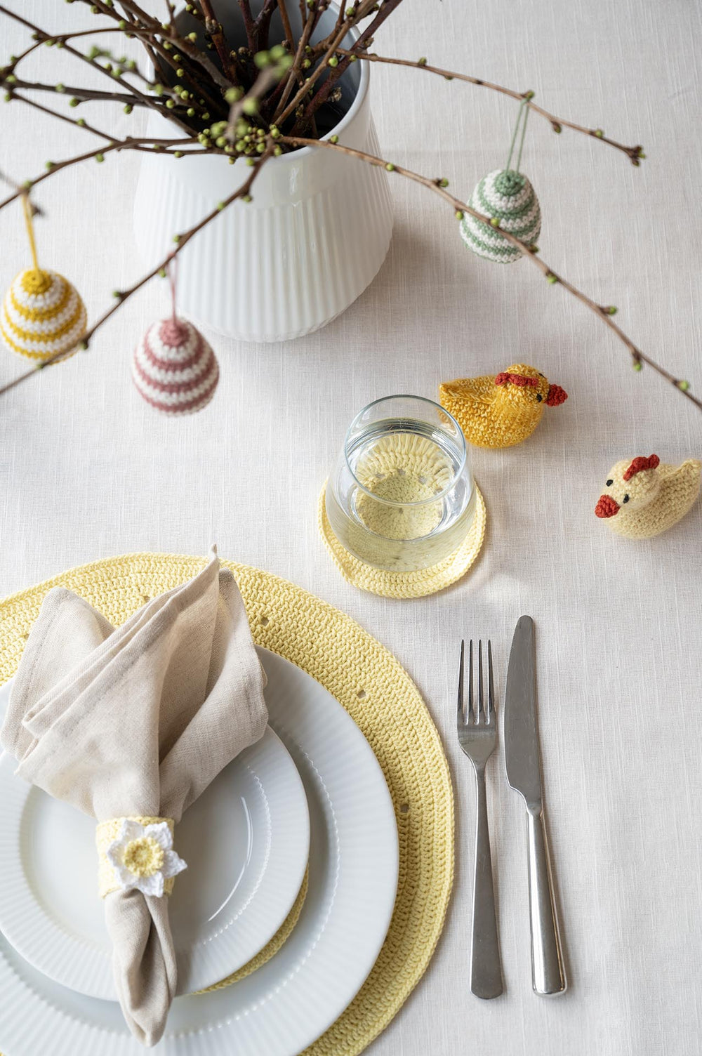 Fine, gule dækkeservietter til at ligge under og mellem tallerknerne og glas på påskebordet samt en gul servietring. Sættet er hæklet i fastmasker og stangmasker i Mayflower Cotton 8/4 i en fin, forårsgul farve. De tre servietter hækles rundt, mens servietringen hækles frem og tilbage i hulmønster. Til servietringen er der i opskriften også en vejledning til en blomst, og du kan derfor selv bestemme, om servietringen skal være enkel eller mere pyntet.