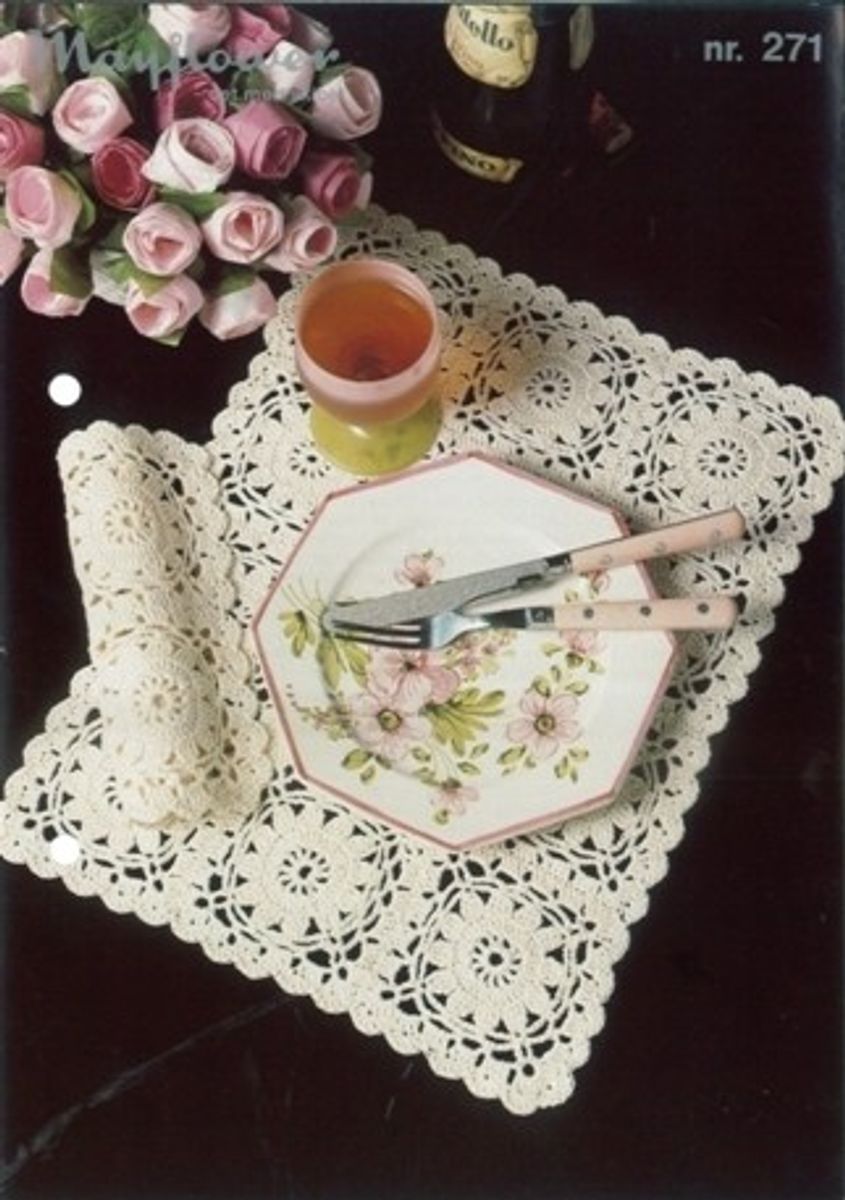 Romantisk og yndig hæklet dækkeserviet og mundserviet i Mayflower Cotton 8/4. Så yndigt og med en buket roser er der dækket op til en romantisk bord for 2. Eller flere. De smukke blomster der er hæklet gør en helhed over det hele.