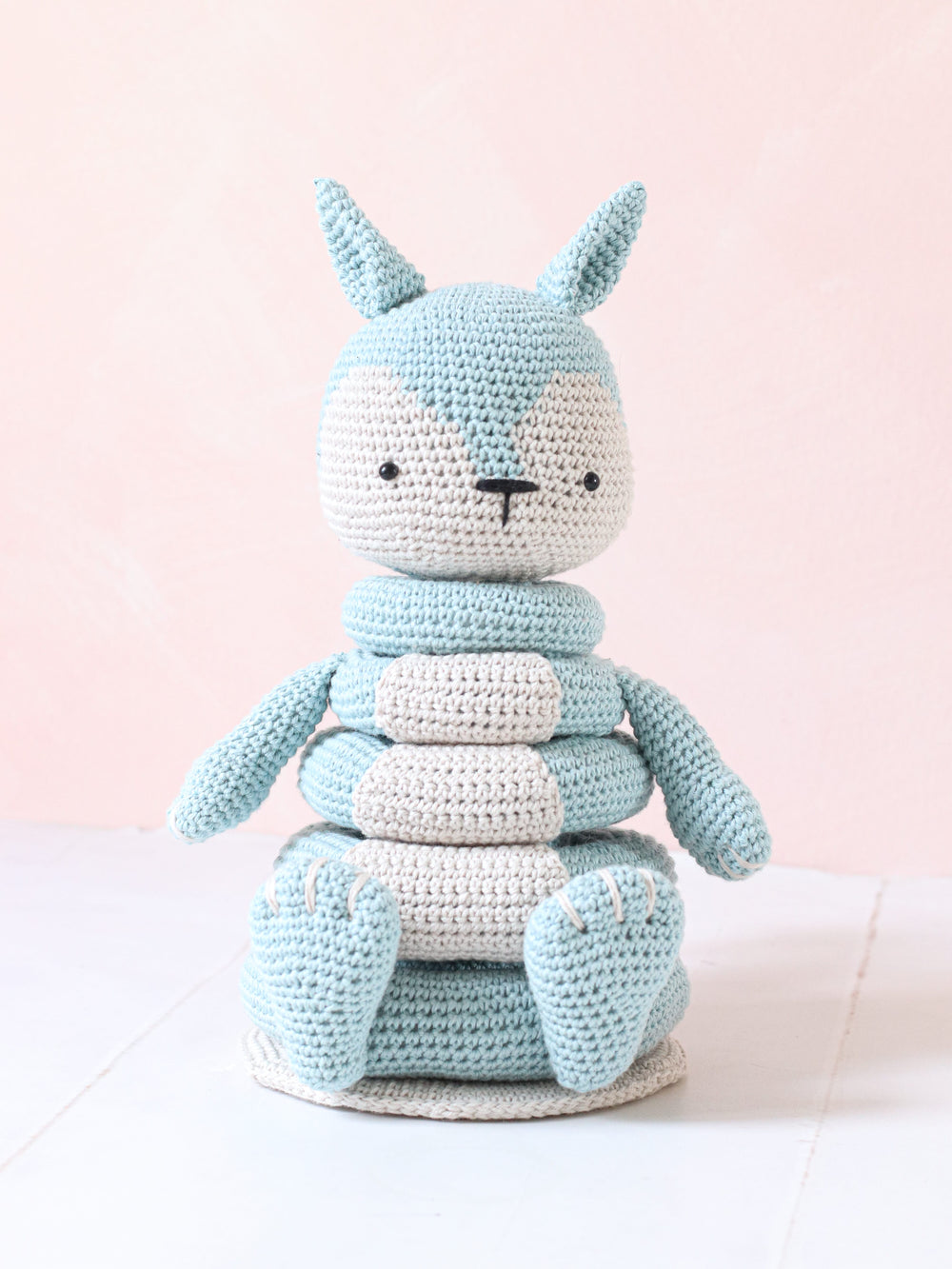 Hæklet egern stabeltårn består af et tårn (midterpind), 5 ringe og et hoved.