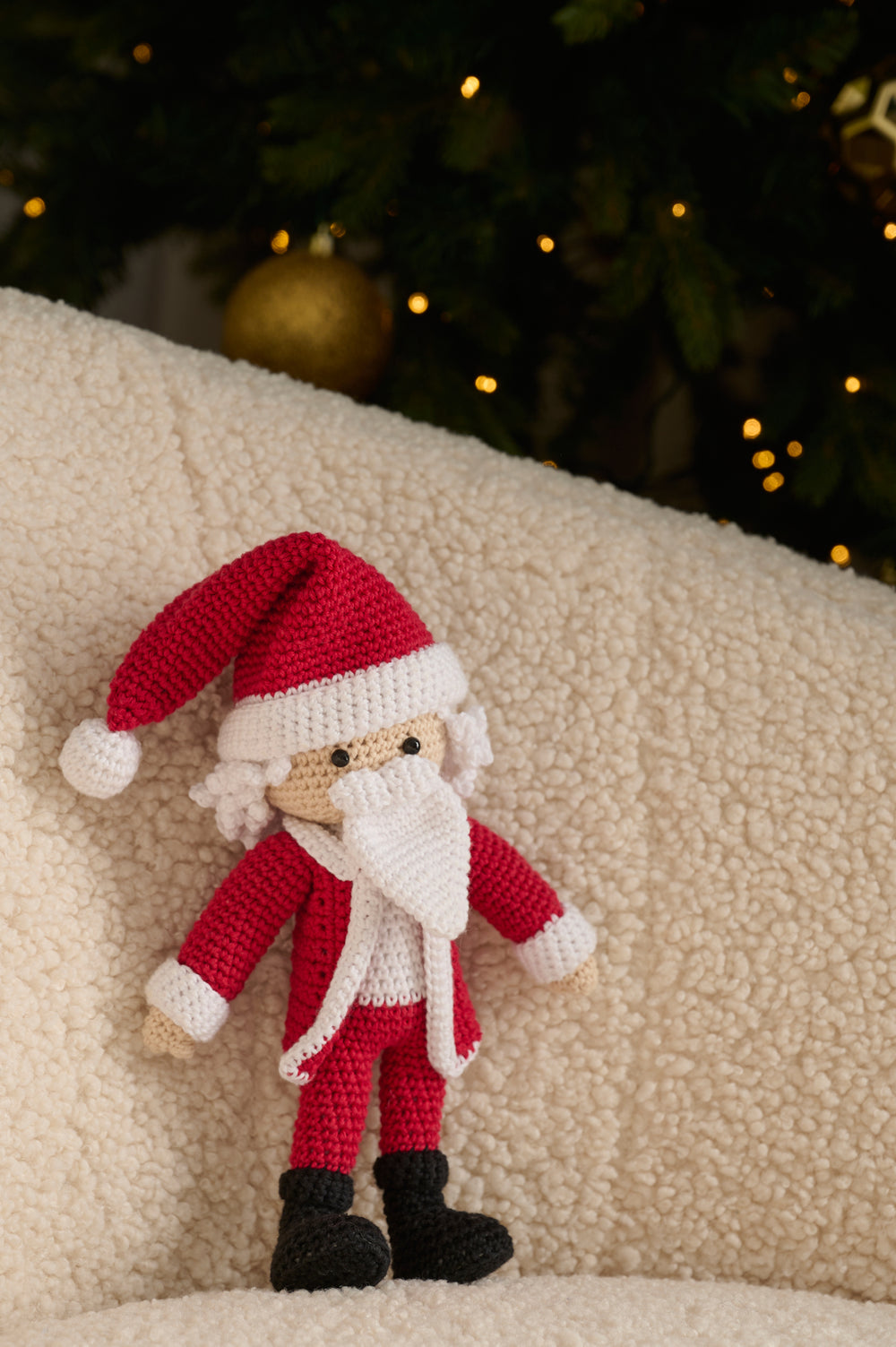 En søde julemand med lang skæg og tøj. Julemanden er hæklet i Mayflower Cotton 8/4, som er et klassisk 8/4-bomuldsgarn i høj kvalitet. Perfekt til hæklede designs som dette.
