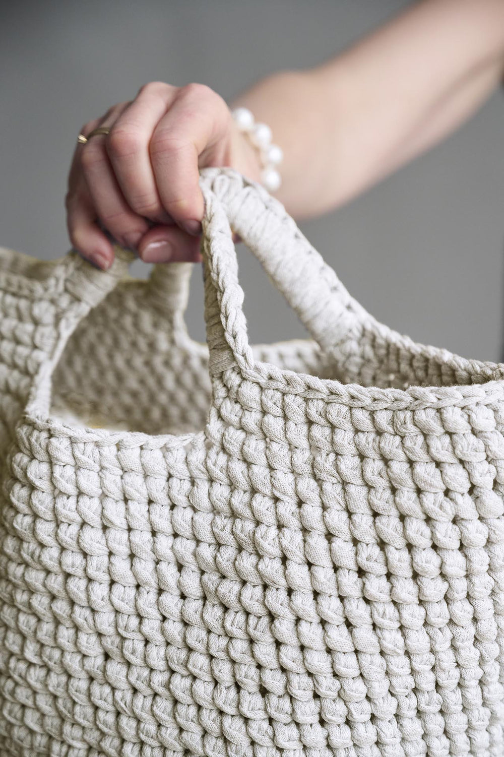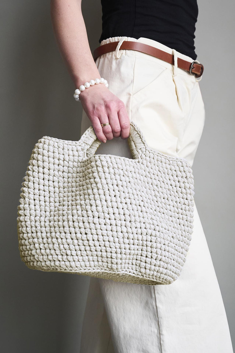 Tasken er hæklet i Mayflower Ribbon. Et elastisk båndgarn i en lækker bomuldsblanding, som er let at arbejde med. Den findes i mange dejlige farver, og skulle tasken få en plet, kan den vaskes i maskine ved 40 grader.