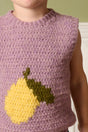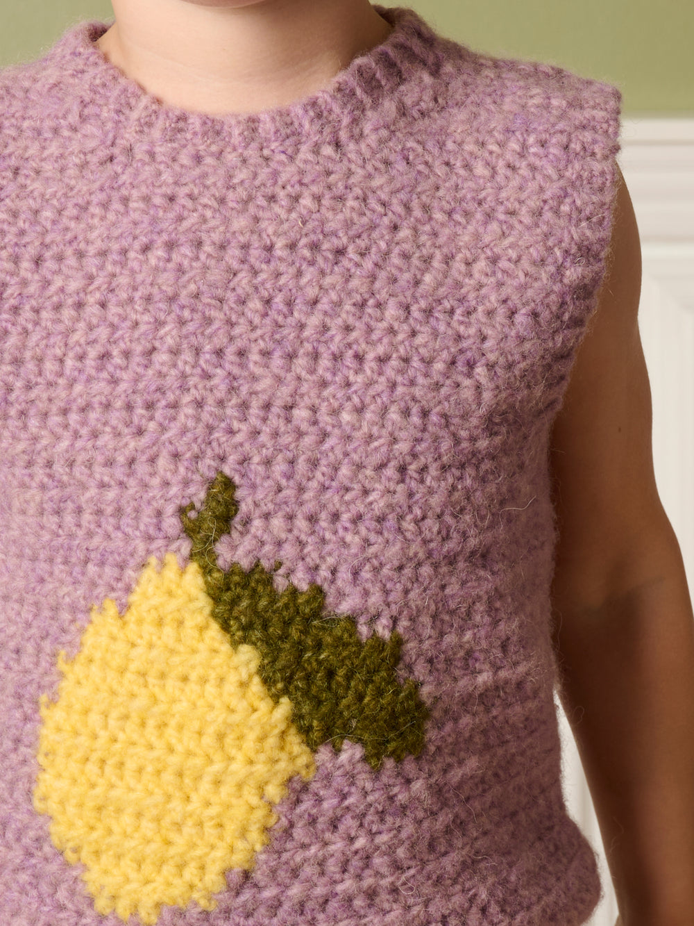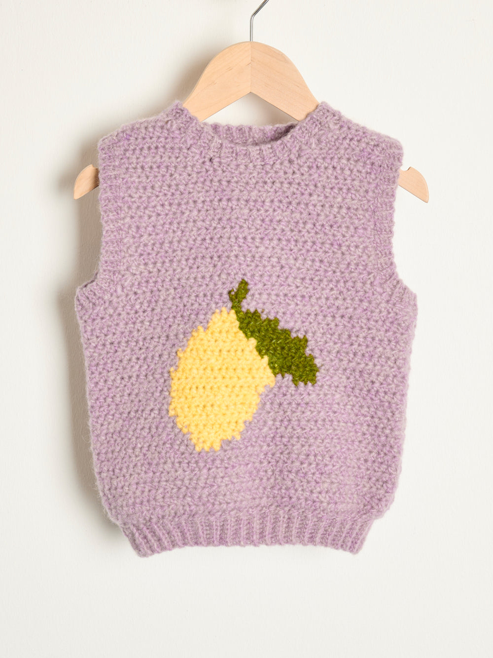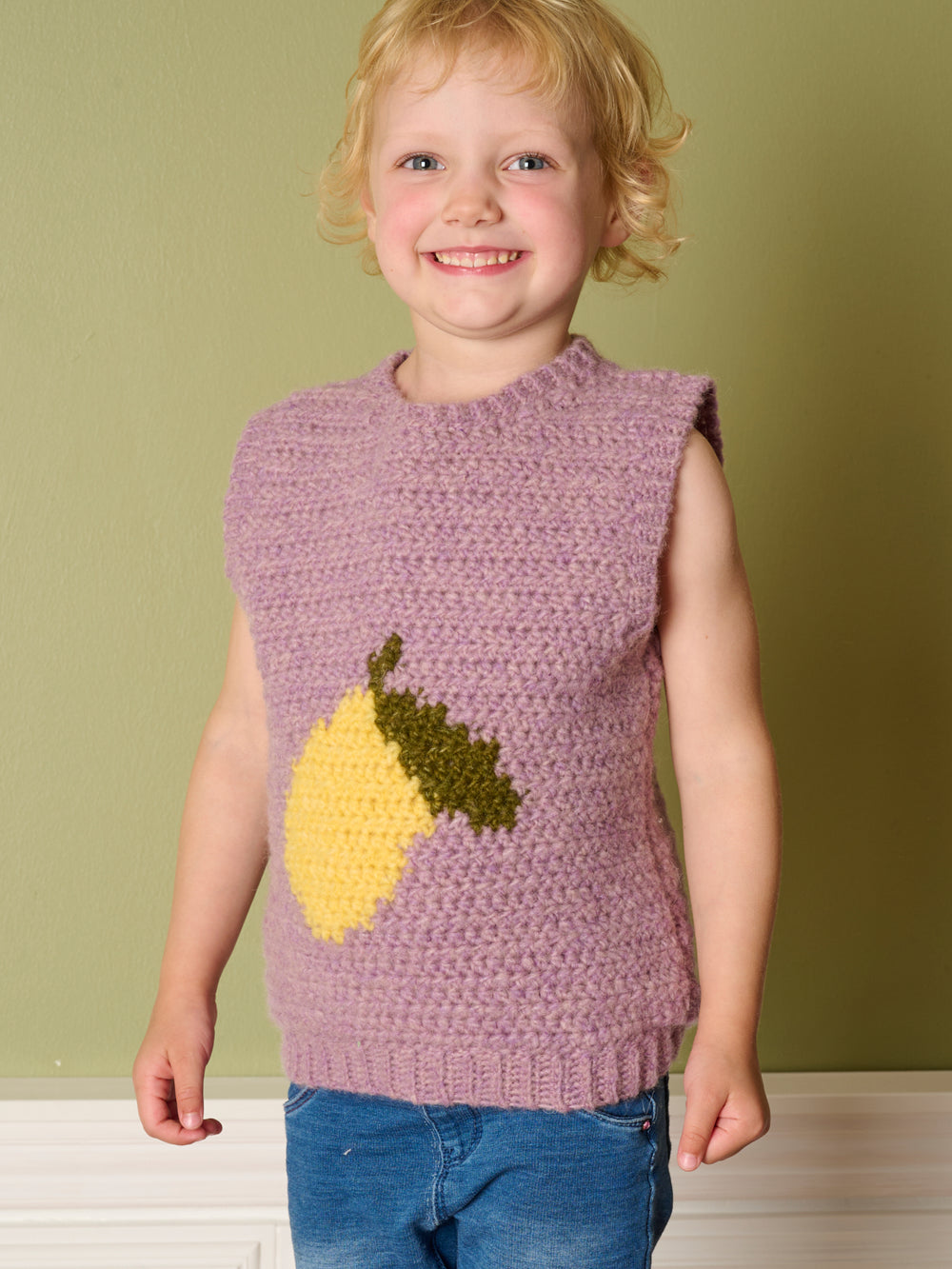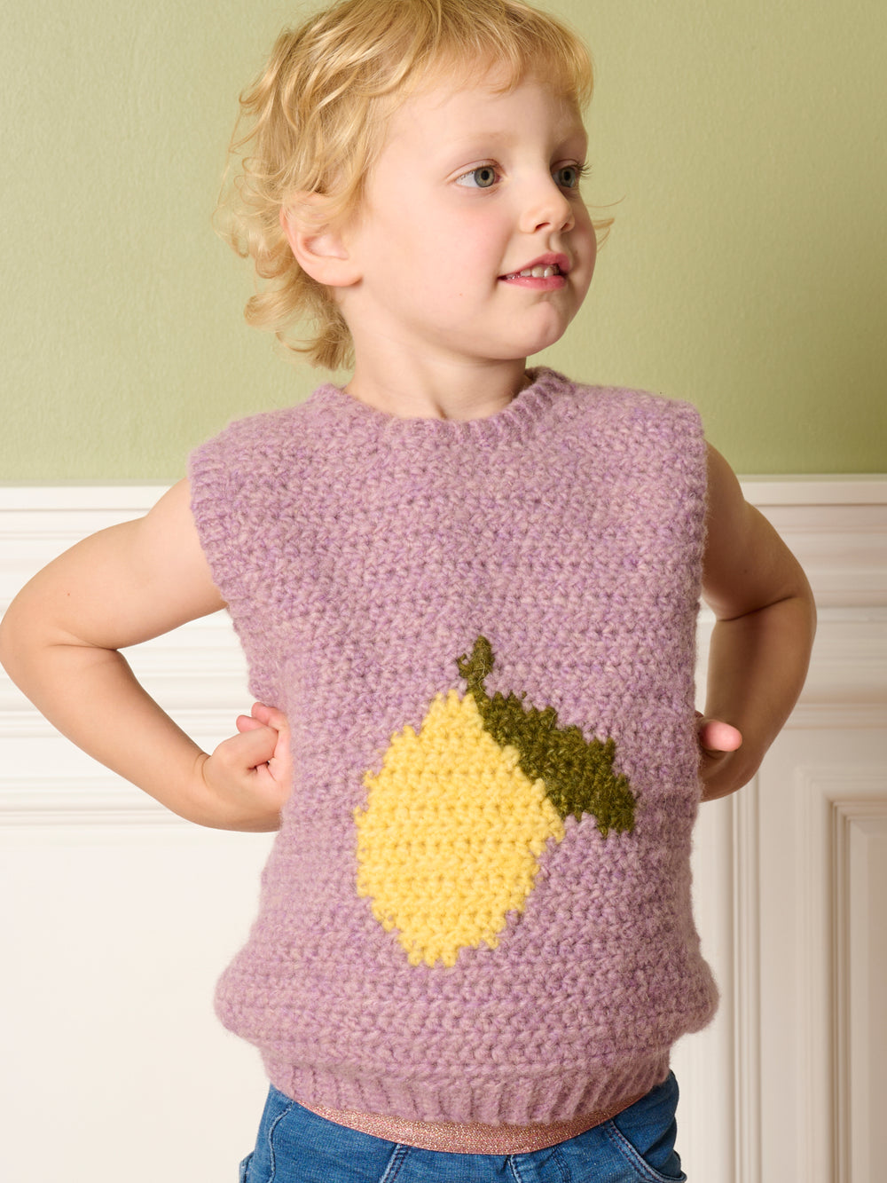 Hæklet slipover, som har en citron på maven. Slipoveren hækles derfor med flere farver og tilmed på en tyk nål 8 mm, så det tager derfor ikke så lang tid at hækle designet.