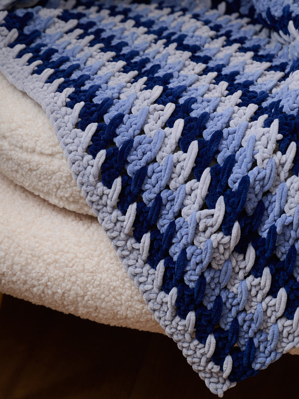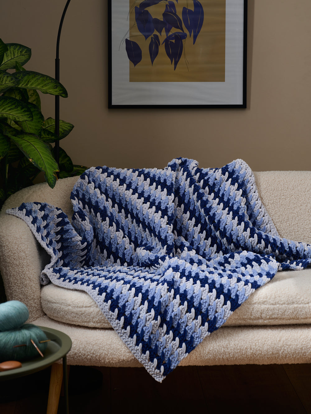 Hæklet slumretæppe i Mayflower Anyday Comfy. Slumretæppet er hæklet i judith-masker, som er et smukt, tekstureret mønster, der skabes ved at skifte mellem hvor stangmaskerne hækles.