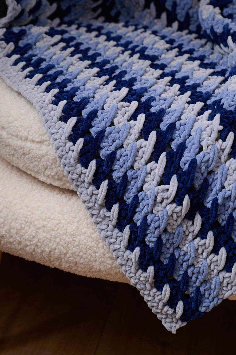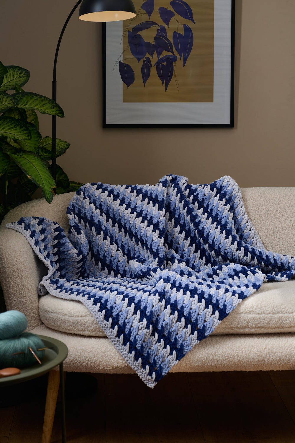 Hæklet slumretæppe i Mayflower Anyday Comfy. Slumretæppet er hæklet i judith-masker, som er et smukt, tekstureret mønster, der skabes ved at skifte mellem hvor stangmaskerne hækles.