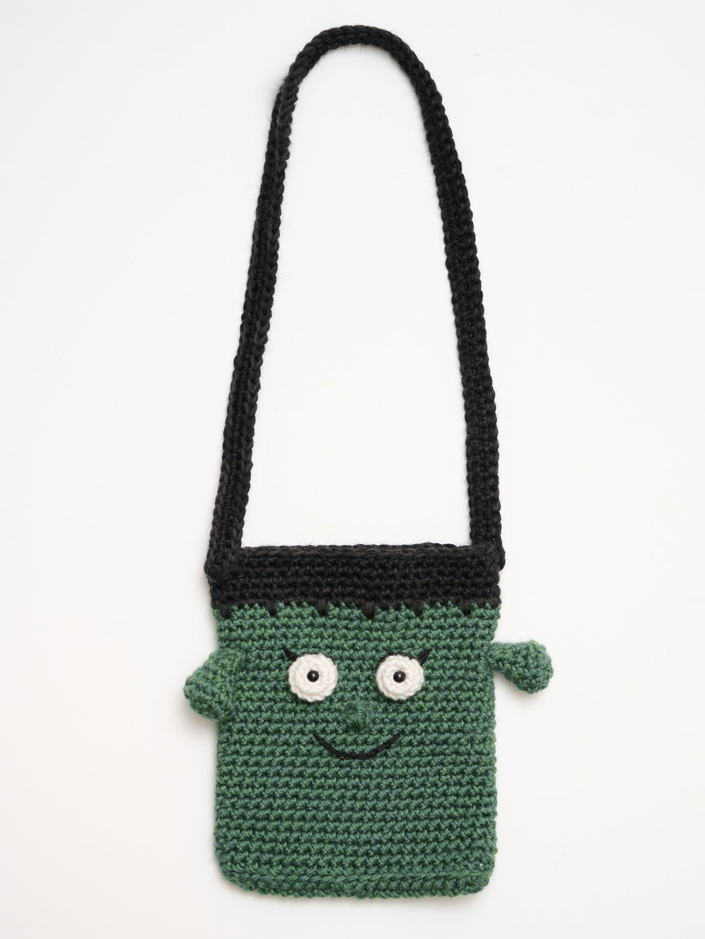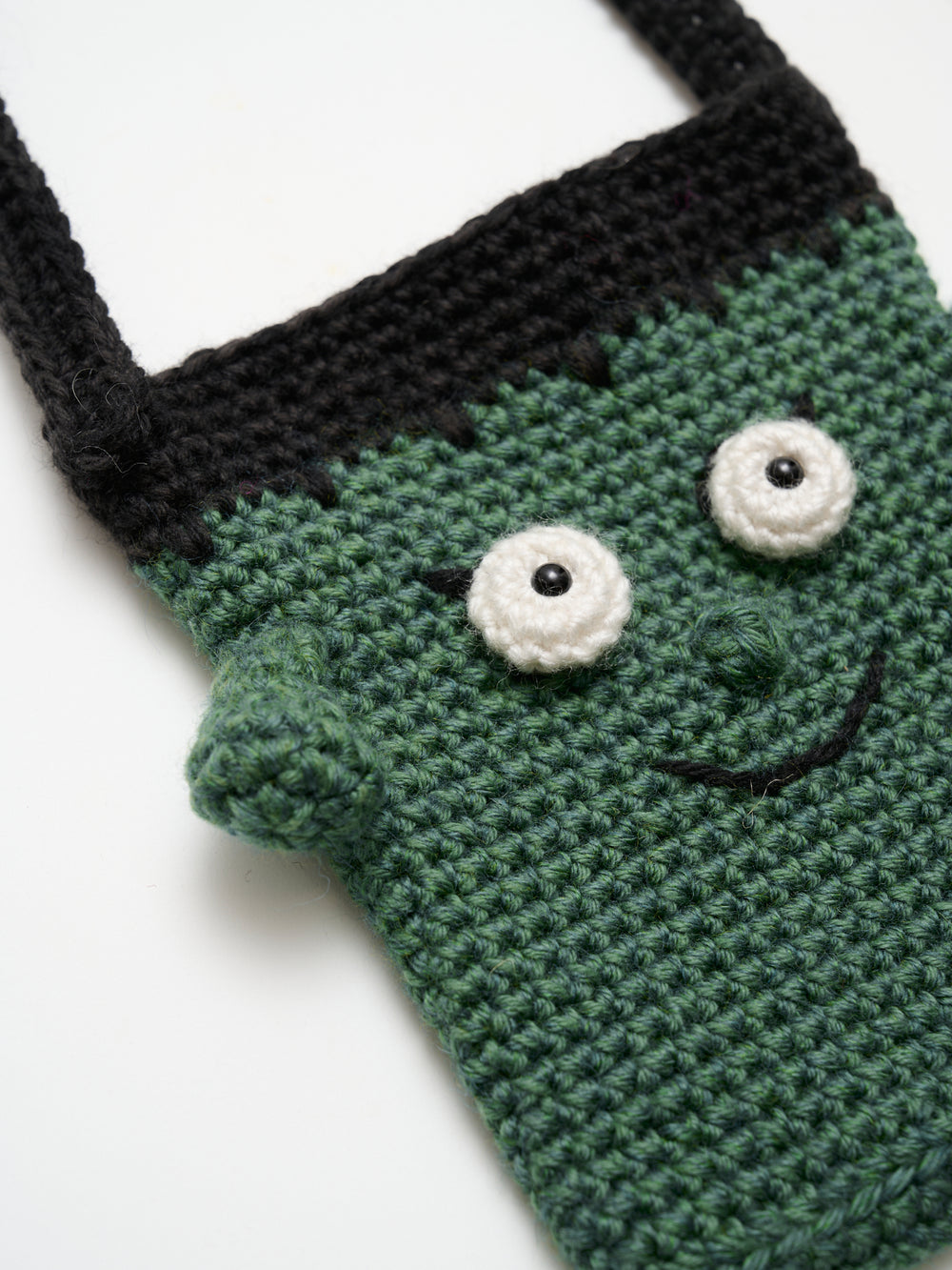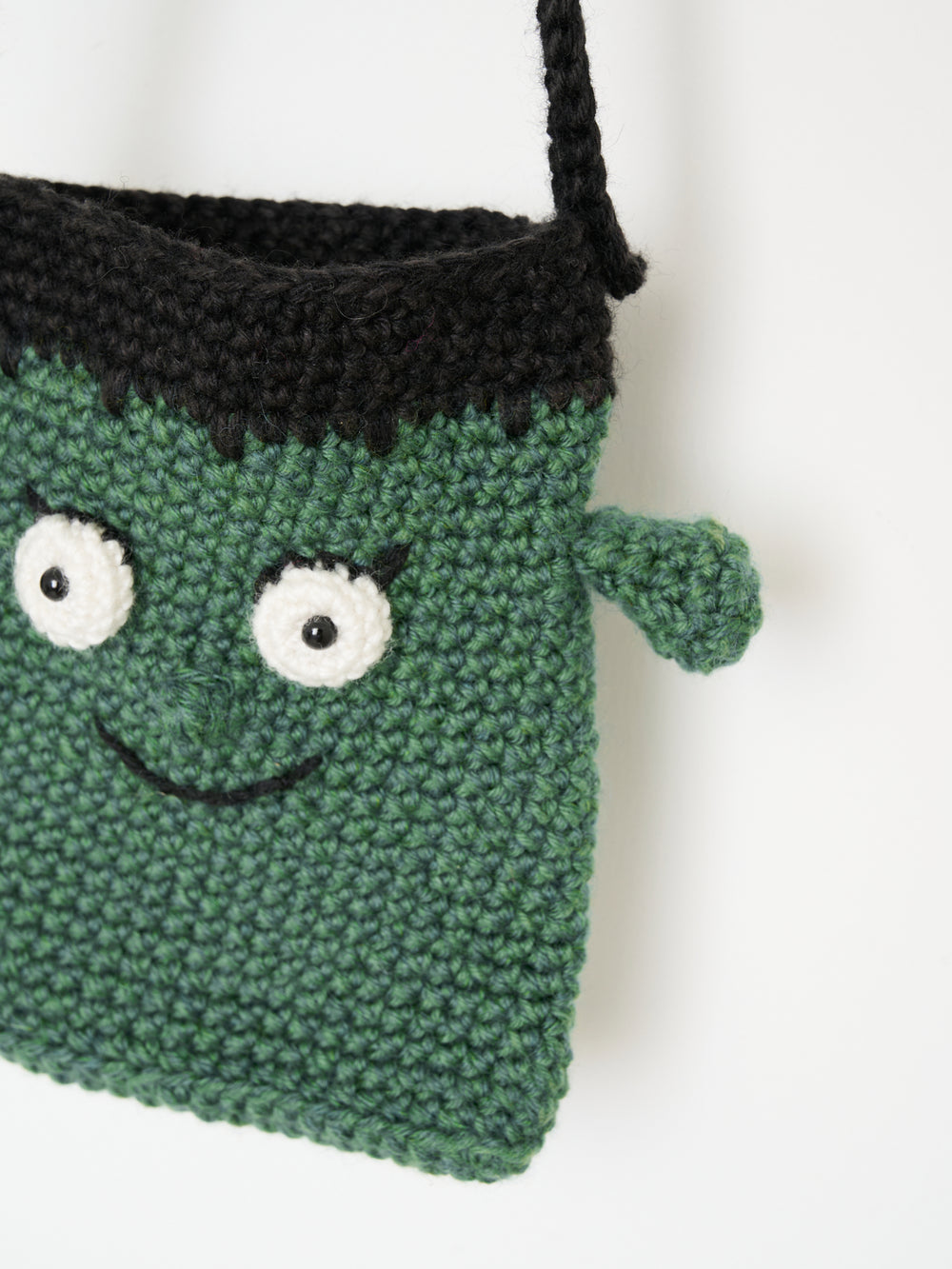 En hæklet Halloween-skuldertaske der er ideel til "Trick or Treat" og andre festlige lejligheder. Tasken er hæklet med to tråde for at opnå en fast og tæt struktur, som gør tasken robust og holdbar. Den er designet med dekorative horn, mund, næse og øjne, som giver den personlighed.