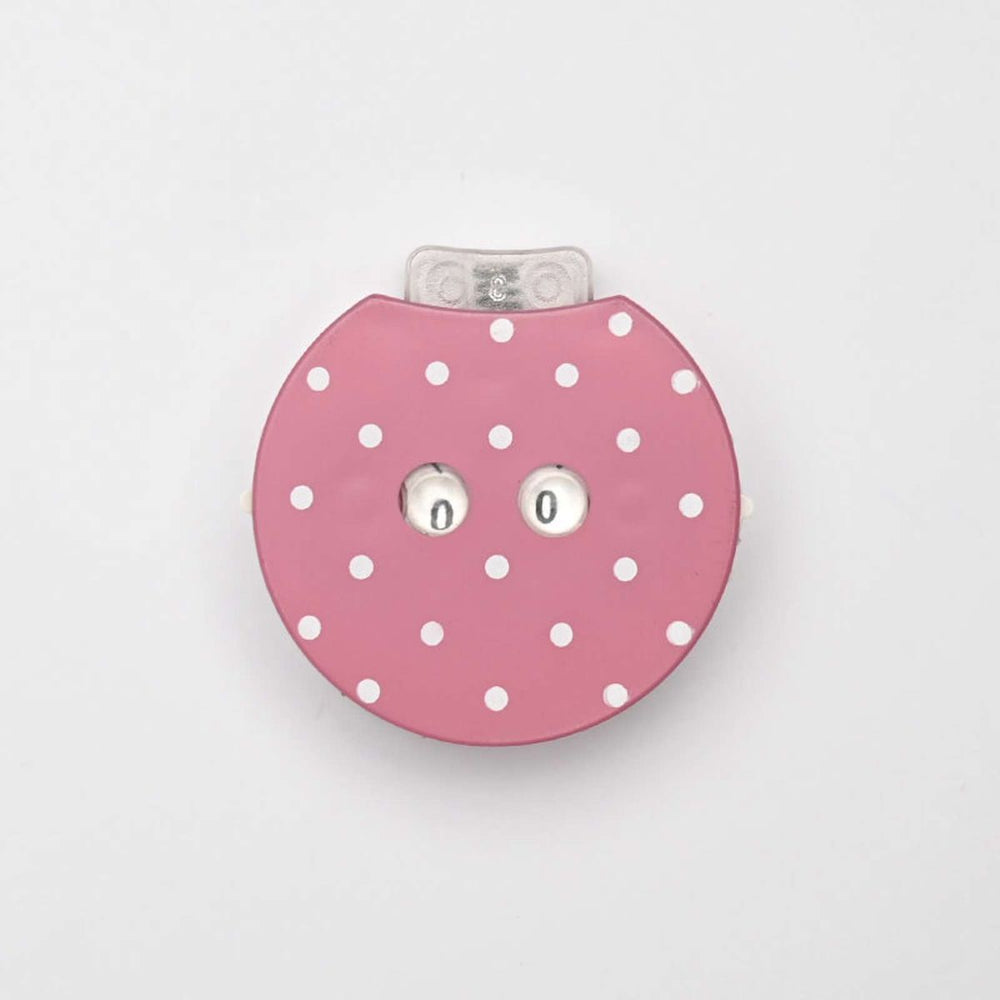 Omgangstæller fra KnitPro, som hjælper dig med at holde styr på, hvor langt du er kommet med dit strikke- eller hæklearbejde. Omgangene, pindene eller rækkerne skifter ved at trykke i toppen. Omgangstælleren kommer i en fin lyserød farve med hvide prikker.